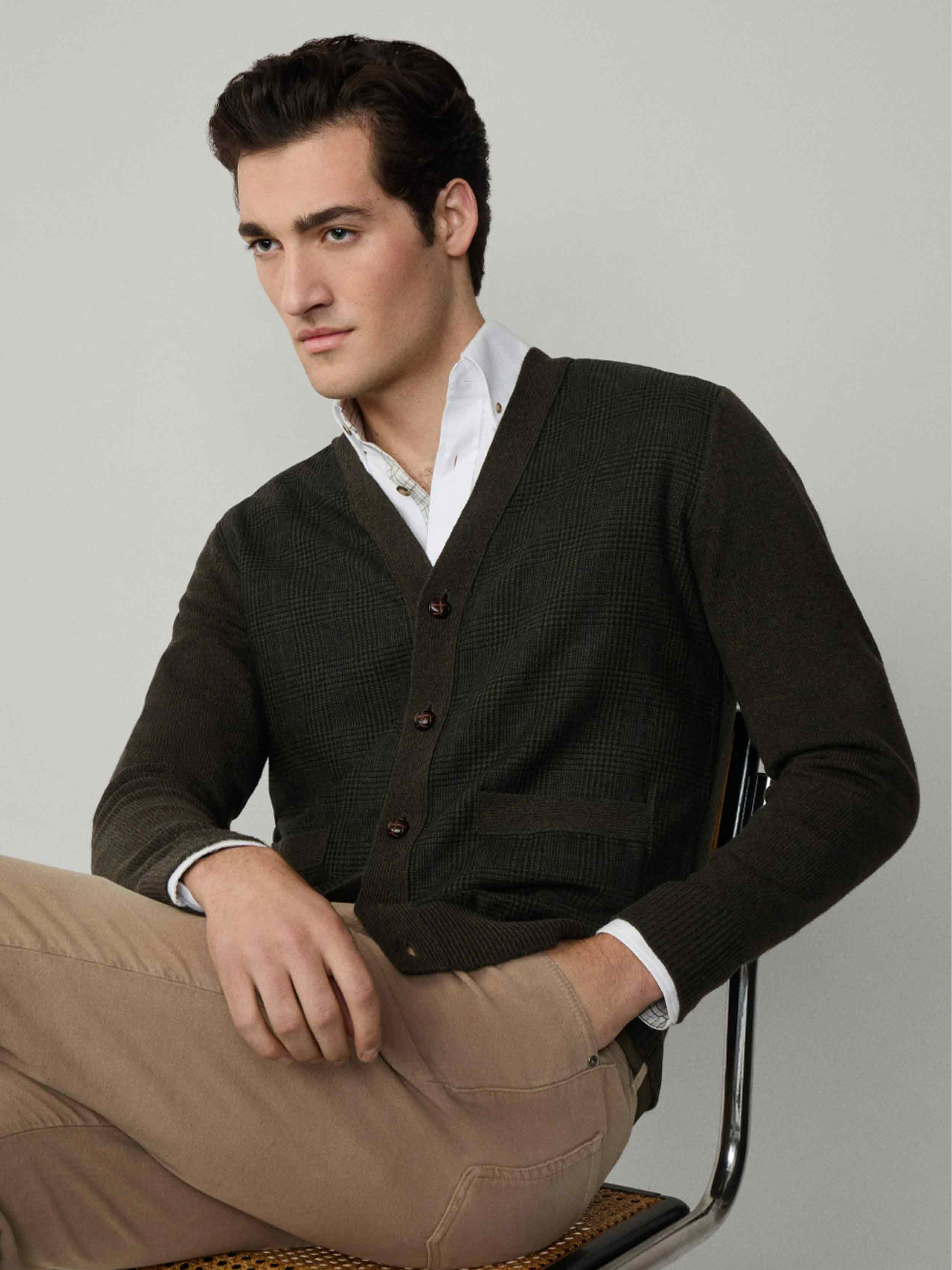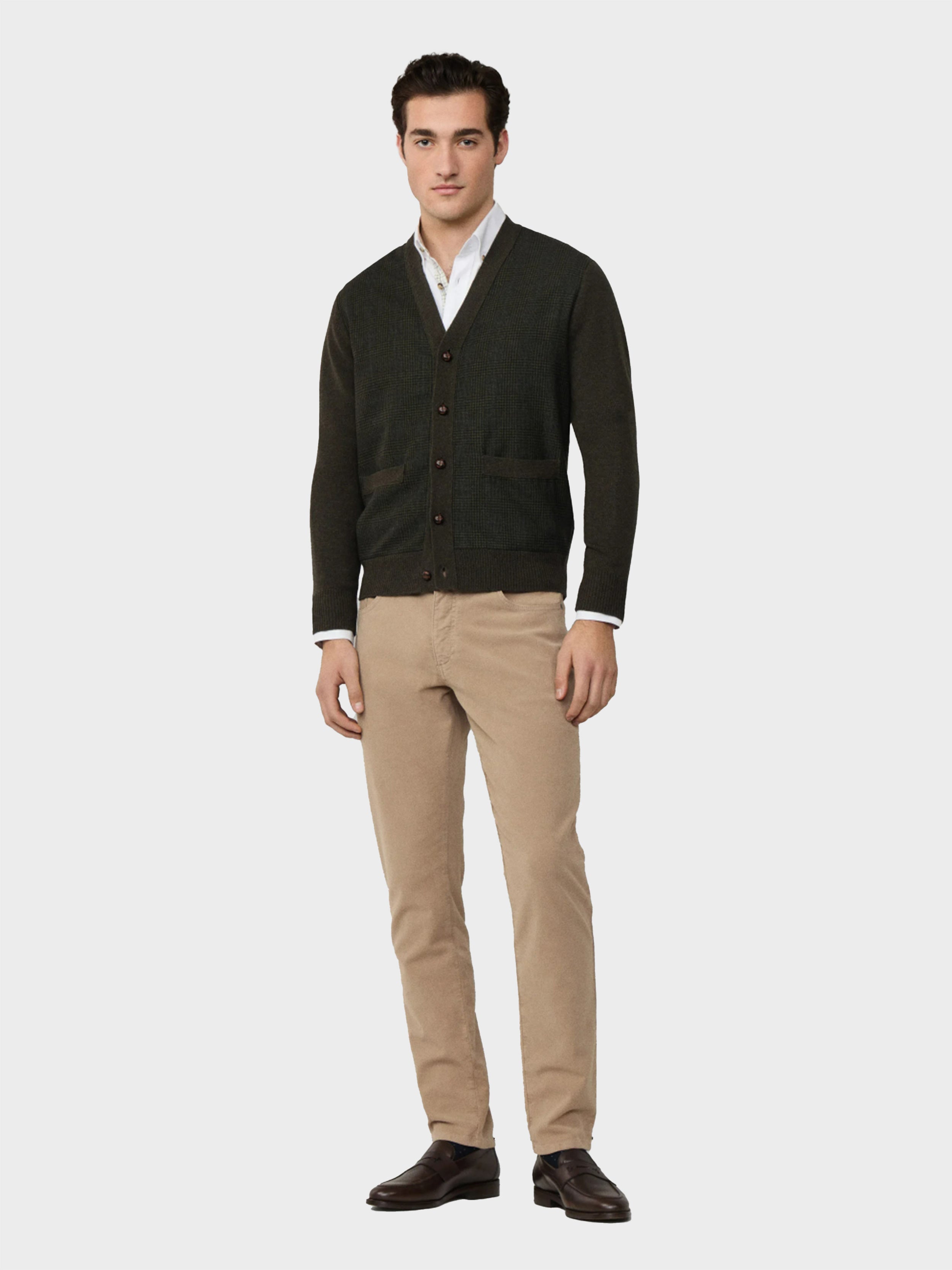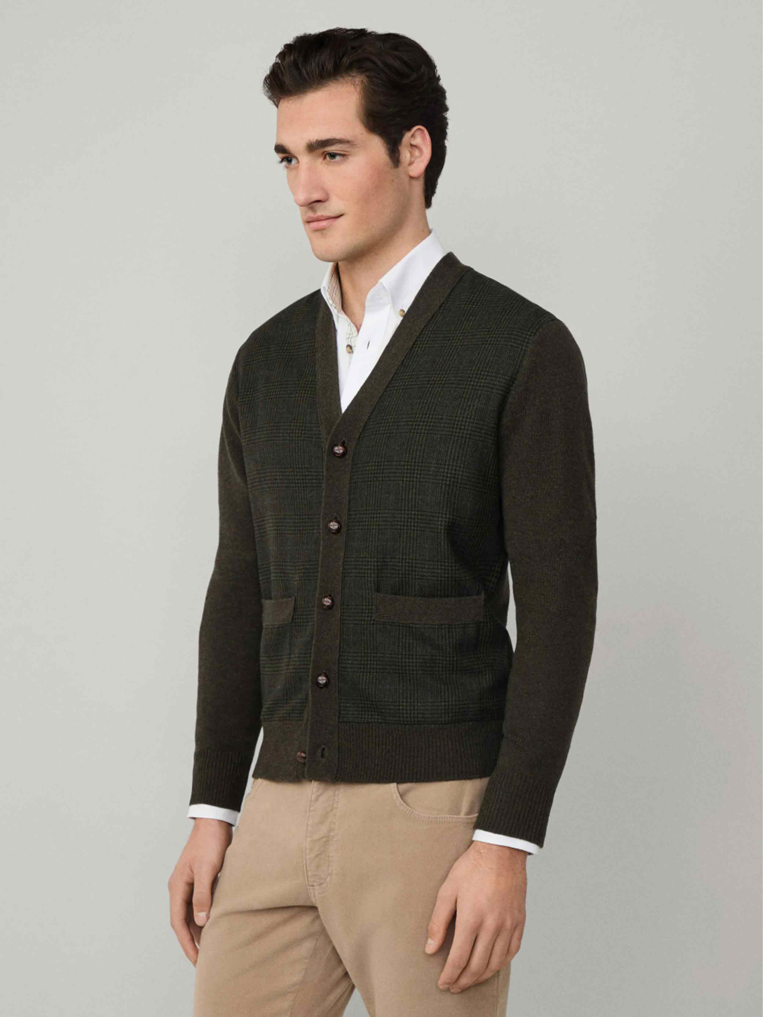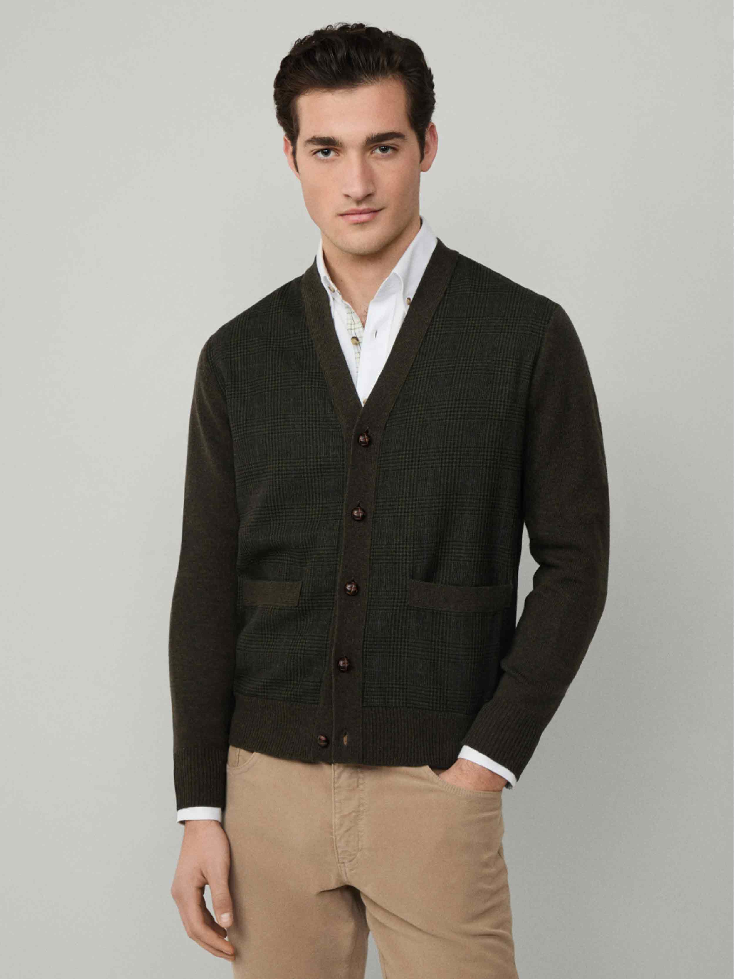 • - Hackett London - Regular fit - Prince of Wales check design in extra fine wool - Fully fashioned with ribbed trims and knitted front pockets - Finished with dark brown football buttons