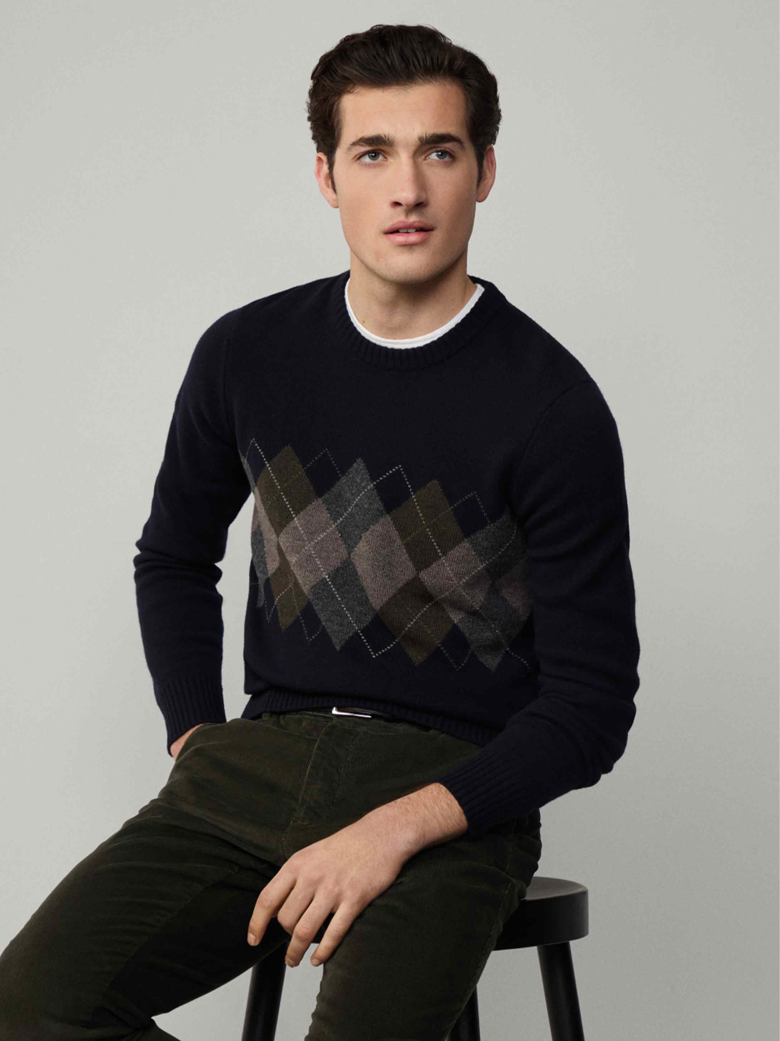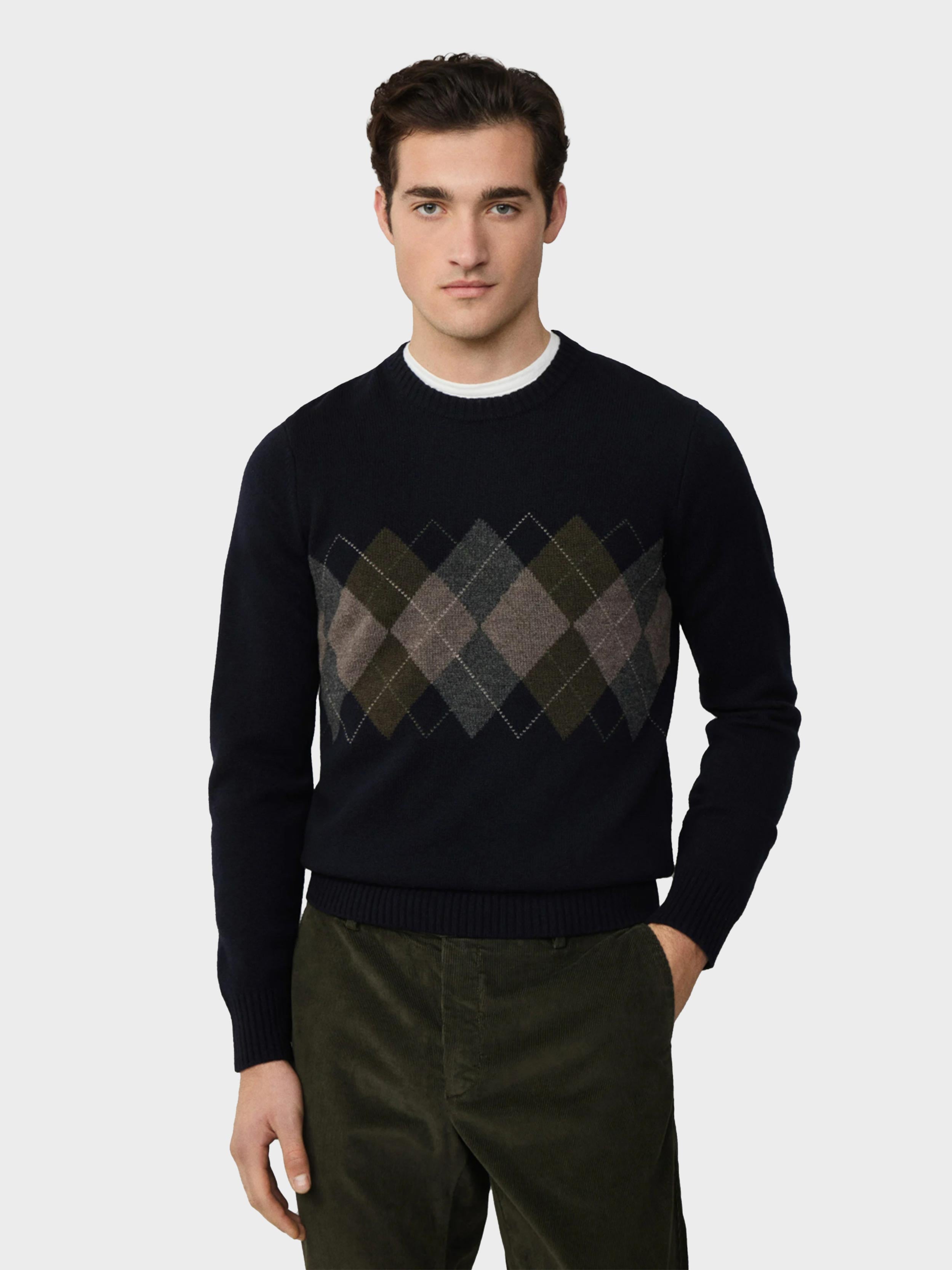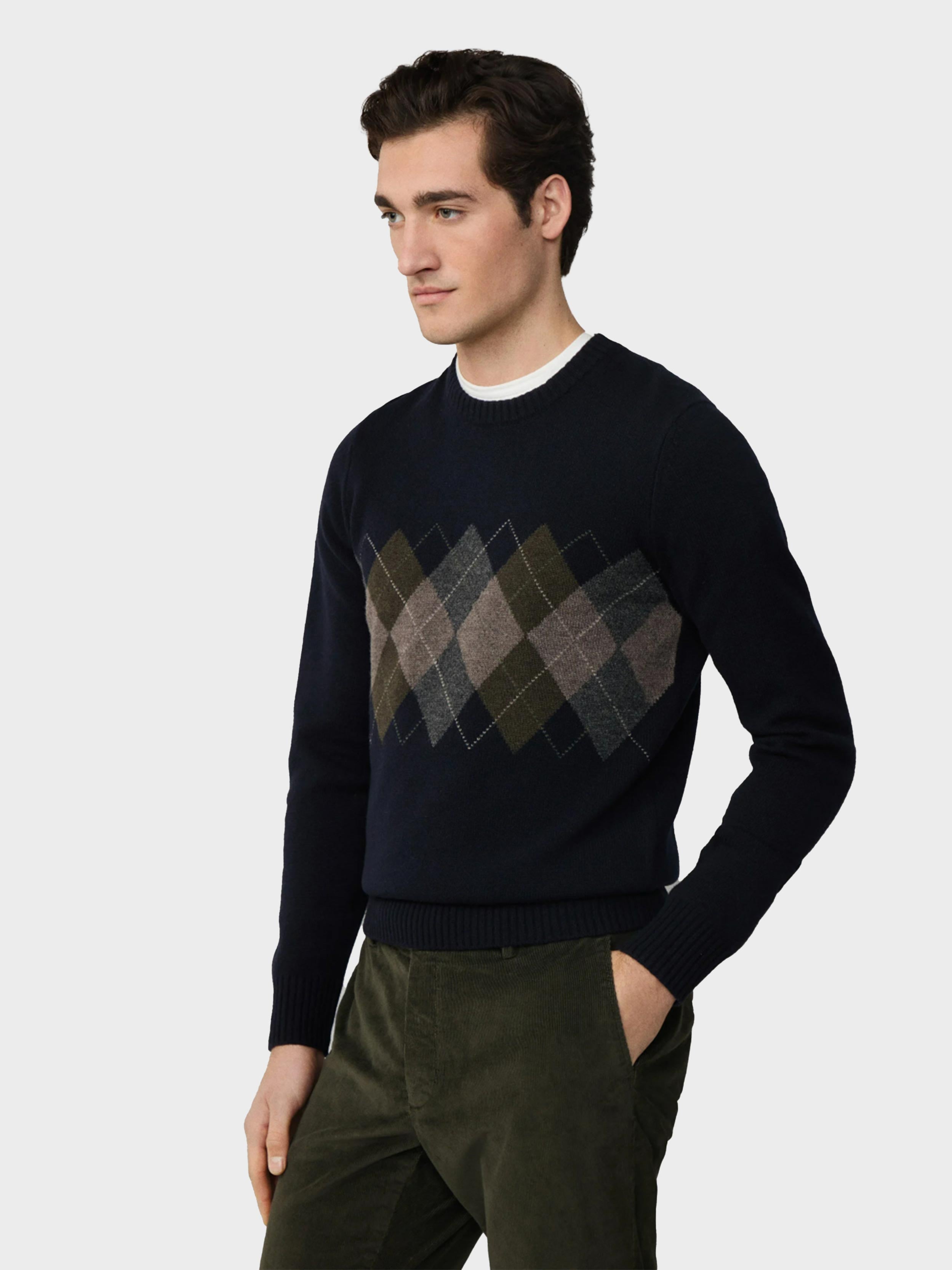 • - Hackett London - Regular fit - Classic crew neck design in extra fine wool - Features a traditional argyle pattern across the chest - Completed with ribbed neck, cuffs and hem