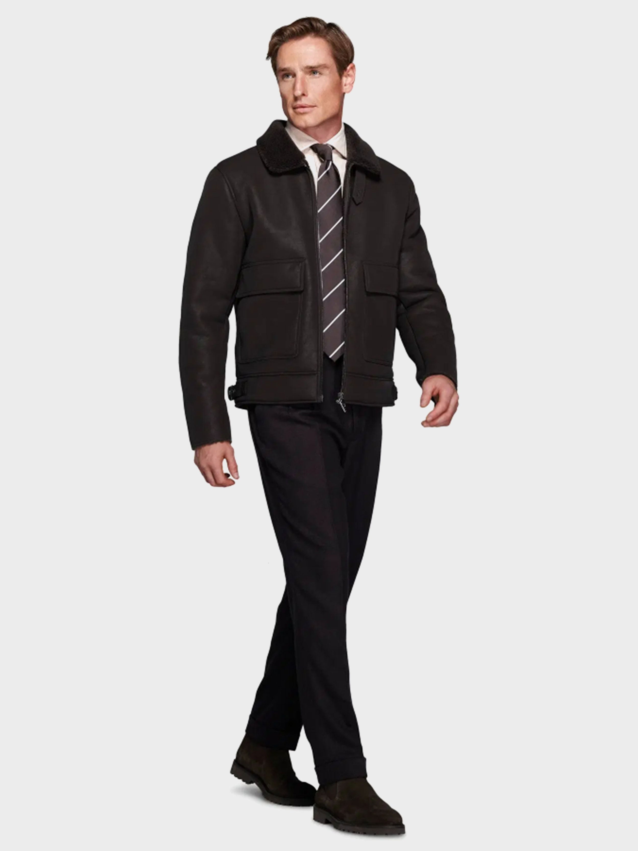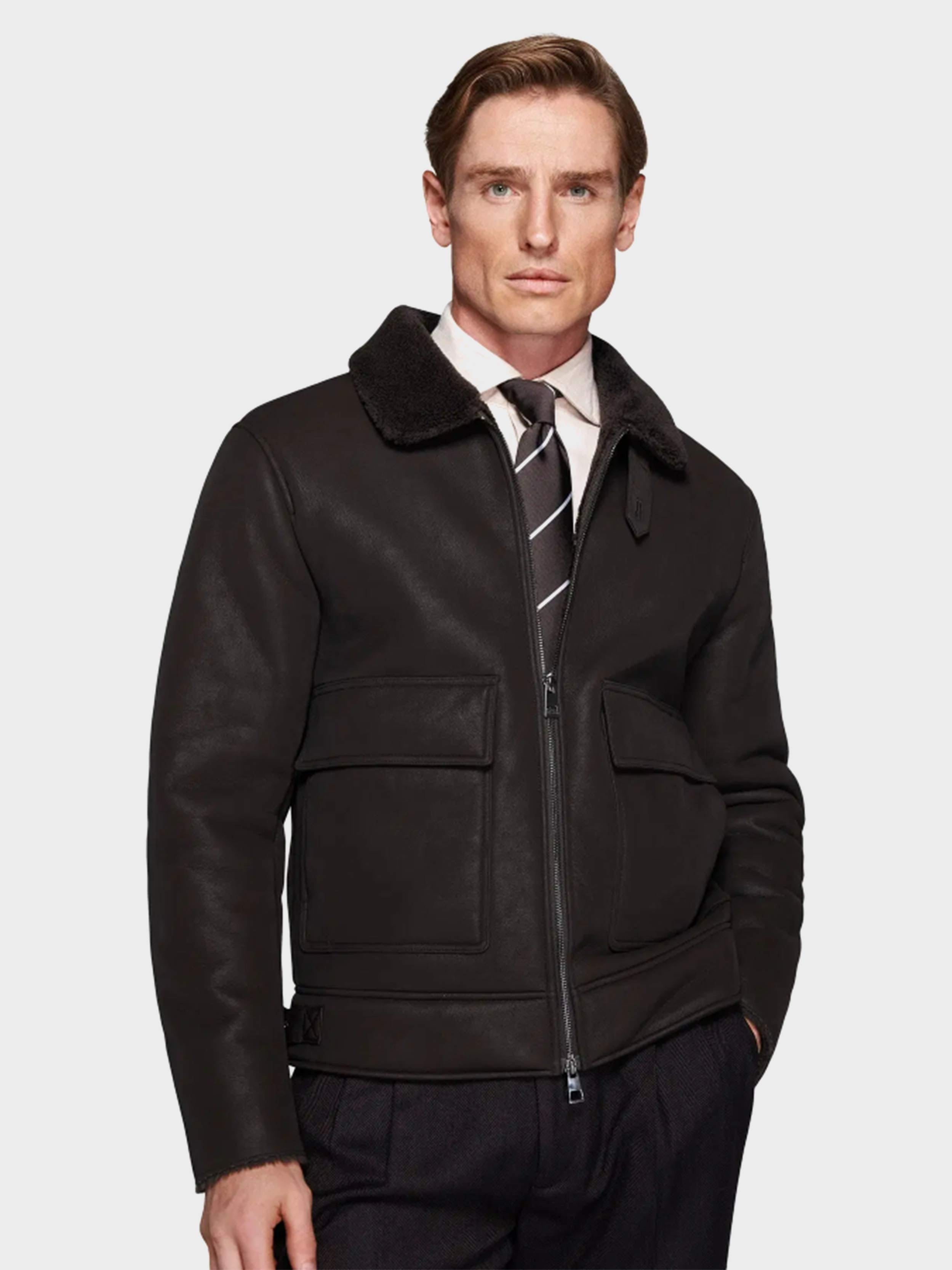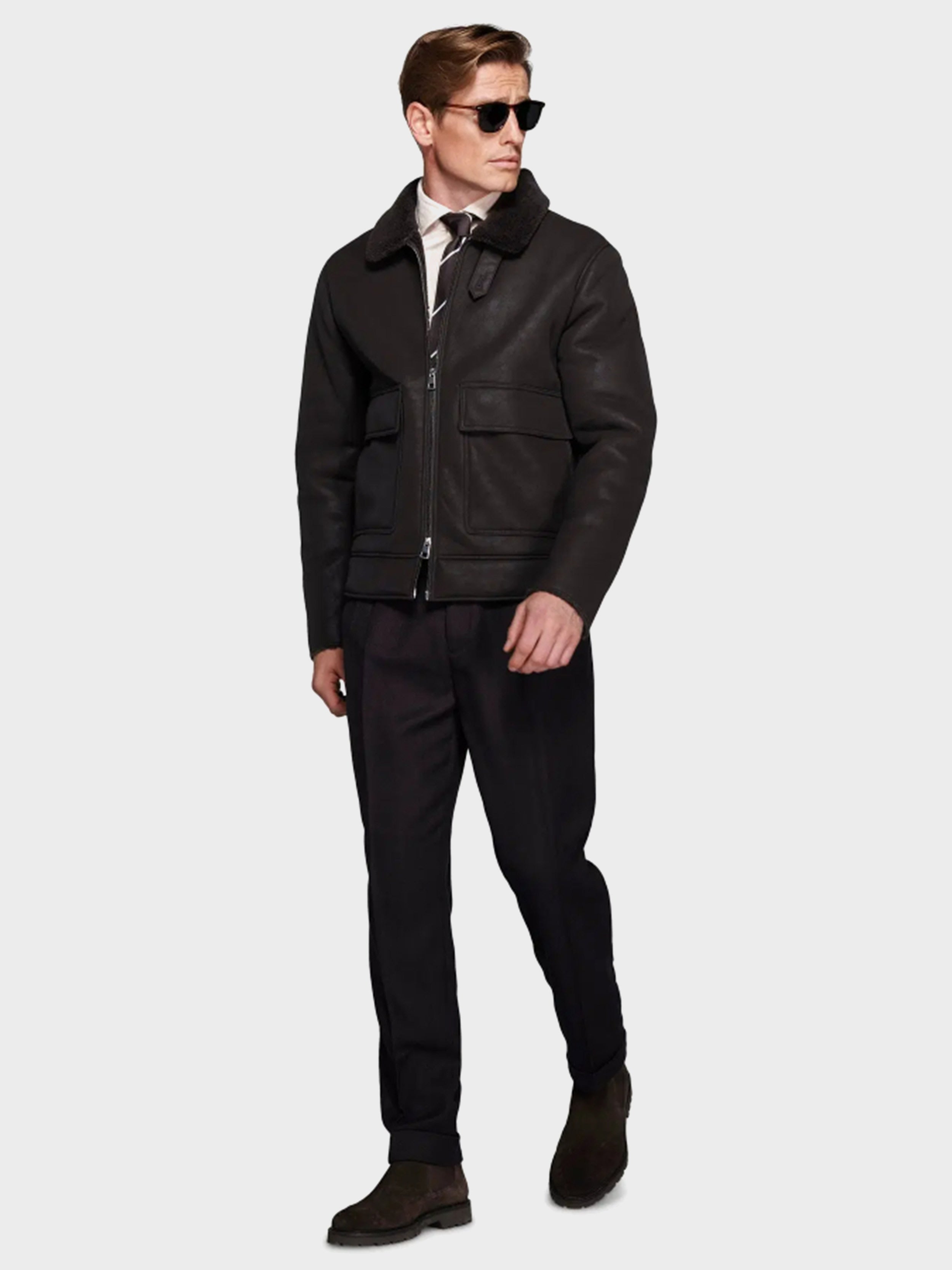 • Faux shearling aviator jacket. Flap pockets, zip closure, and teddy lining.