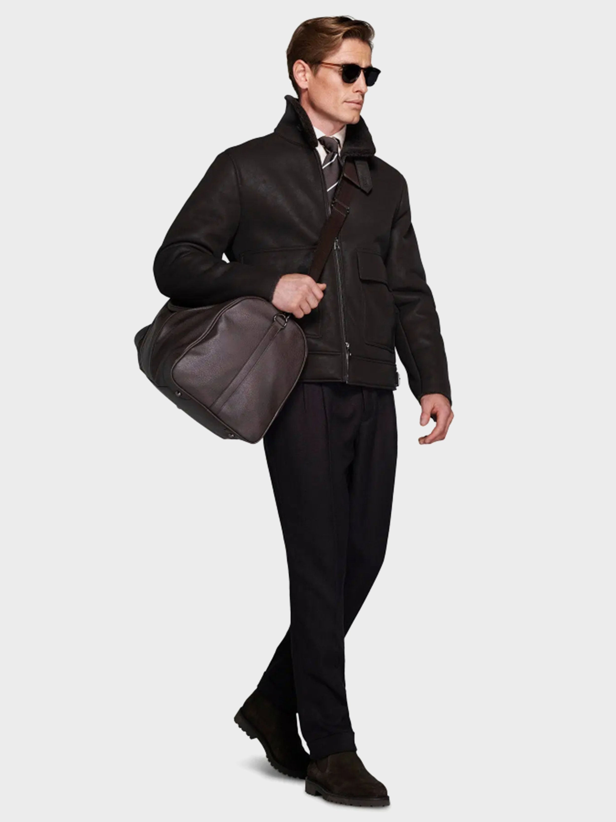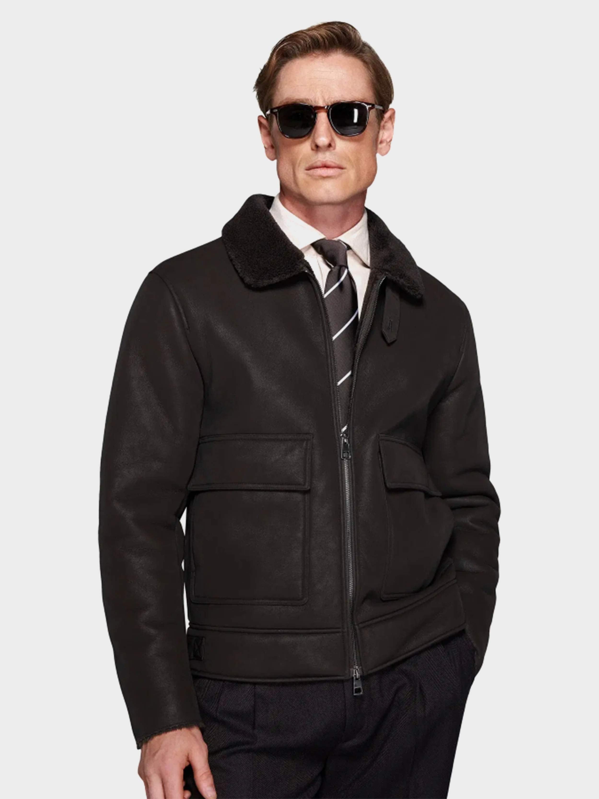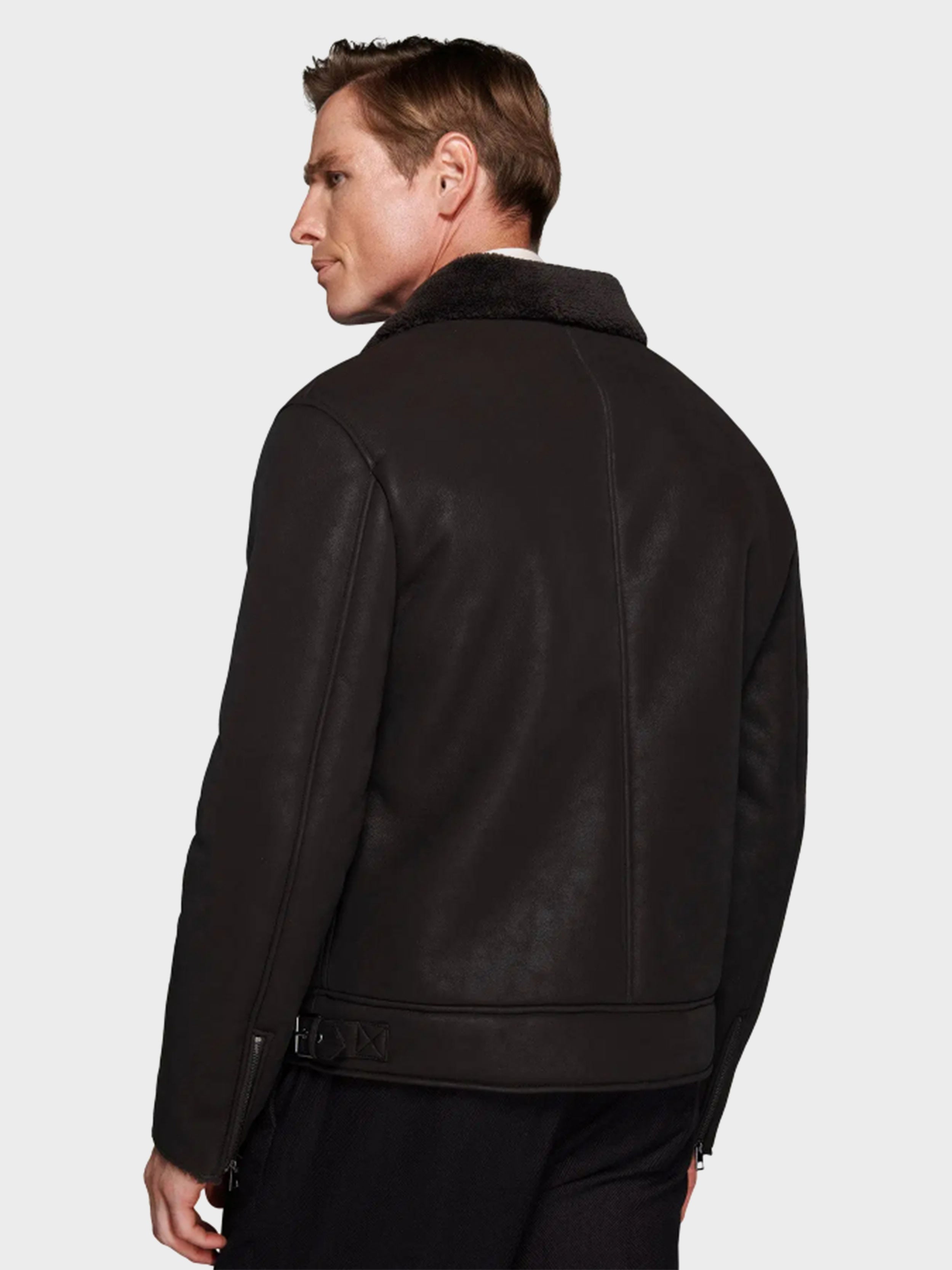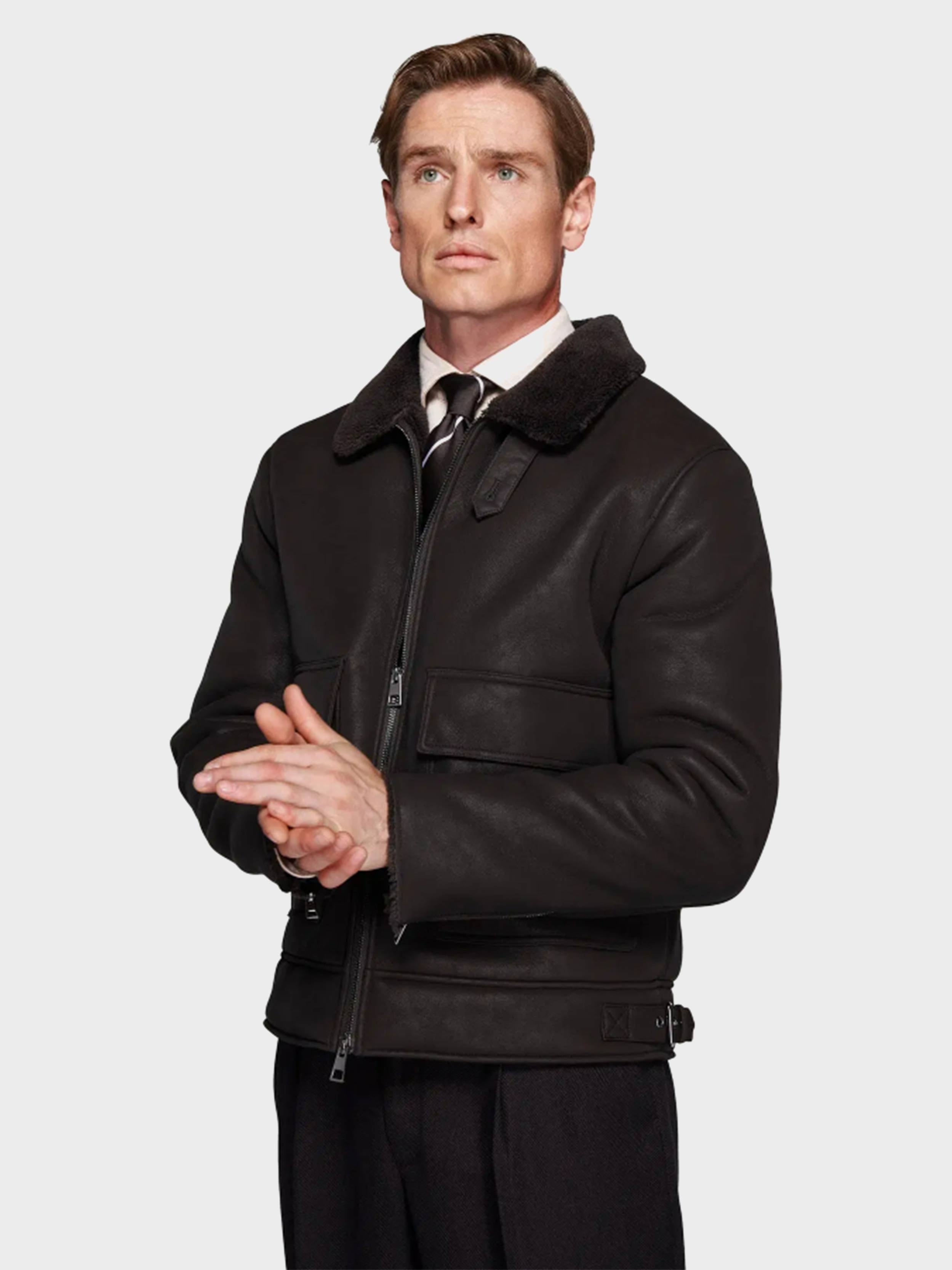• Faux shearling aviator jacket. Flap pockets, zip closure, and teddy lining.
