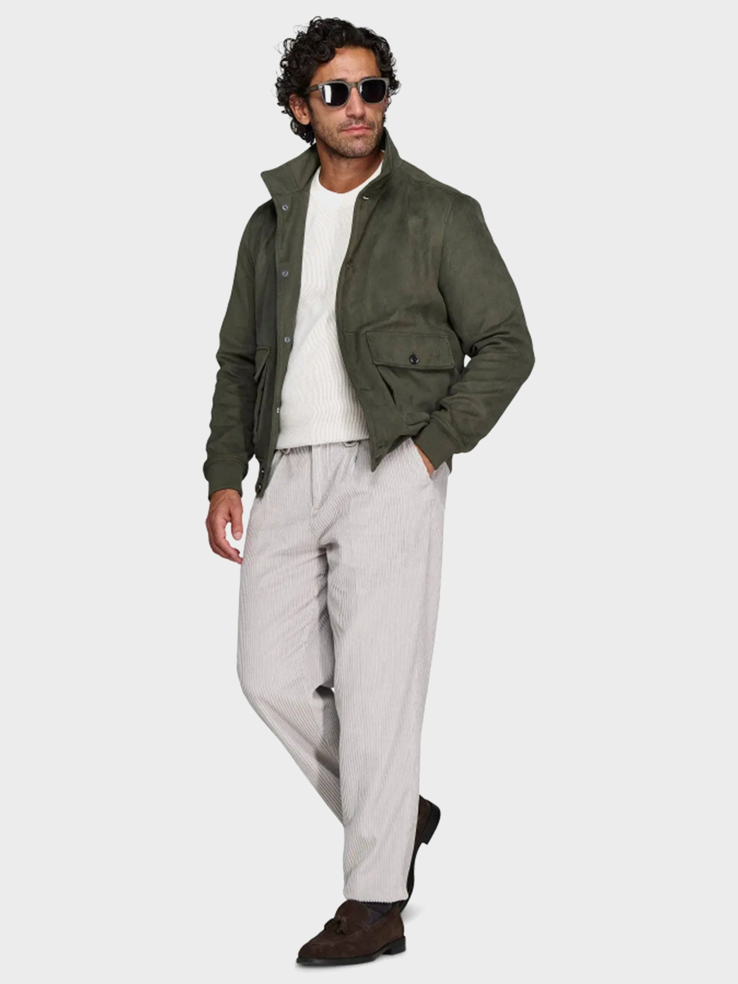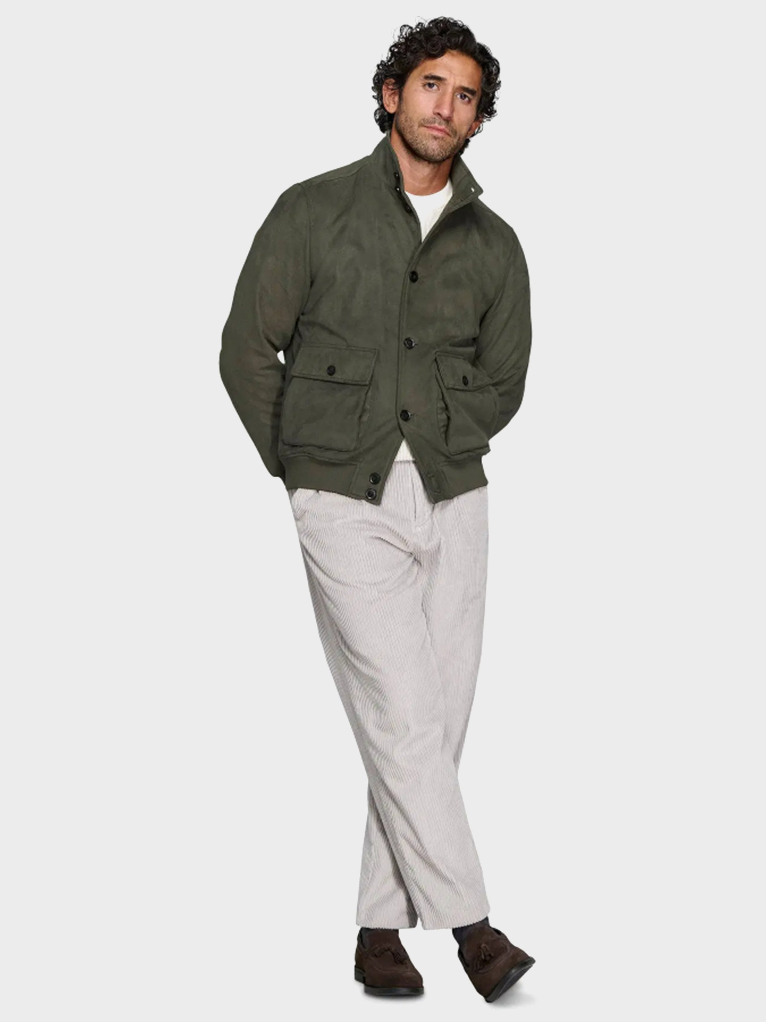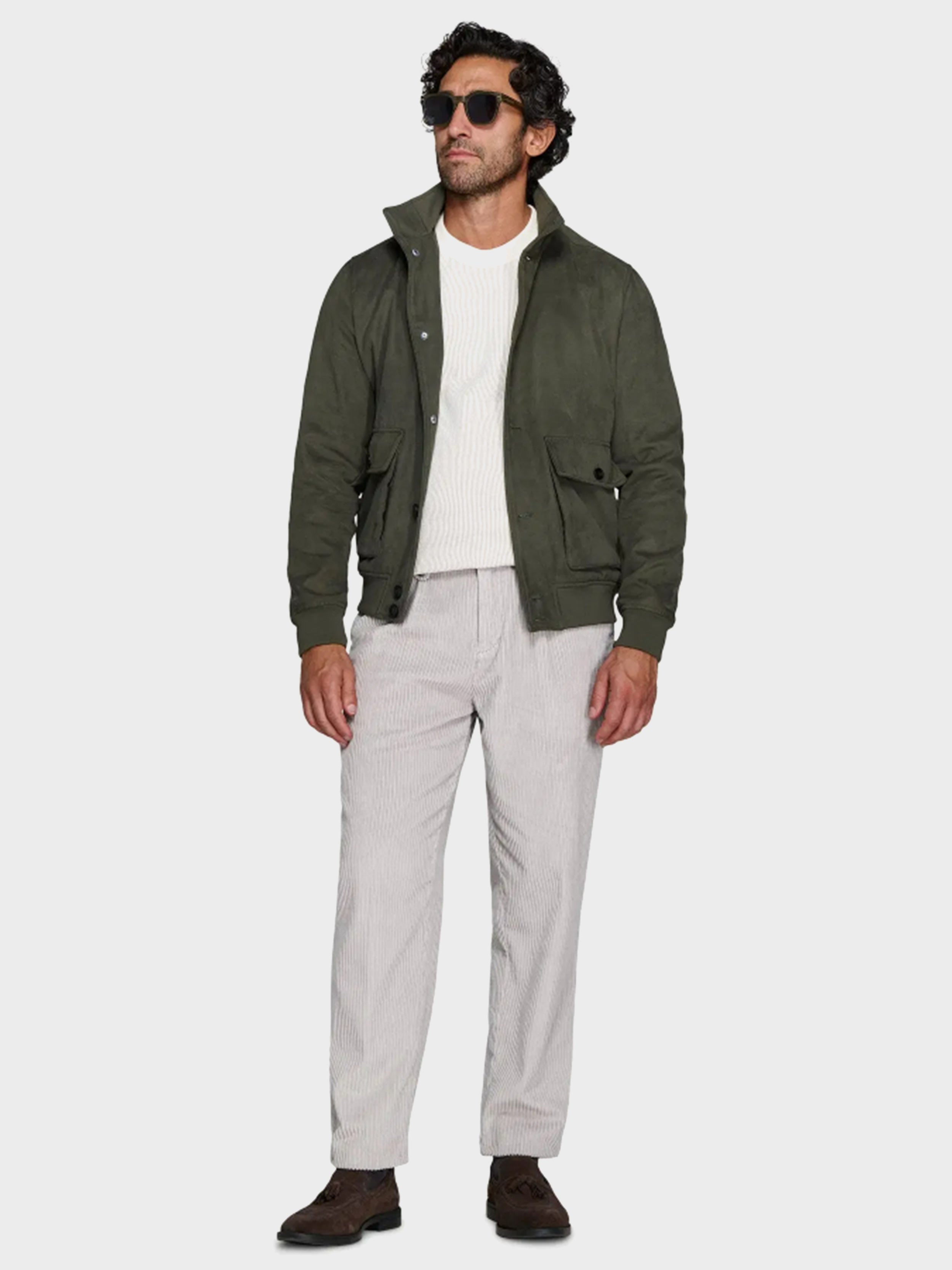 • Eco-suede polo bomber jacket. Lower flap pockets, ribbed cuffs and hem.