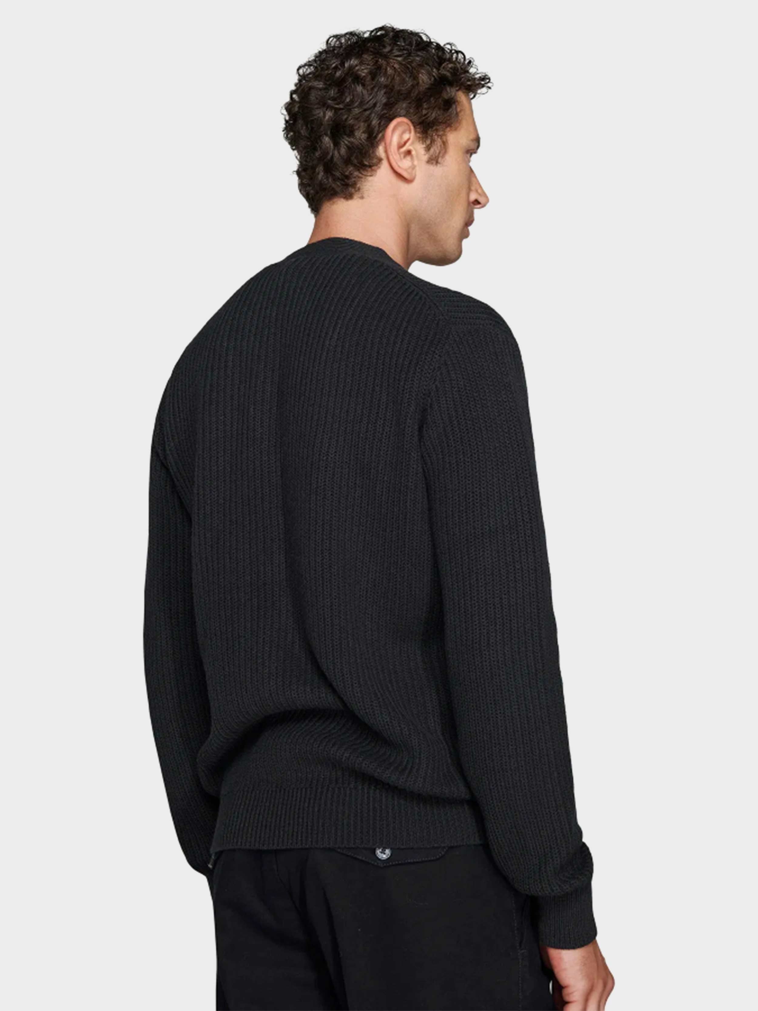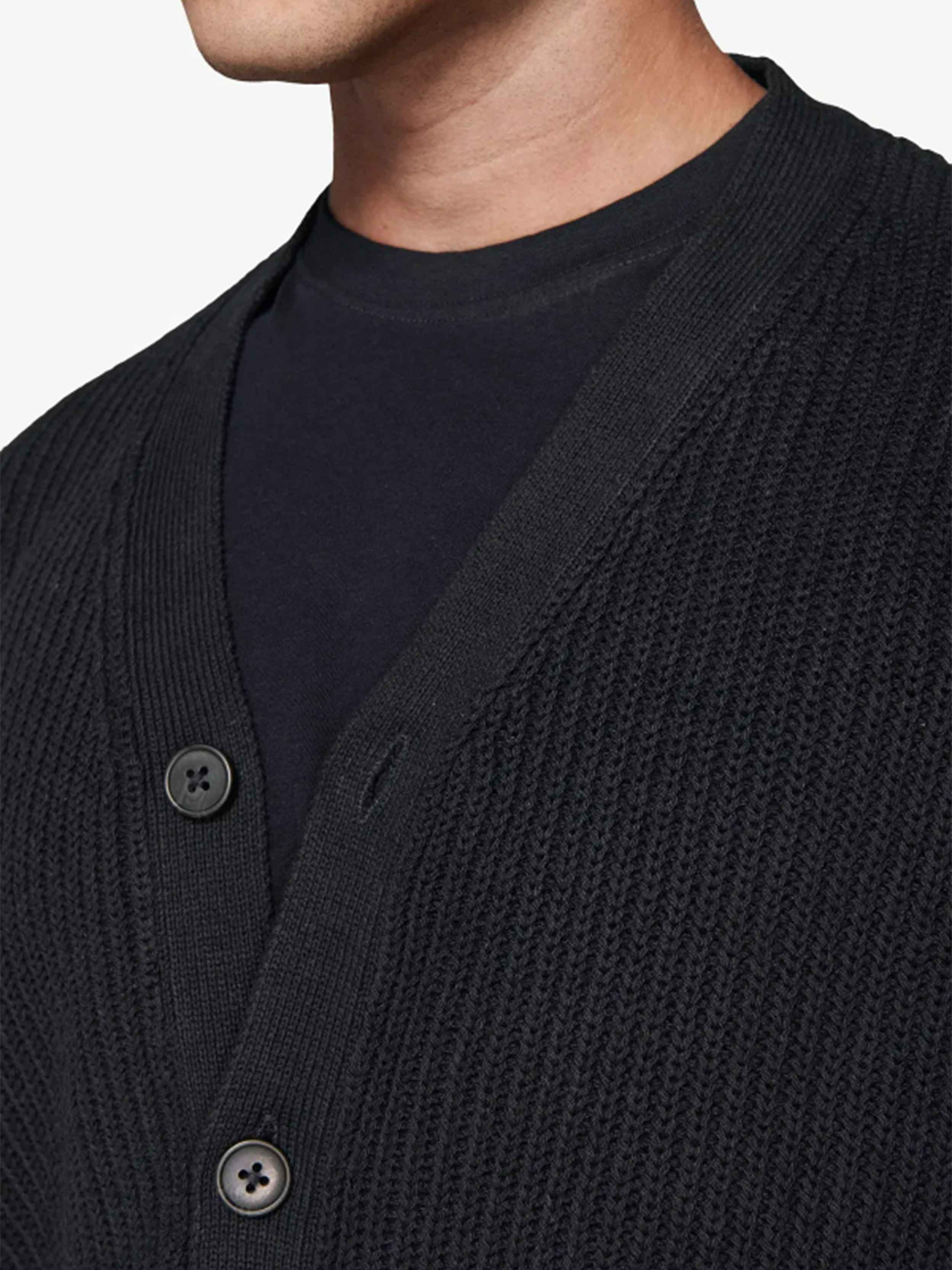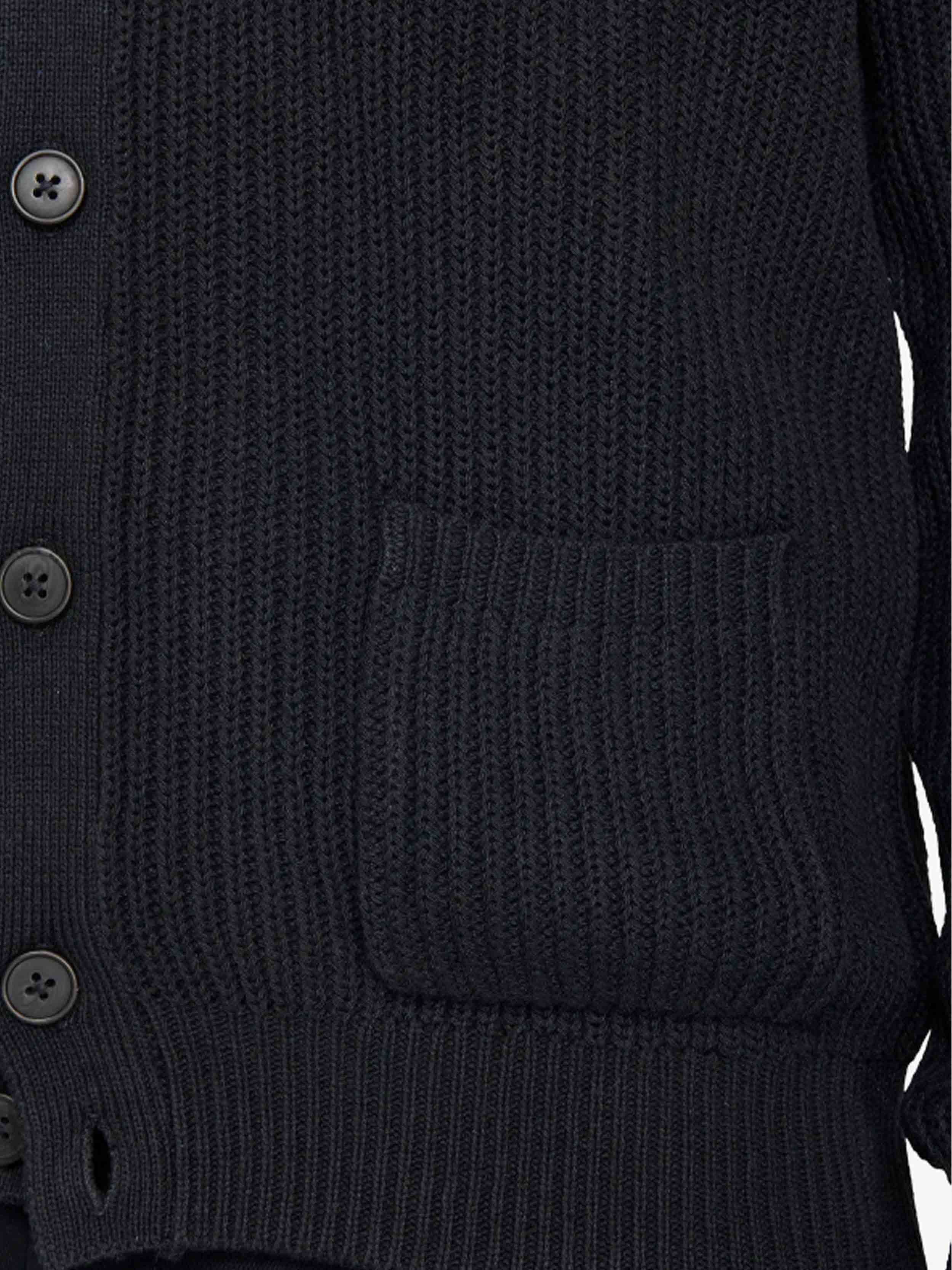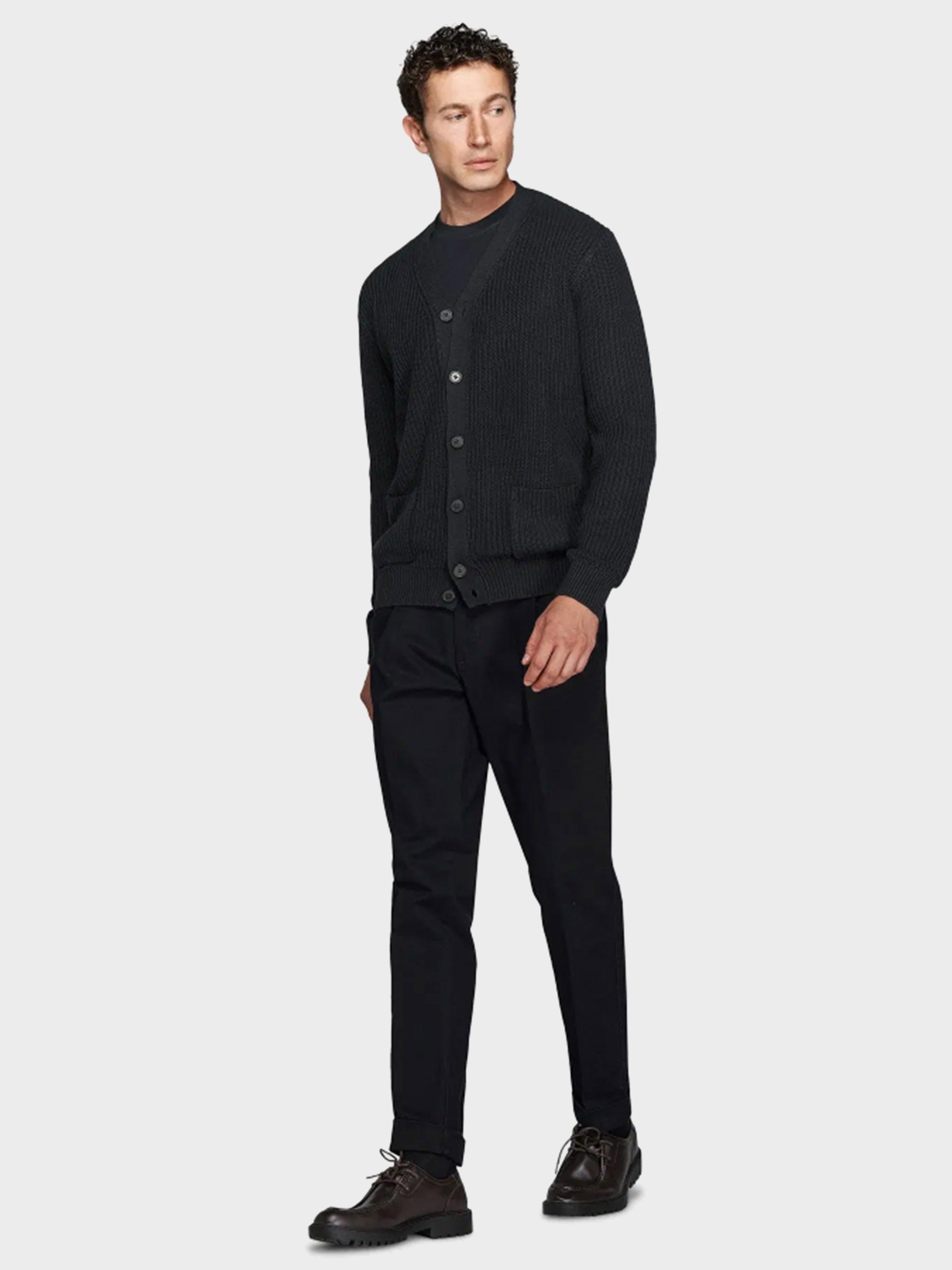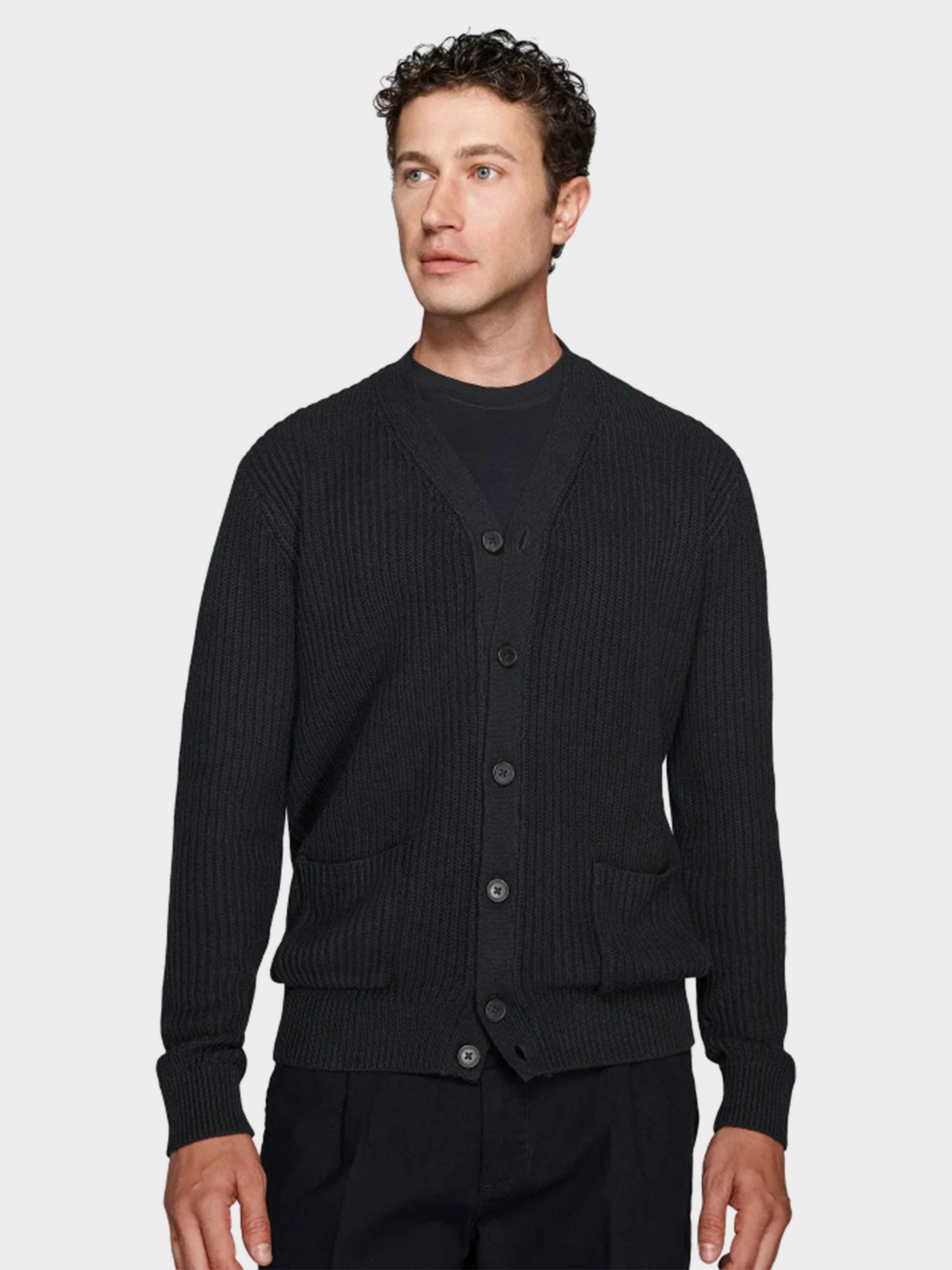 • V-neck cardigan, English rib. Button closure and patch pockets.