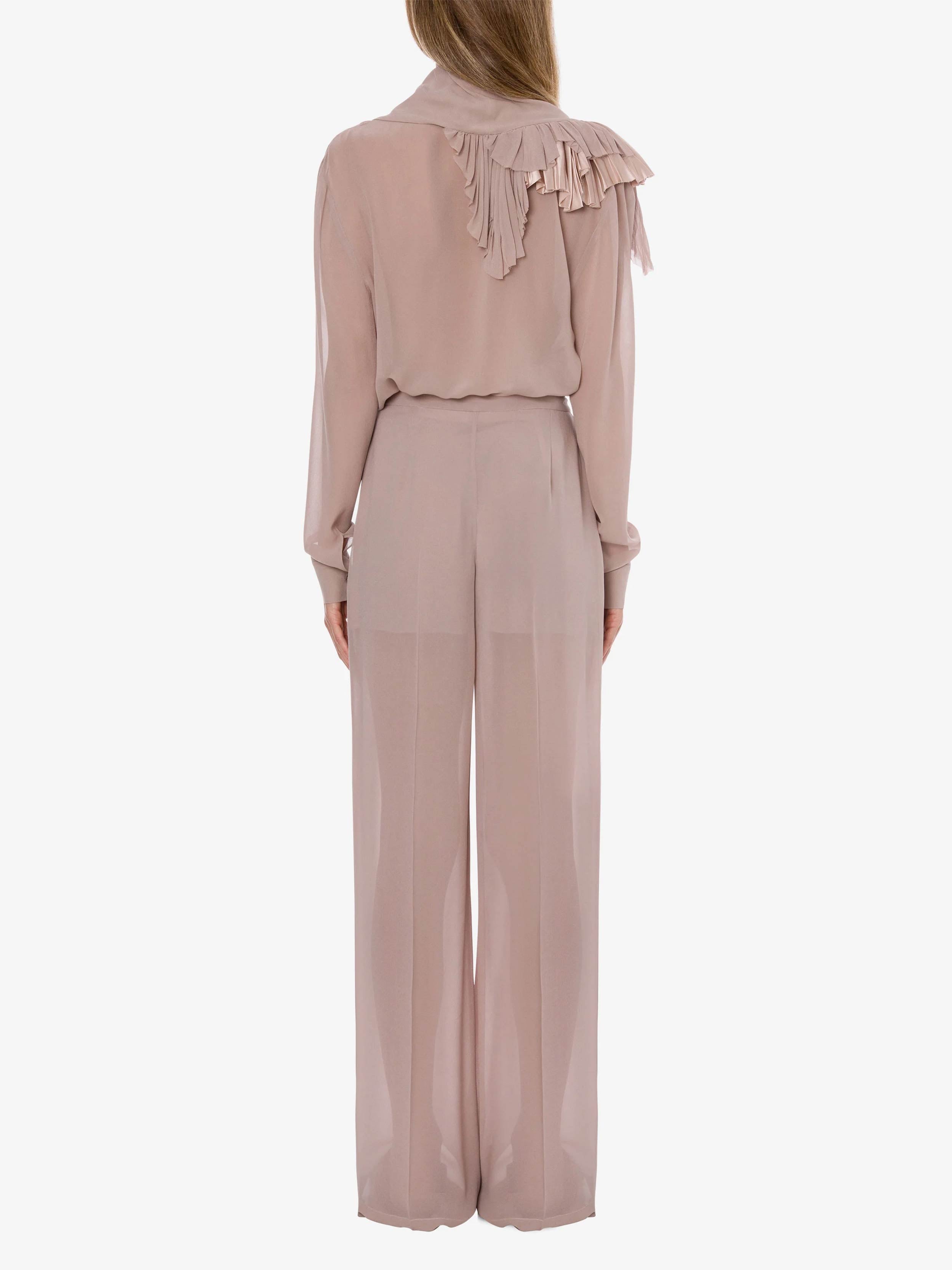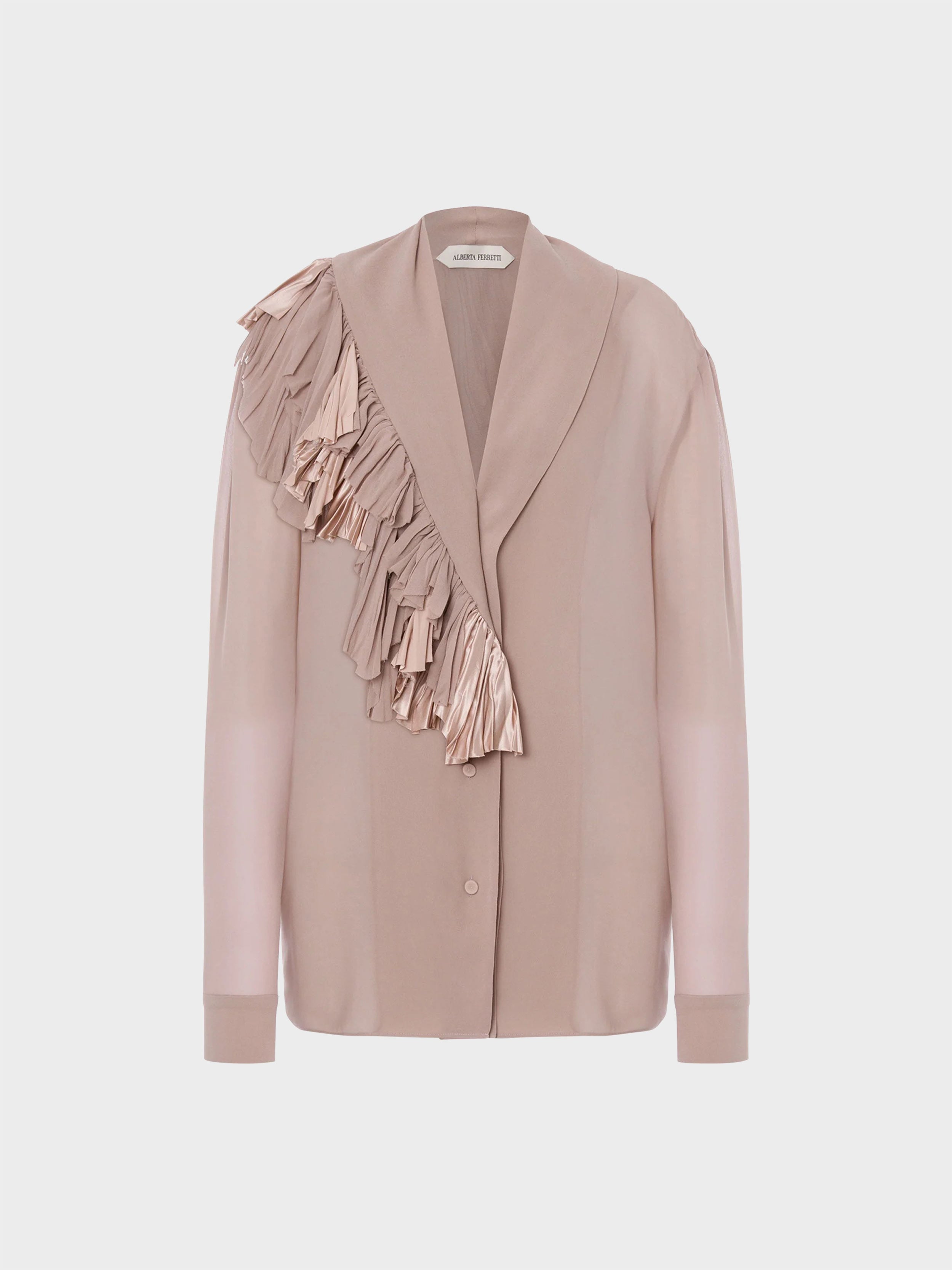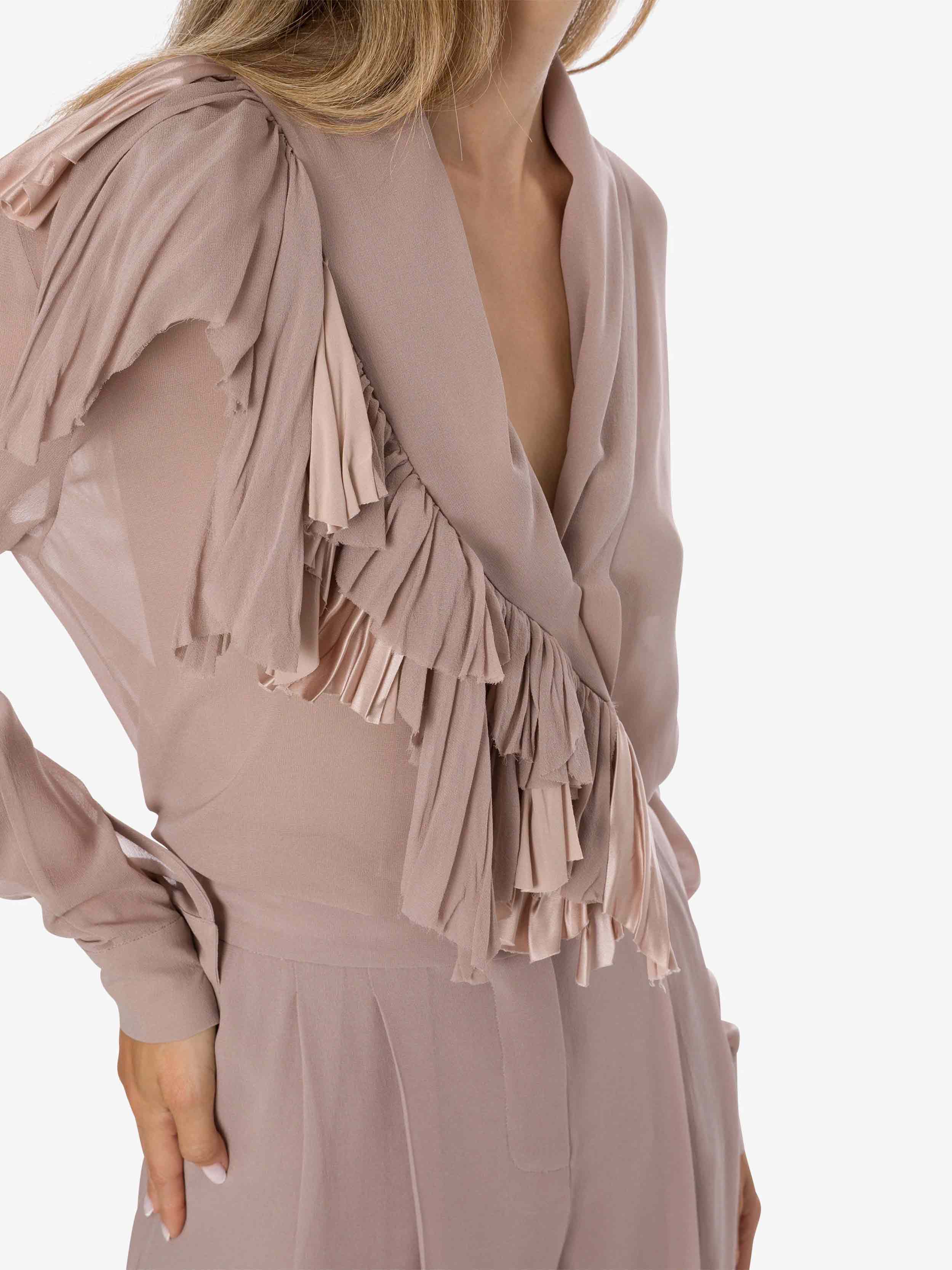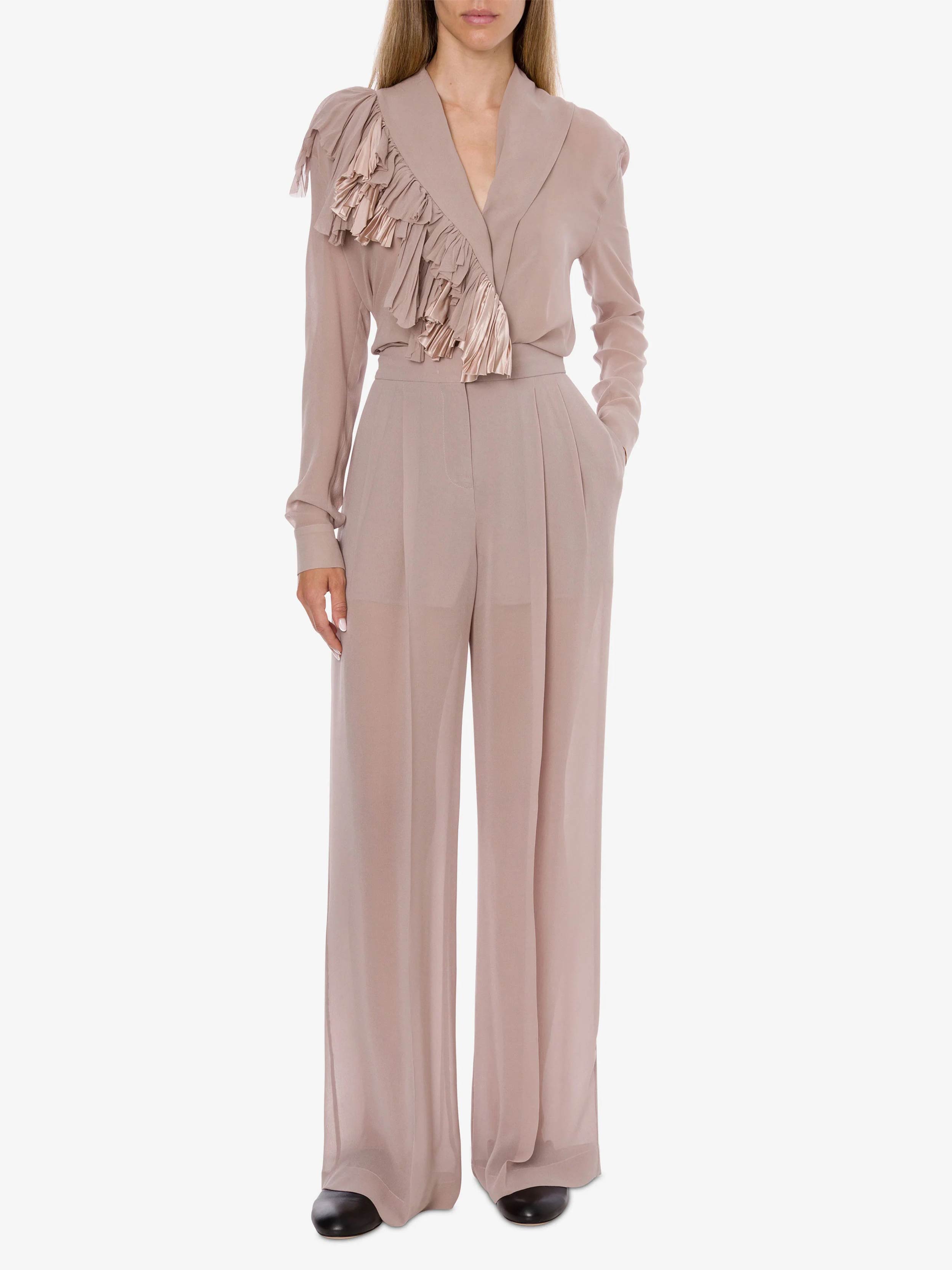 • Ethereal chiffon ruffles decorate the neck and front of this silk georgette blouse, referencing the house's signature savoir-faire.