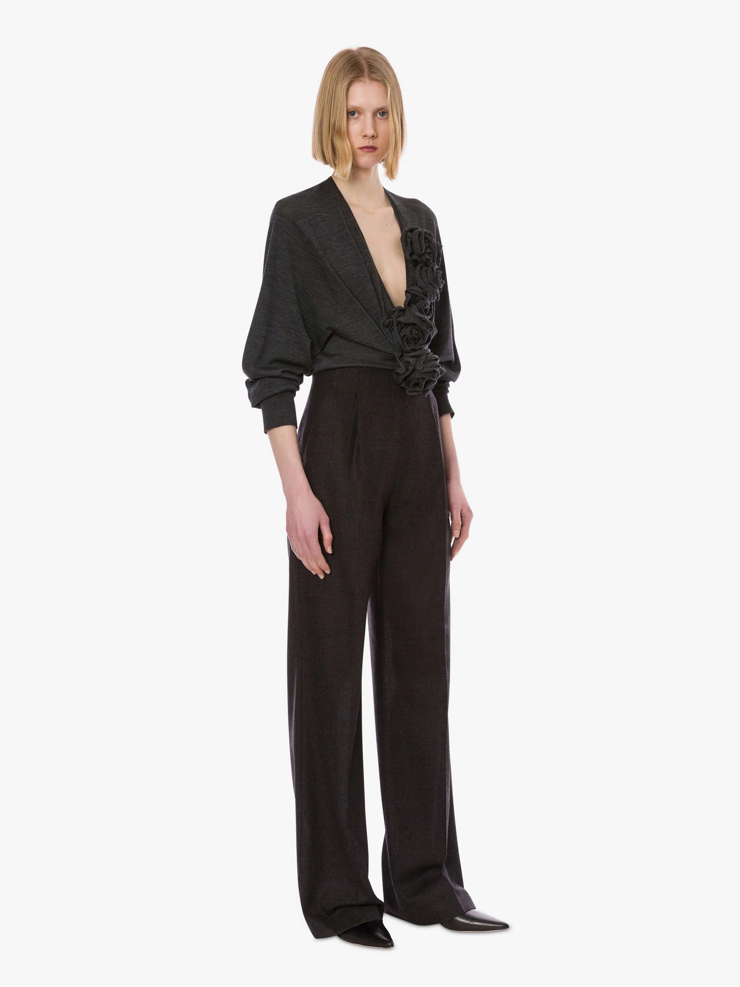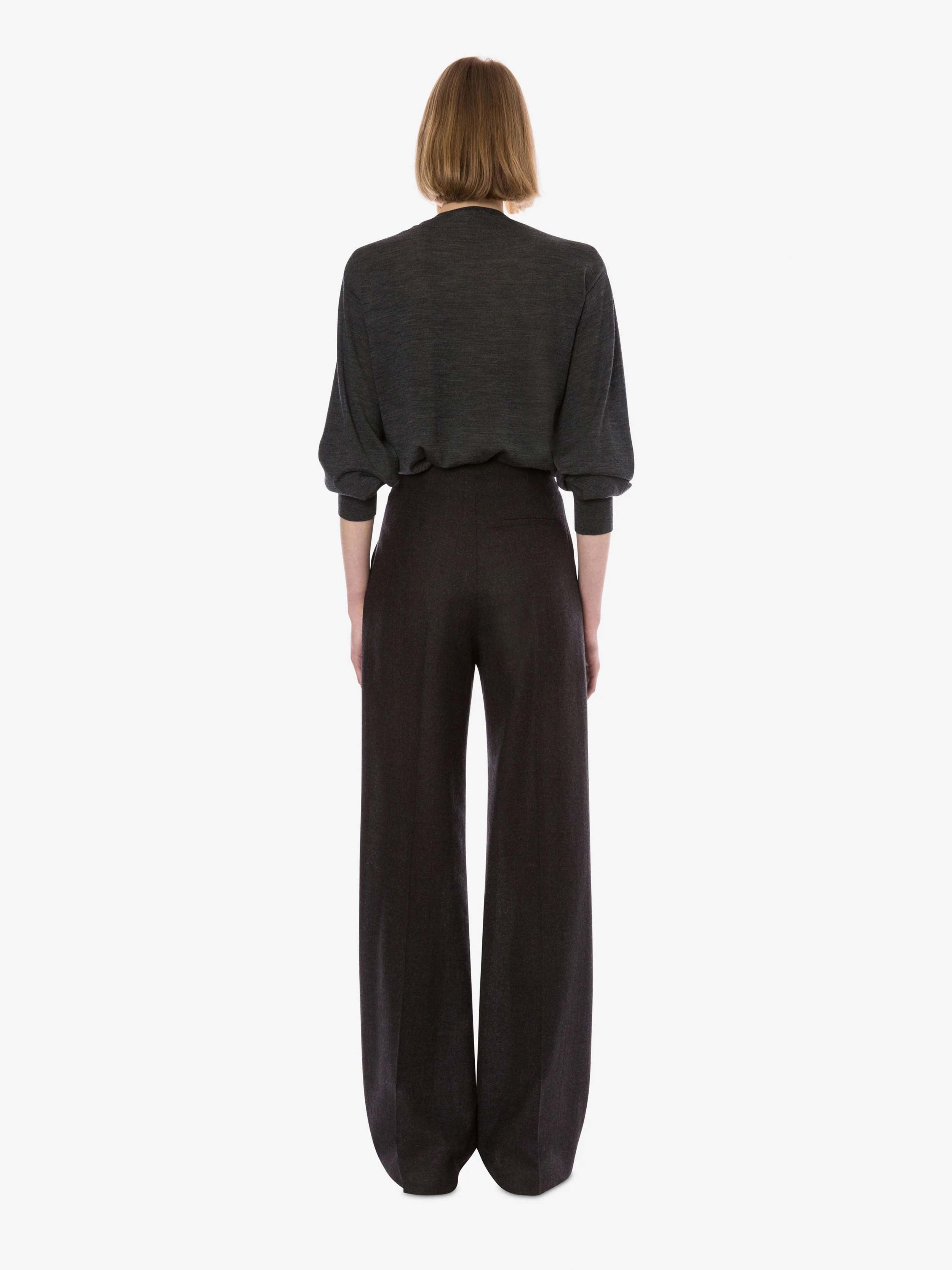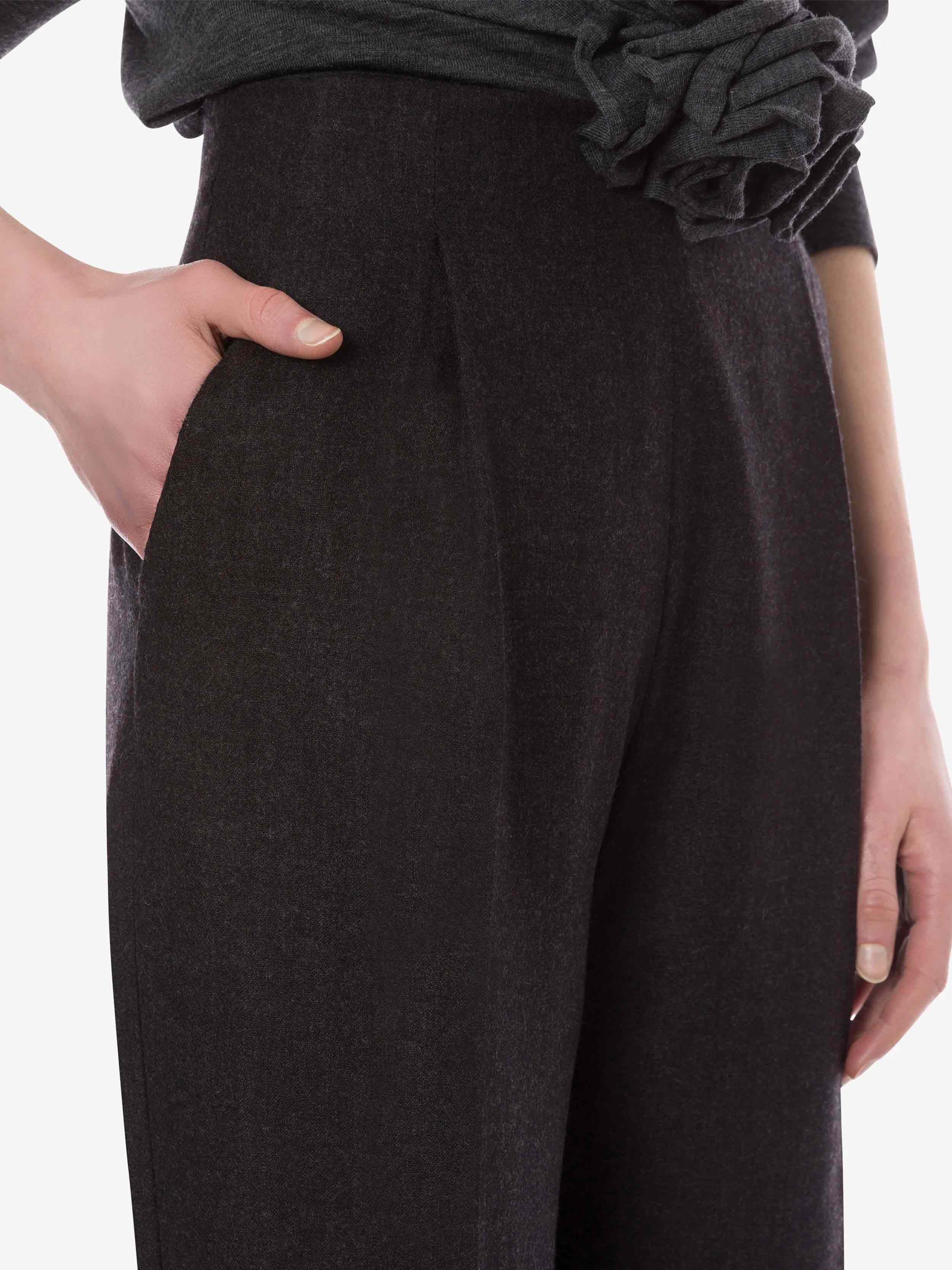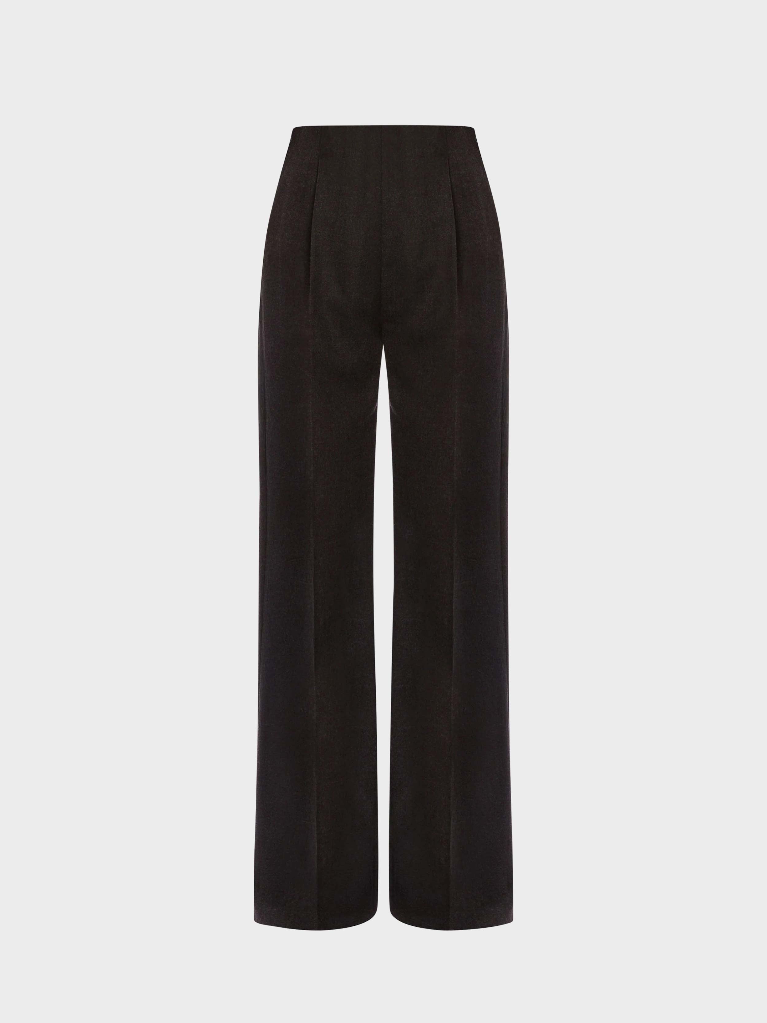 • A high-waisted, tailored trouser with a wide, relaxed leg. The fabric offers a refined, structured look, while the lightweight virgin wool ensures breathability and comfort. Featuring front pleats for added shape, side pockets, and front zip closure.