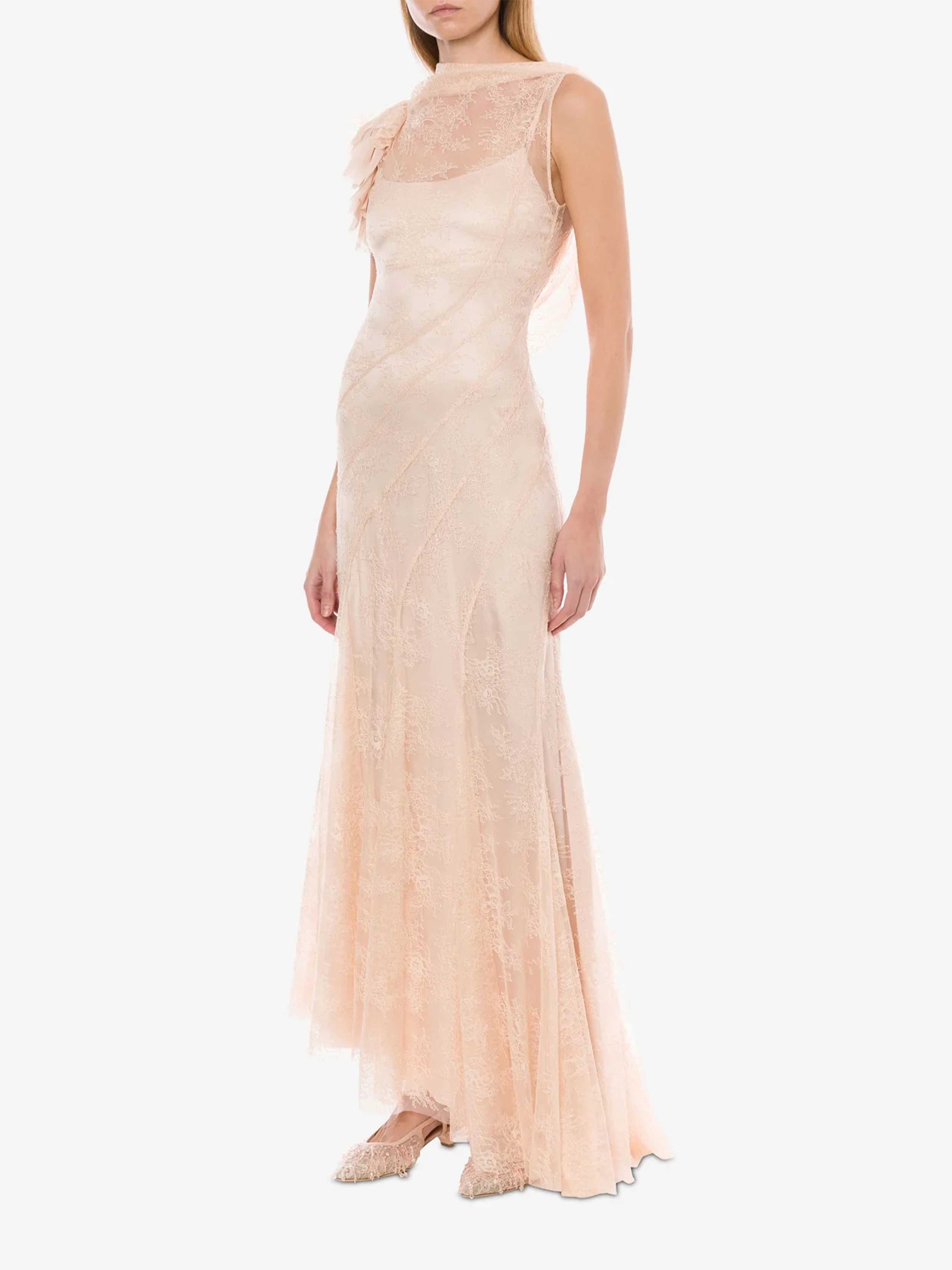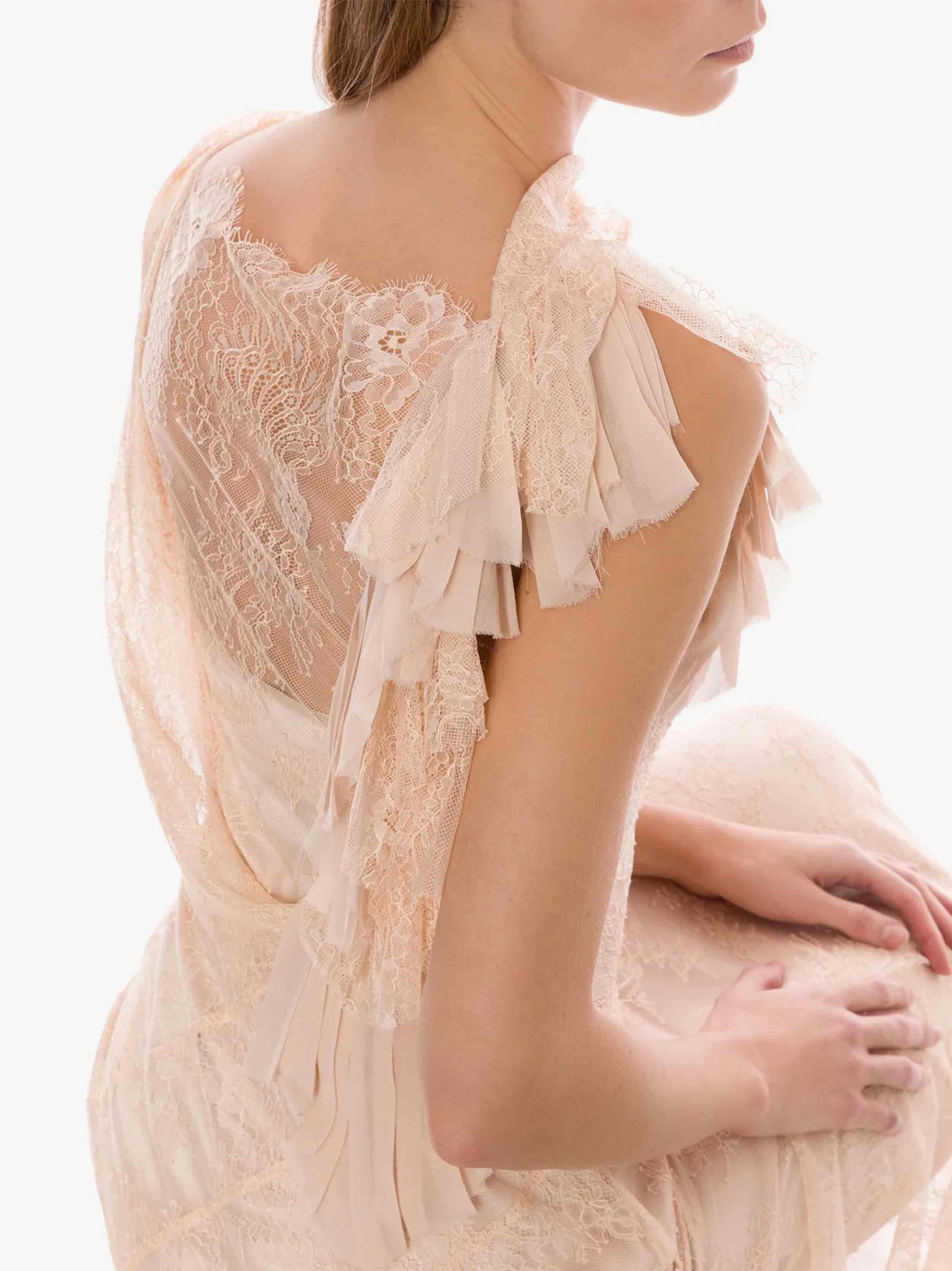 • Made in Italy, this maxi dress from Alberta Ferretti, crafted of delicate lace, features an asymmetric hem and ruffled trim.