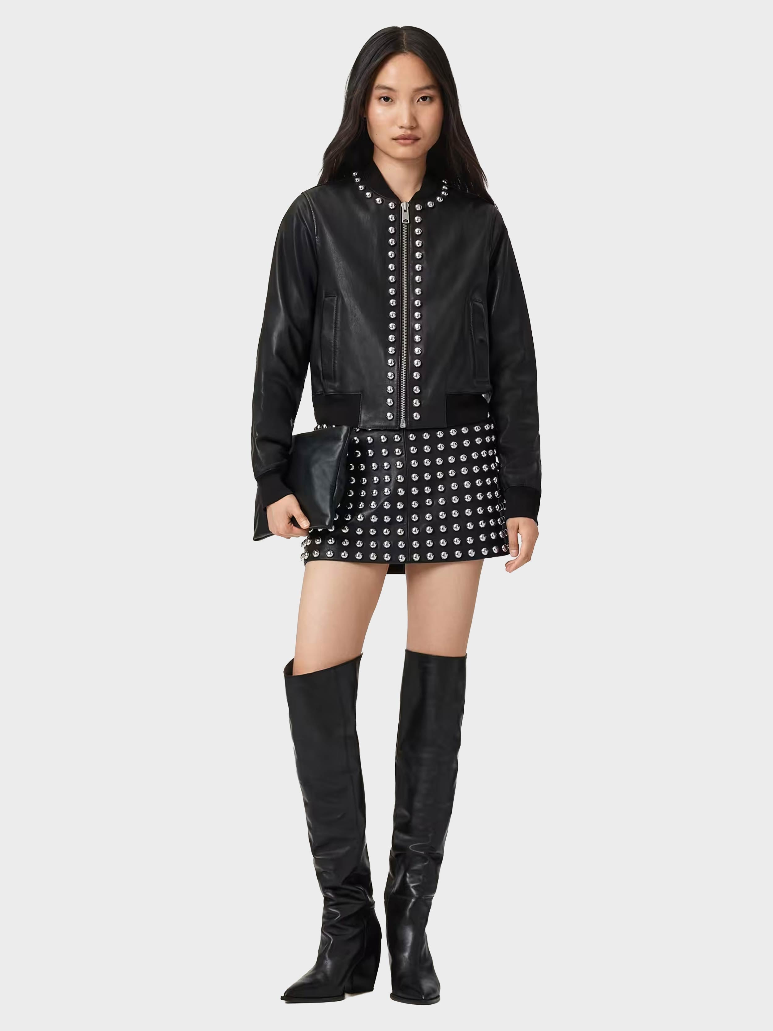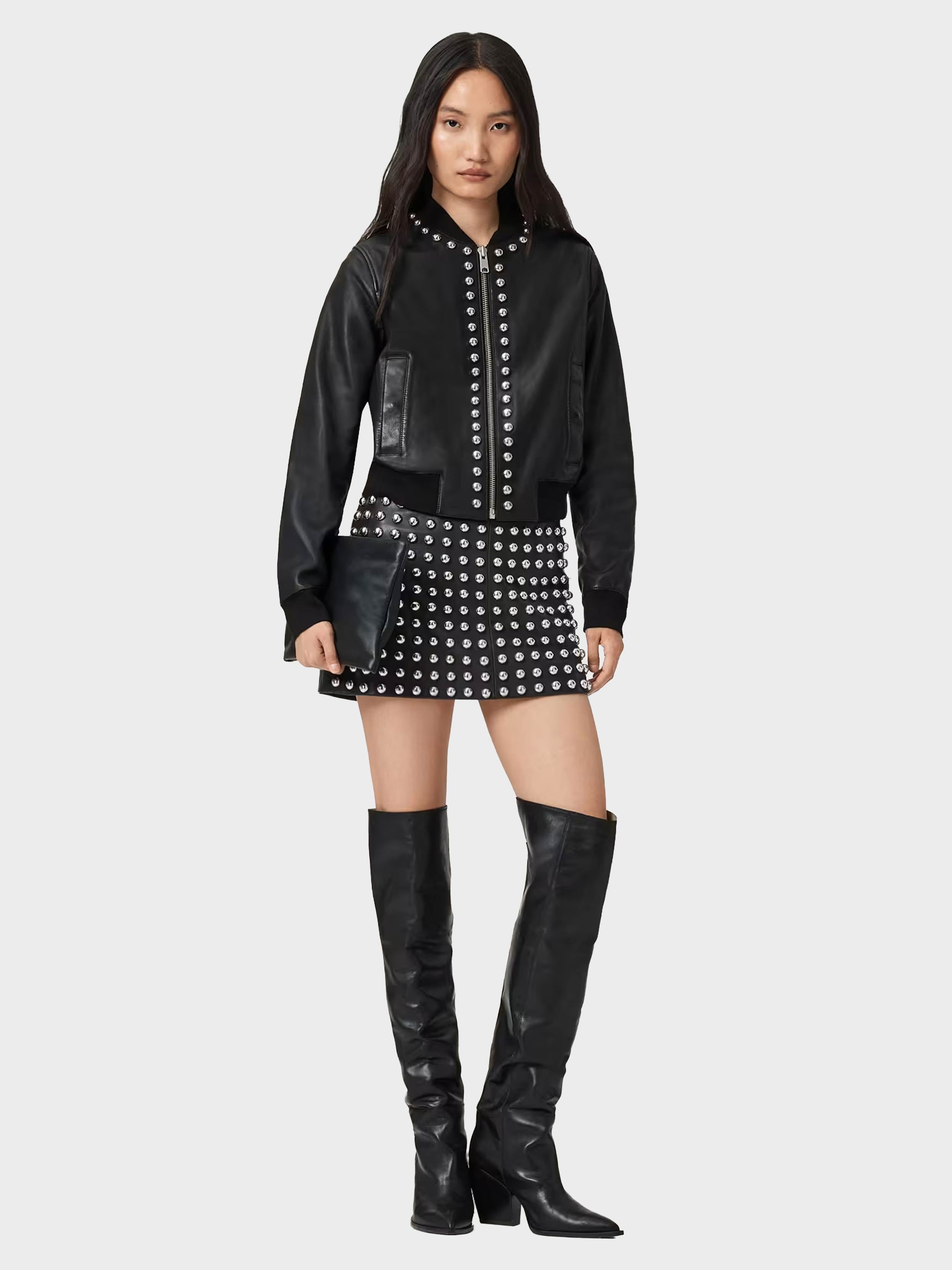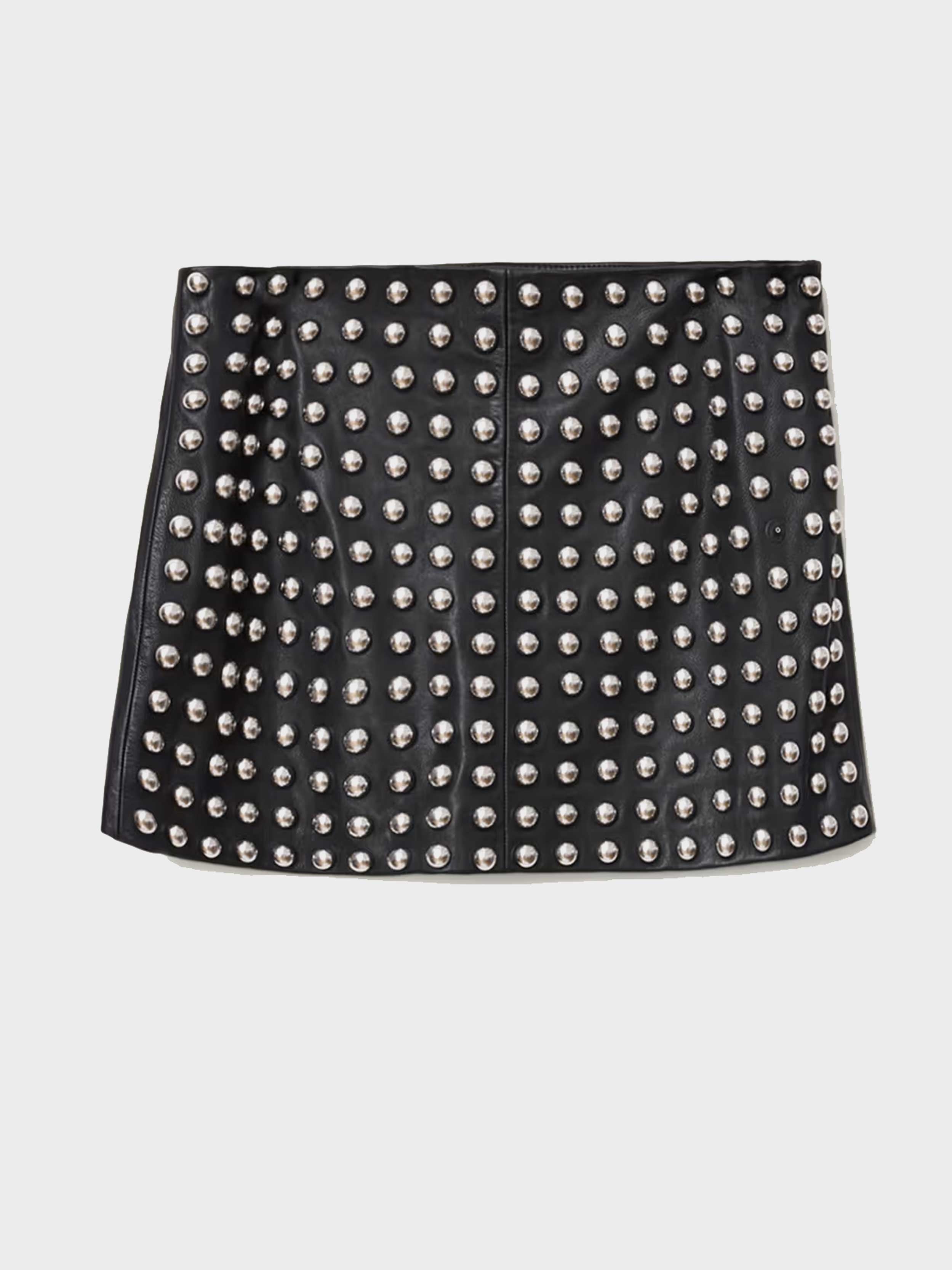 • Nobody does statement leather like us. Case in point: the Lea skirt. Crafted from supple premium leather and covered with large gleaming studs – wear it with the studded Orten bomber for maximum impact.