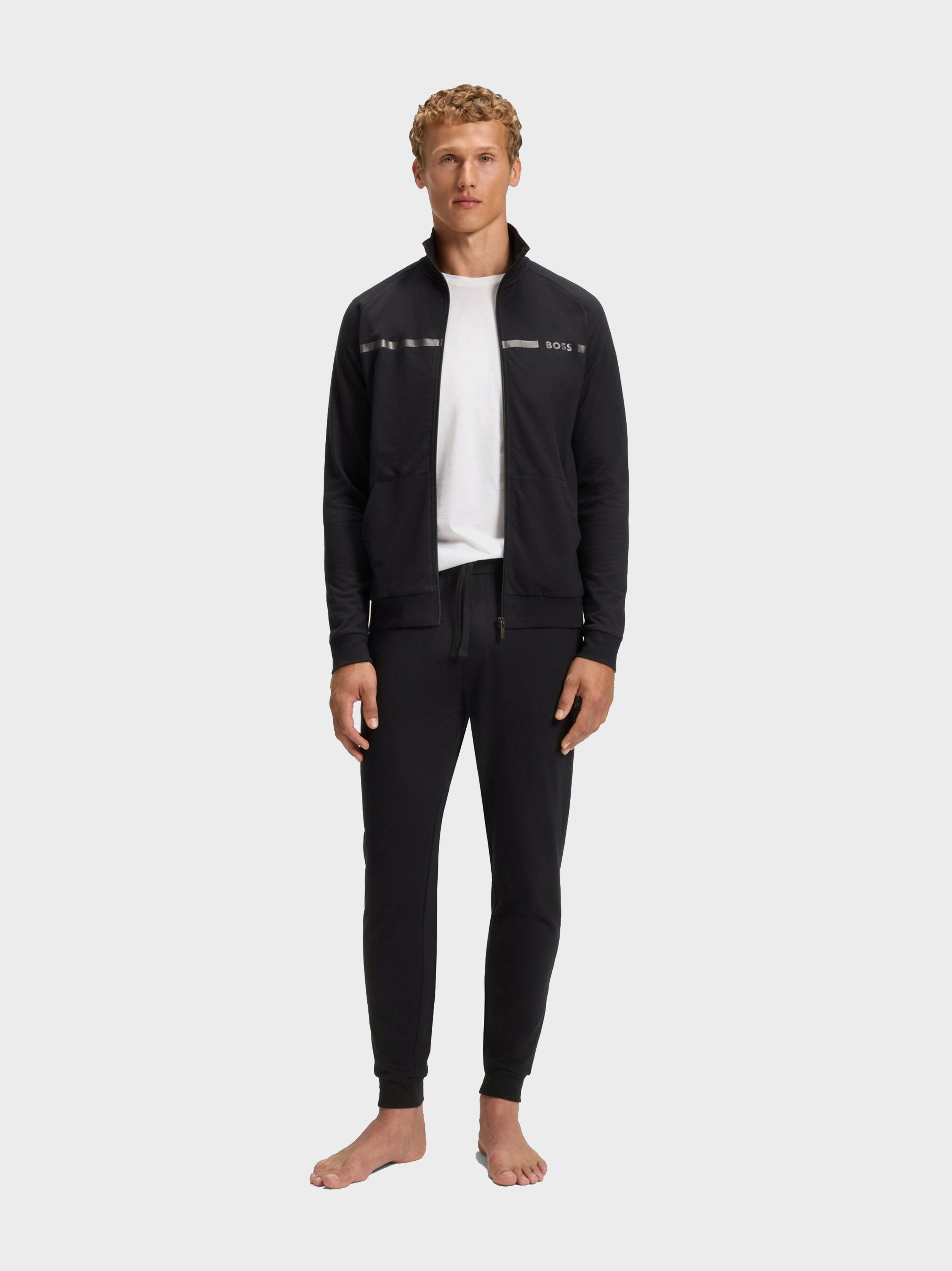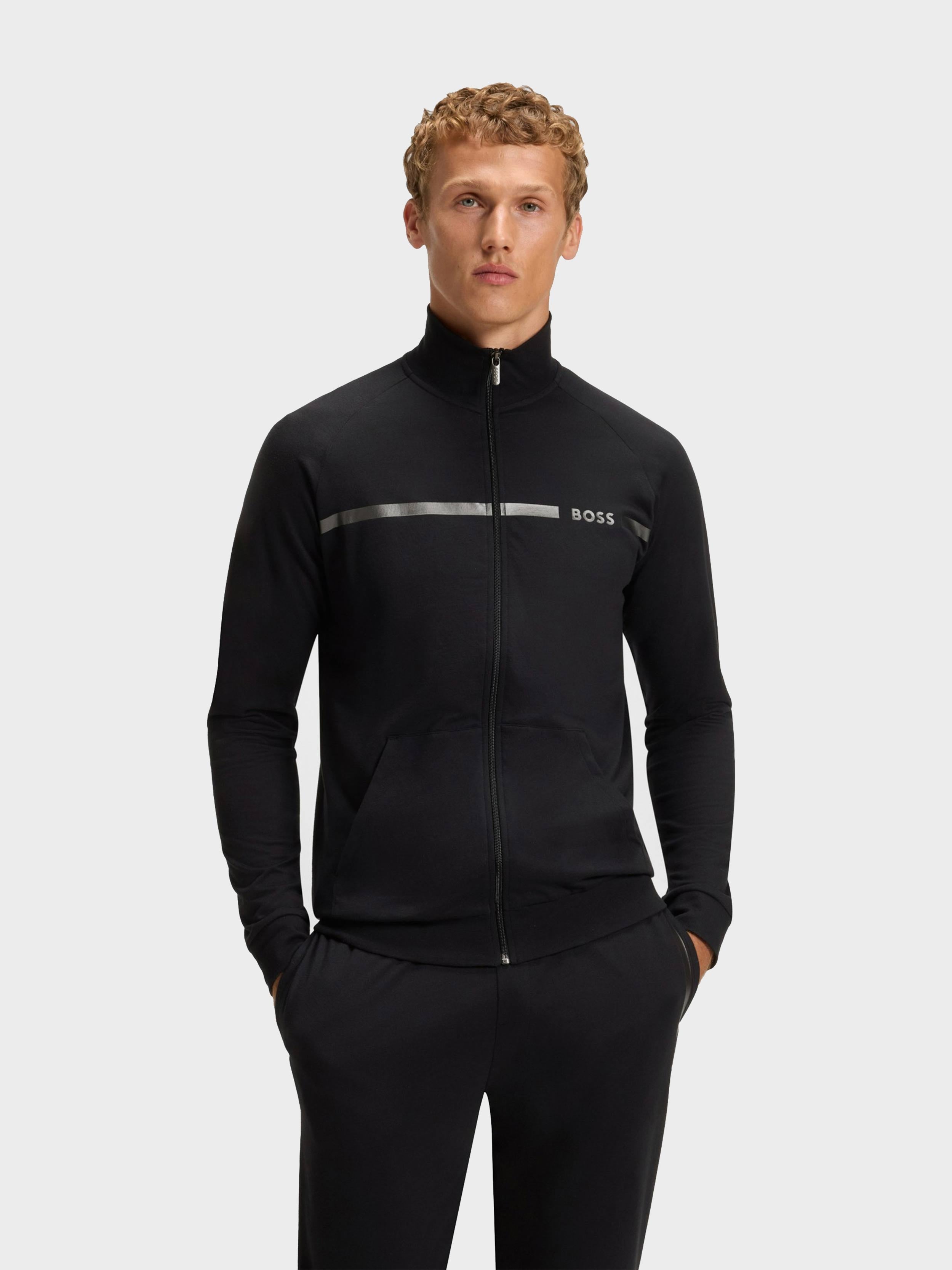 • Elevate your off-duty collection with the soft cotton terry of this BOSS Menswear jacket. Printed stripe and logo. Regular fit.