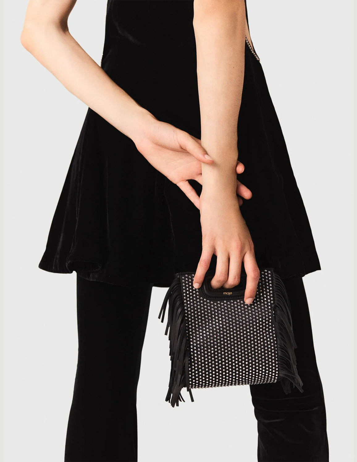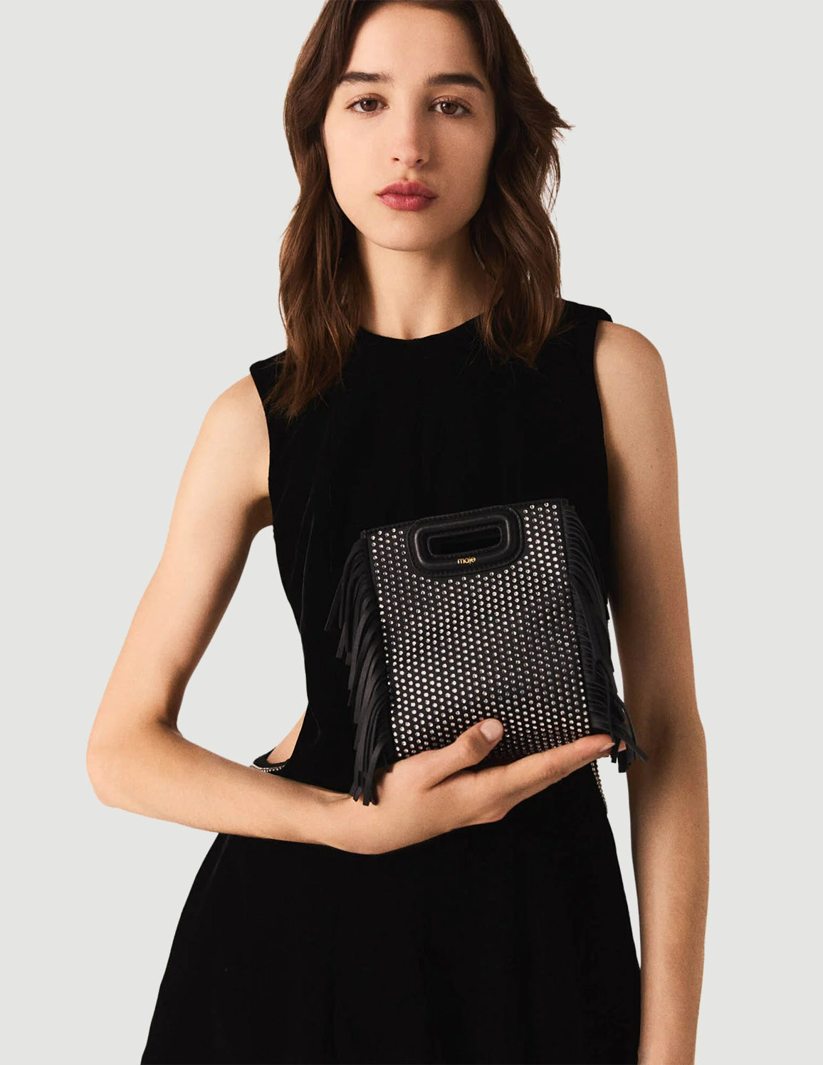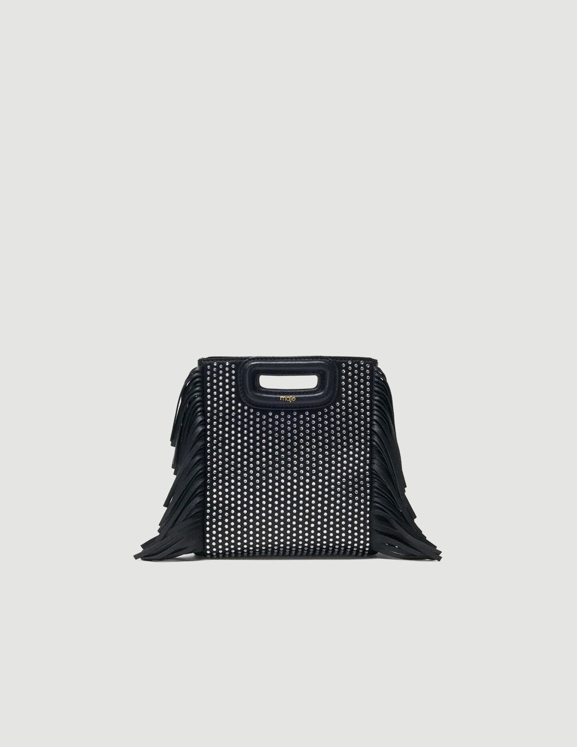 • Maje's iconic M bag, available in a mini version with rhinestones, is both chic and practical. Trimmed with fringing on the sides and featuring a sheathed handle, it has an embossed logo and a signature engraving on the snap hooks. Practical, with a magnetic closure, it has an adjustable and removable leather shoulder strap, so you can carry it by hand, on your shoulder or crossbody.