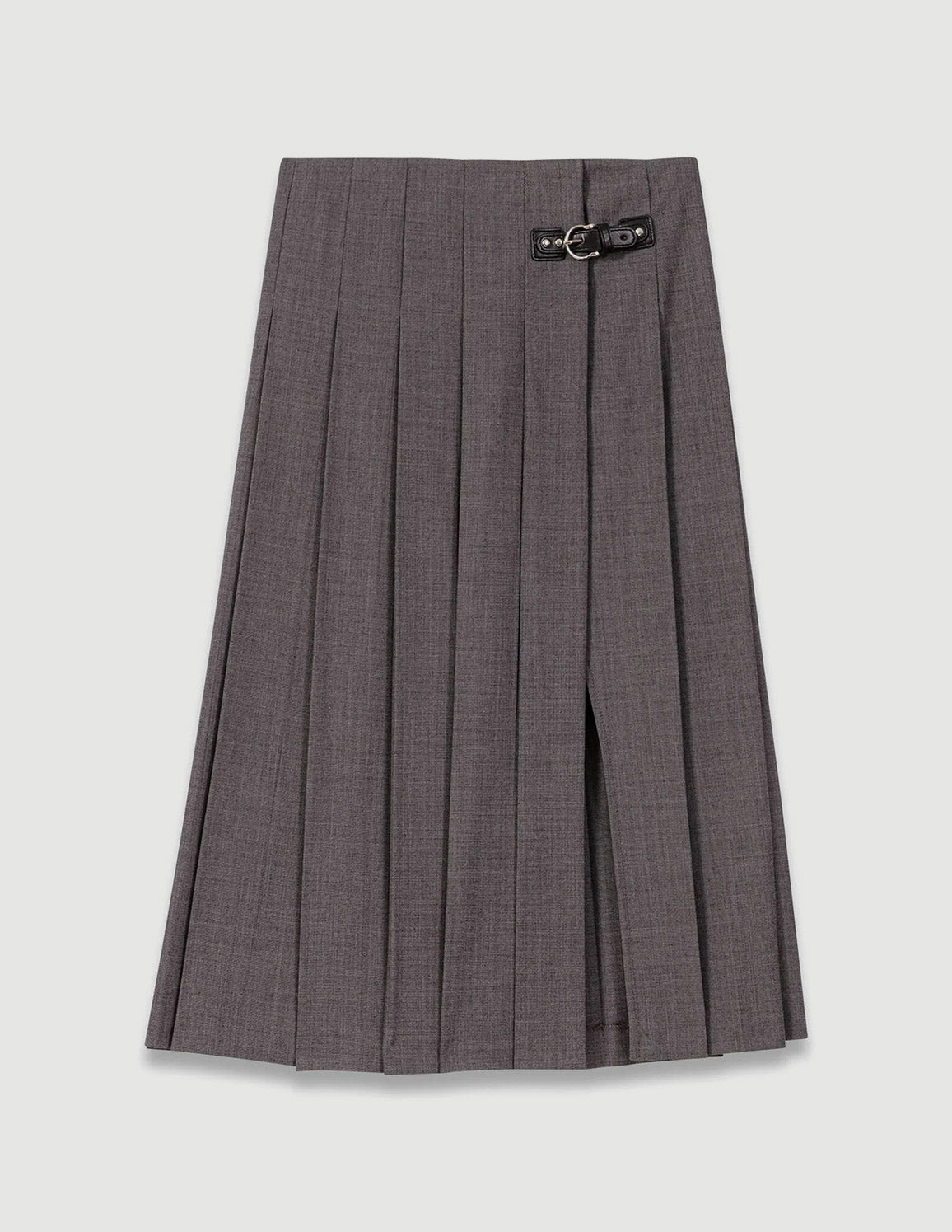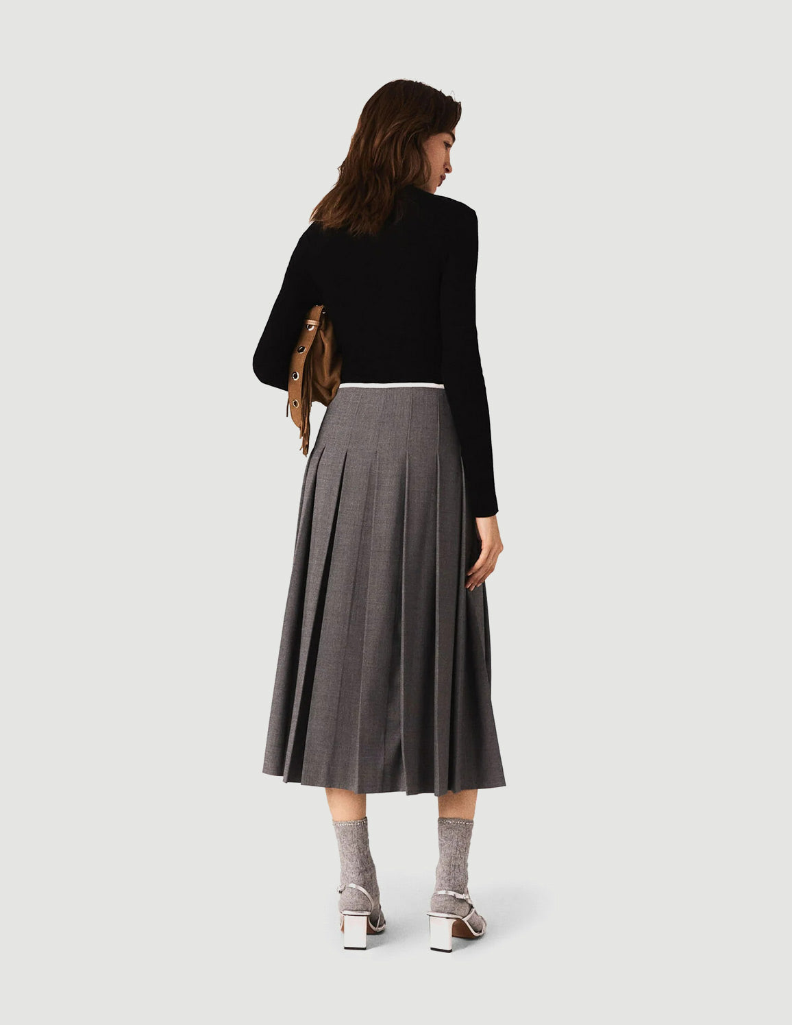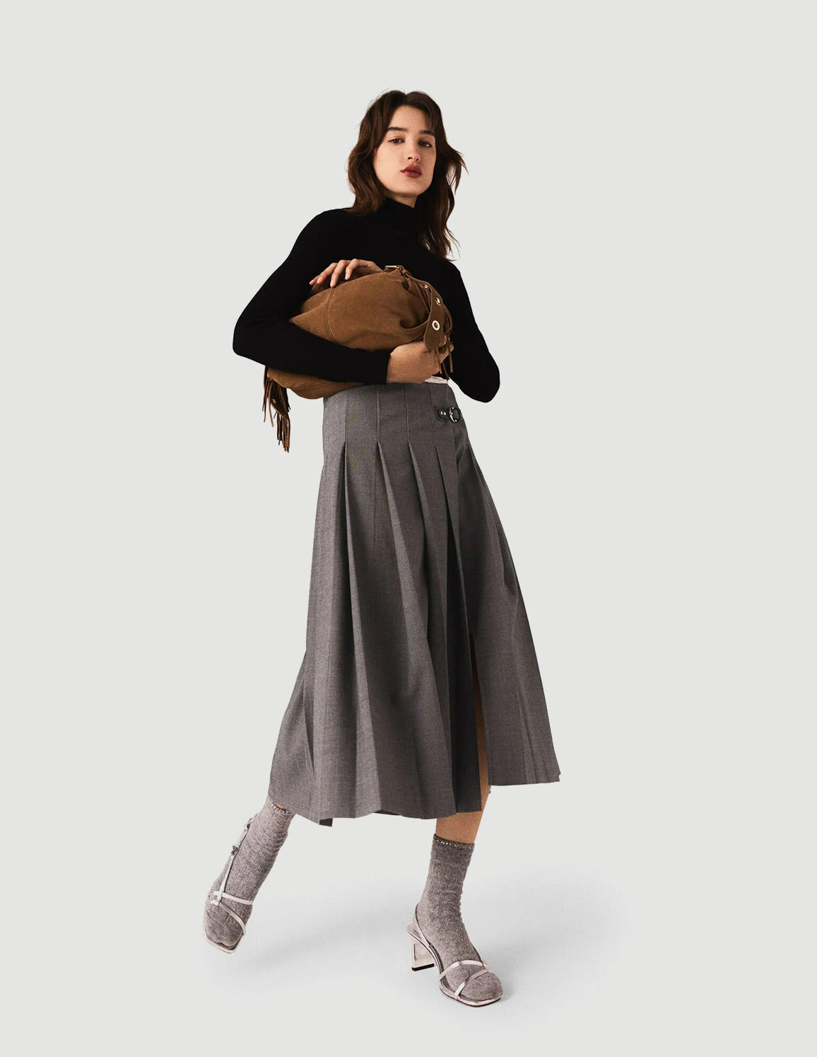 • Structured volume, tailoring details and elaborate finishes: this season, Maje is stylishly reinventing the wardrobe. This long wool skirt subtly plays on layering, and is the key piece in the collection.