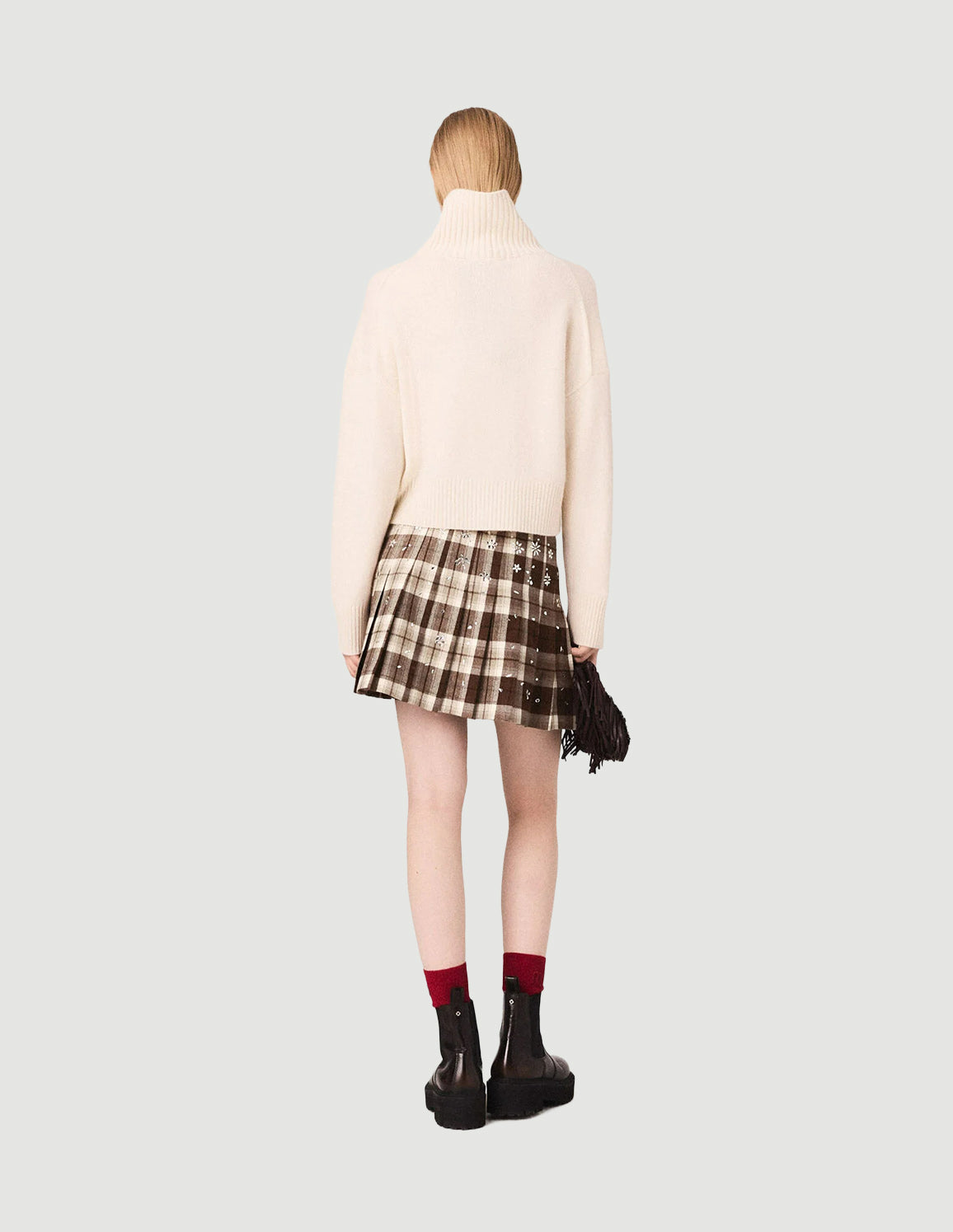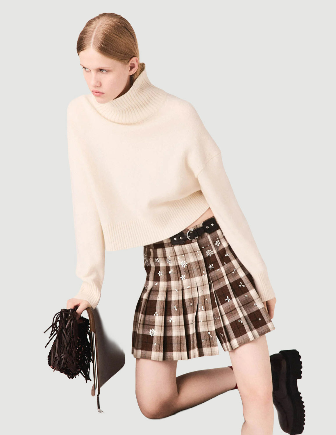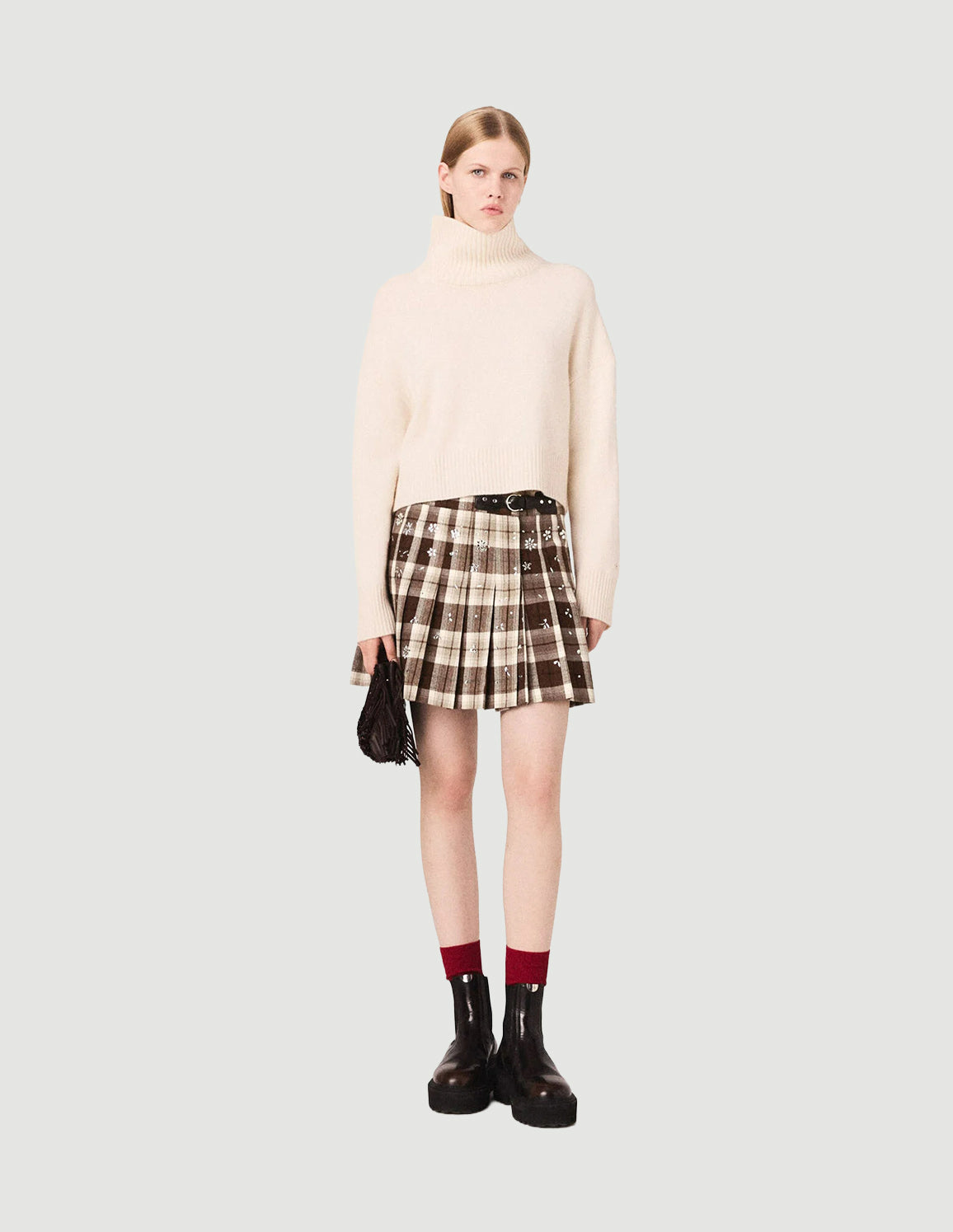 • This pleated skirt combines the texture of flannel with the sparkle of light-catching rhinestones. The regular pleats accentuate the graphic look, while the leather-effect buckle defines the waist and enhances the structure.