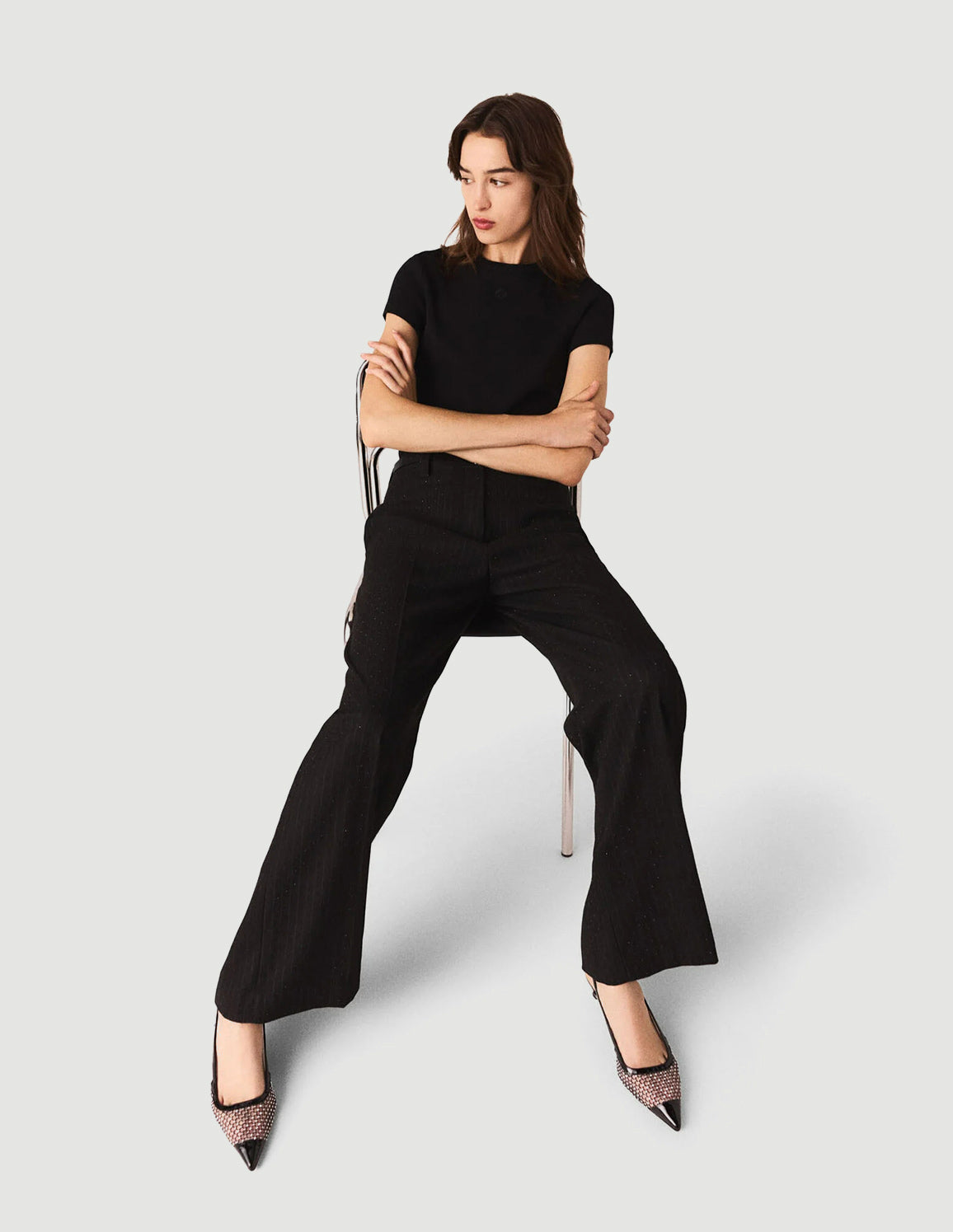 • Suit trousers, revisited with a touch of sparkle. Adorned with fine stripes highlighted by subtle rhinestones, they play on the contrast between masculine and feminine. Their wide cut elongates the figure, while the belt loops and discreet fastening define the waist.