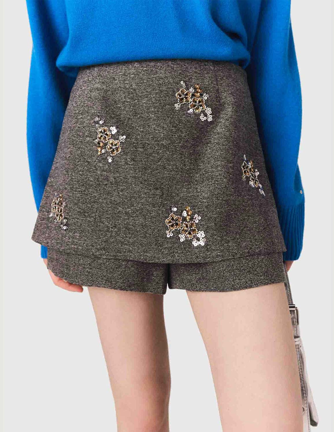 • Inspired by reinvented tailoring, these herringbone shorts play on contrasts of texture and light. Their graphic cut is enhanced with sequin-embroidered patches, crafted in the Maje workshops for a subtle and refined effect.
