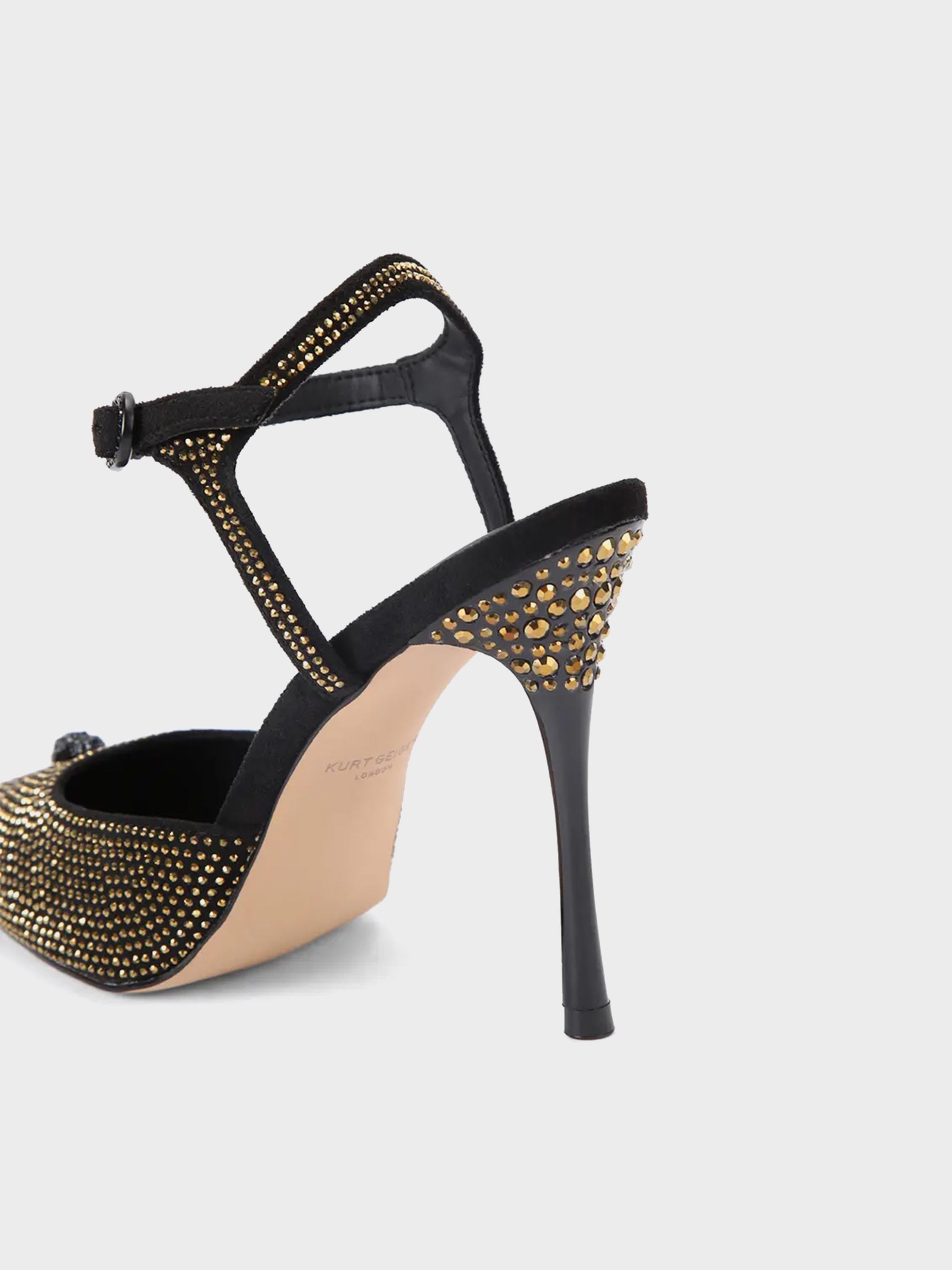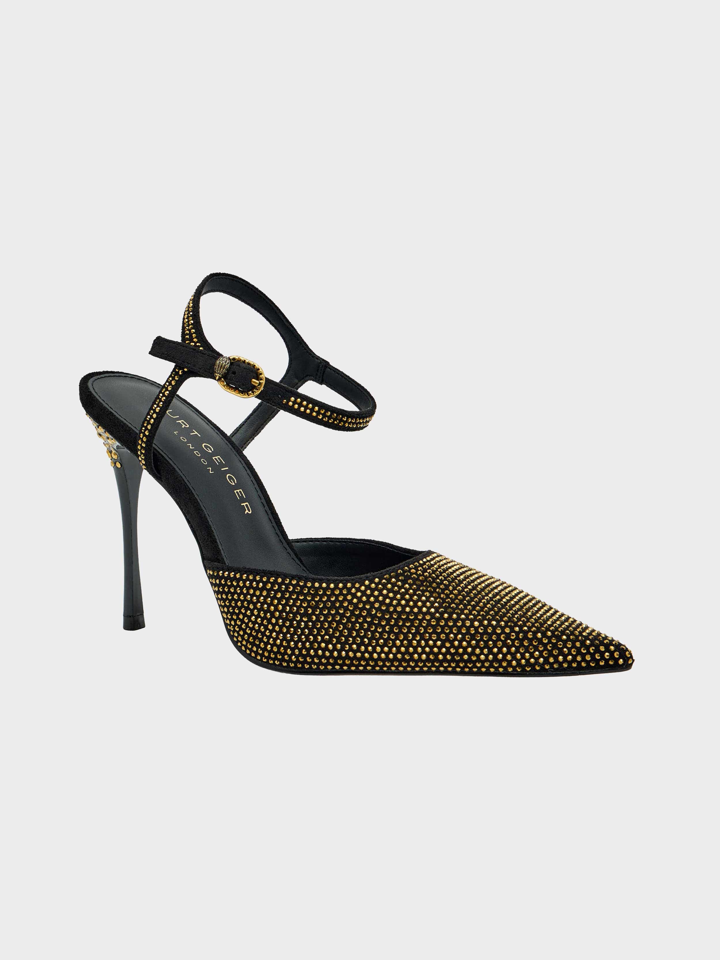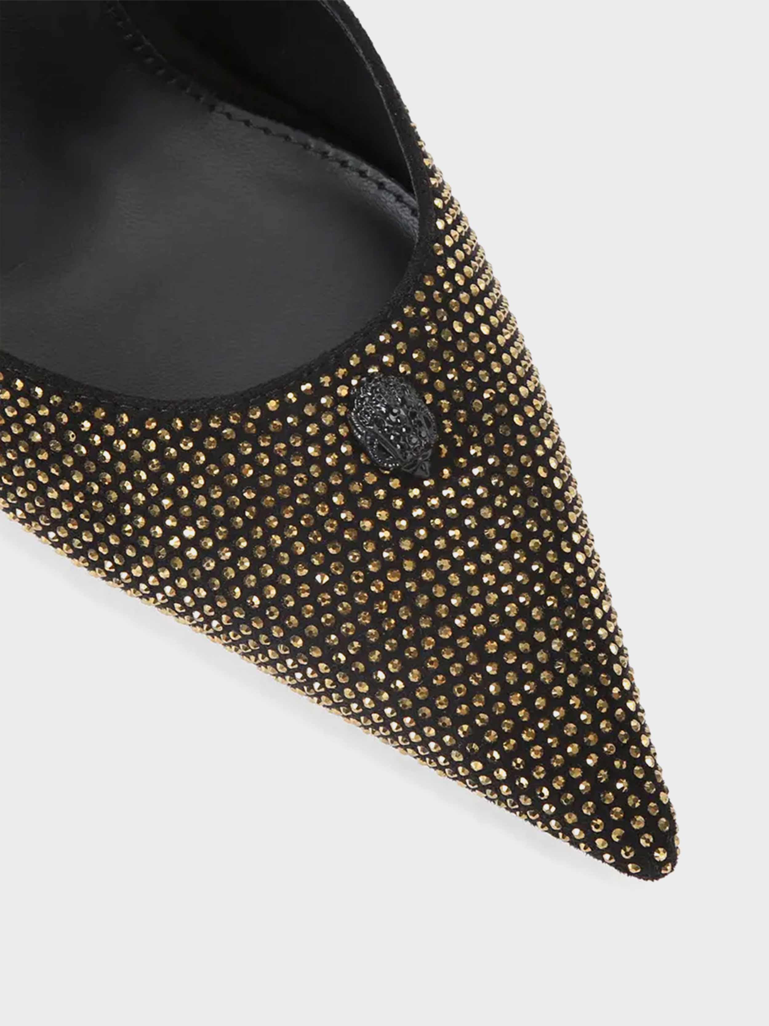 • This Eagle Point ankle strap is made of black microsuede with gold crystal embellishment on the pointed toe.