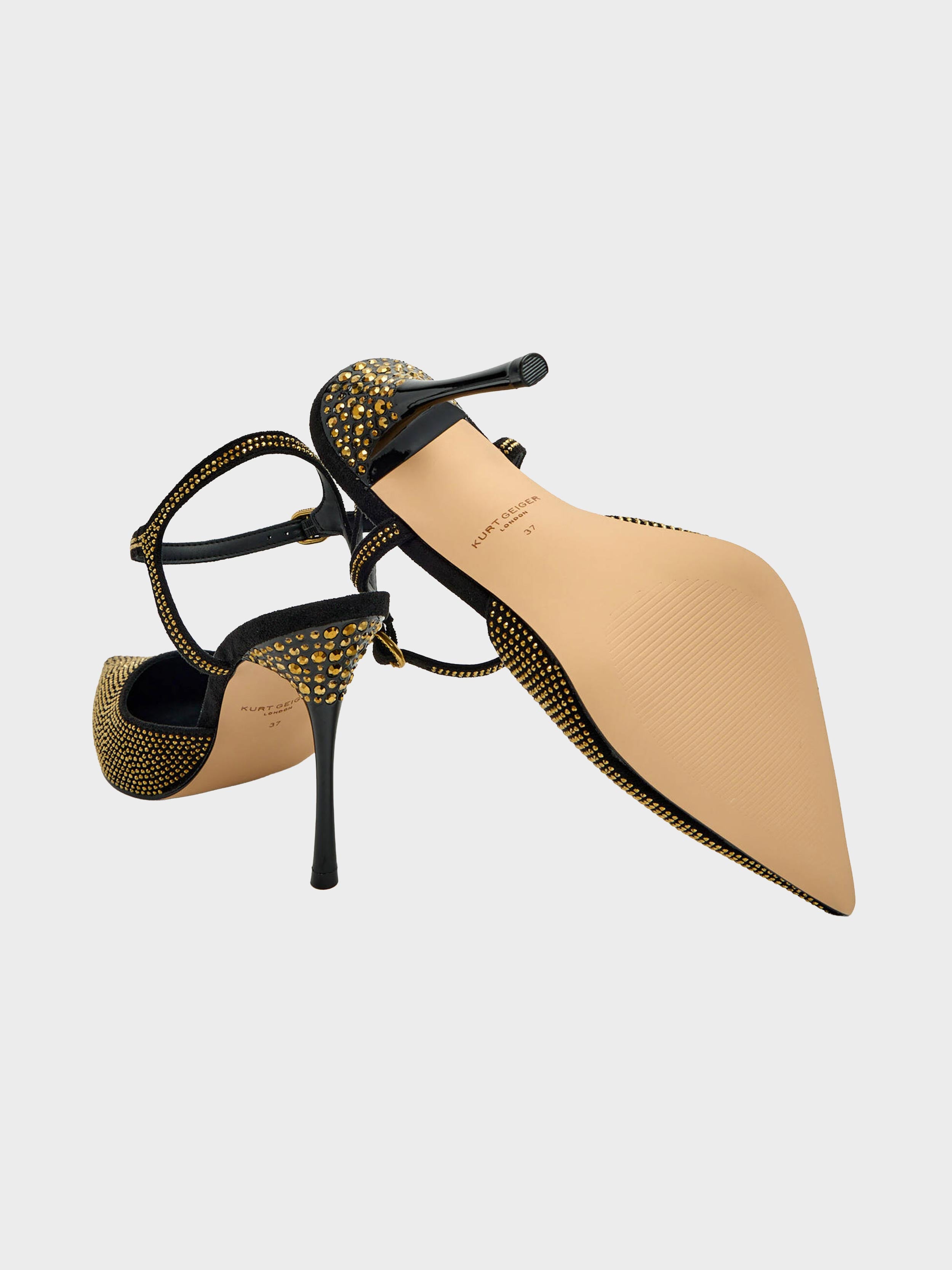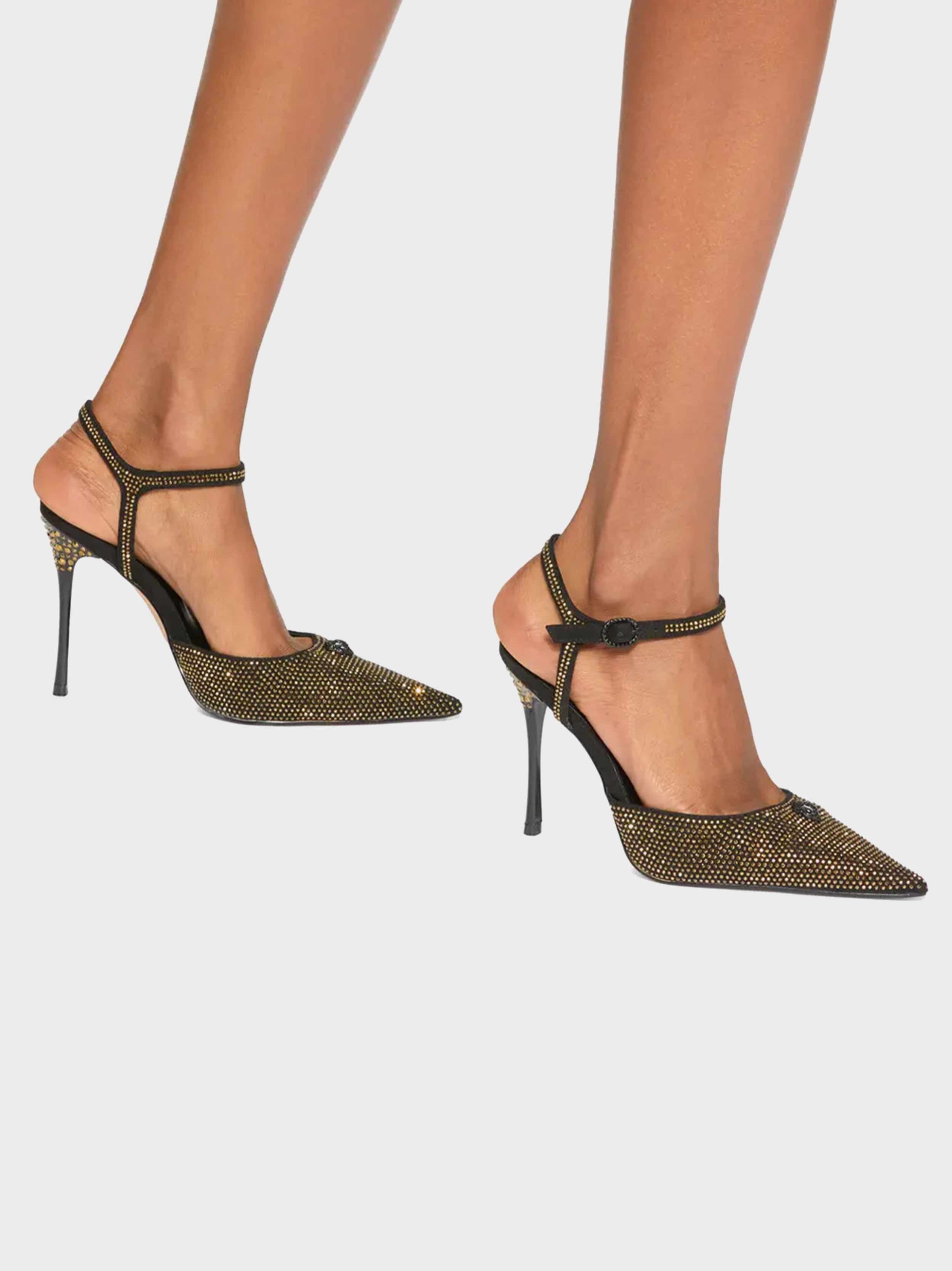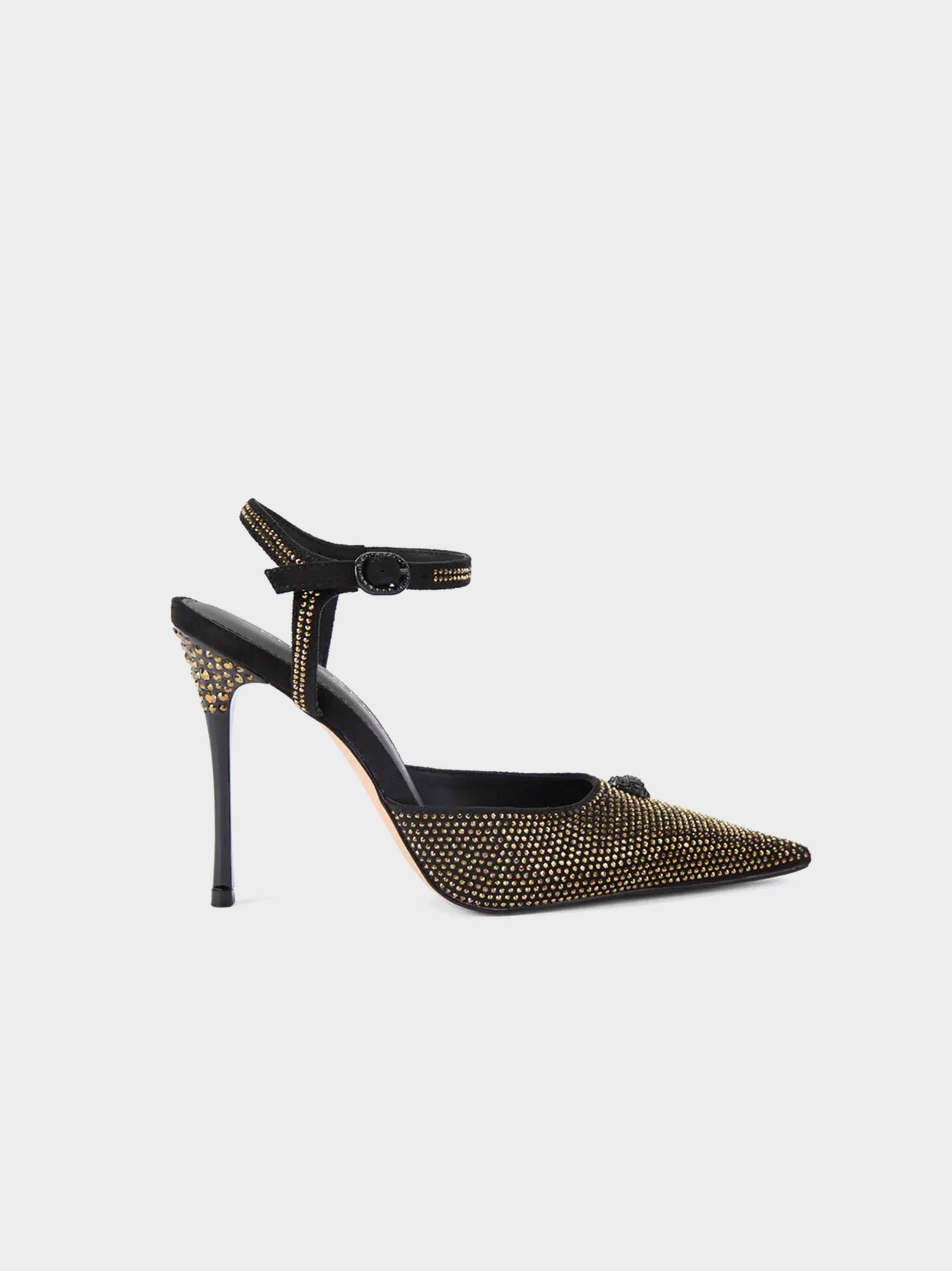 • This Eagle Point ankle strap is made of black microsuede with gold crystal embellishment on the pointed toe.
