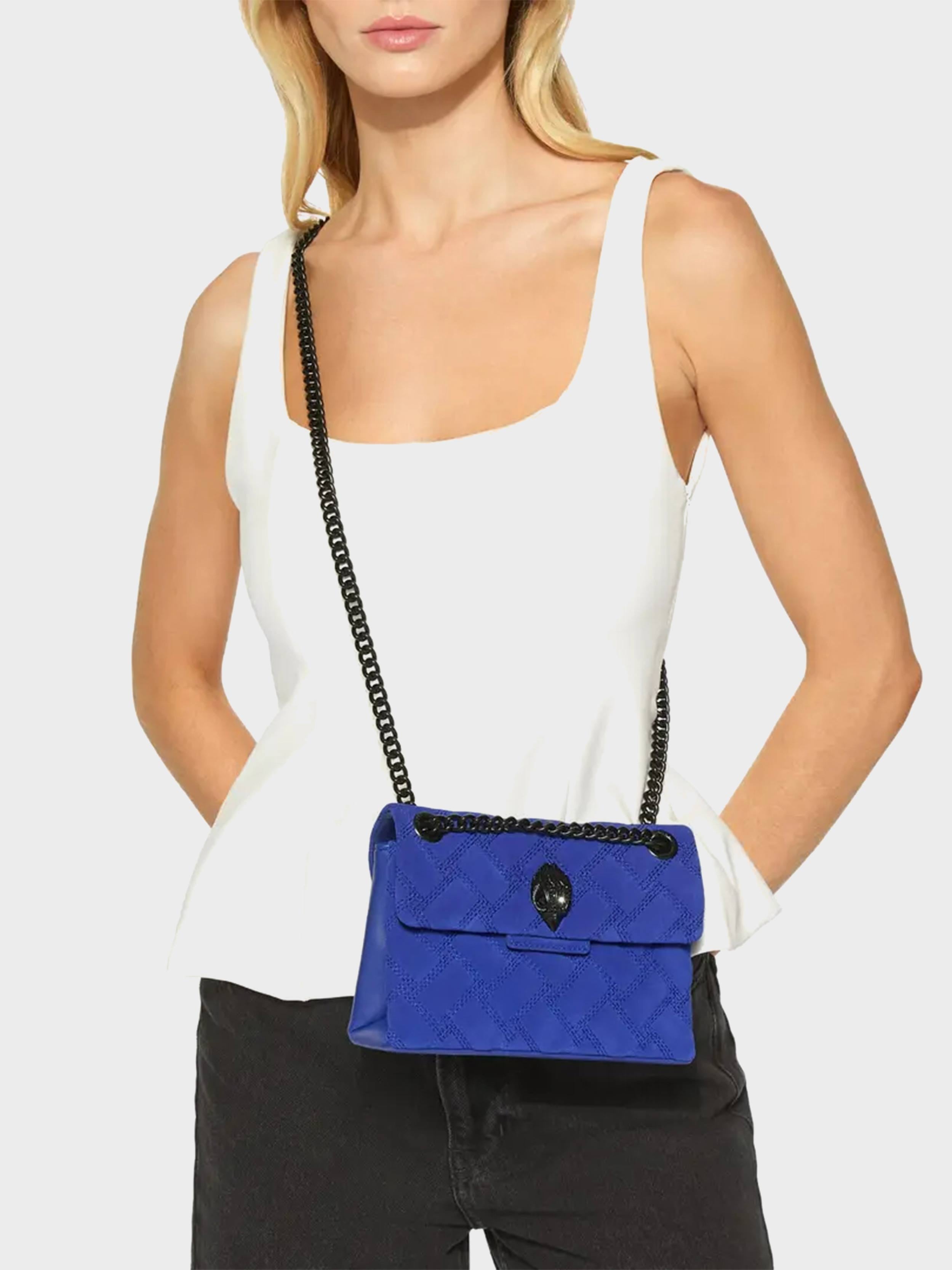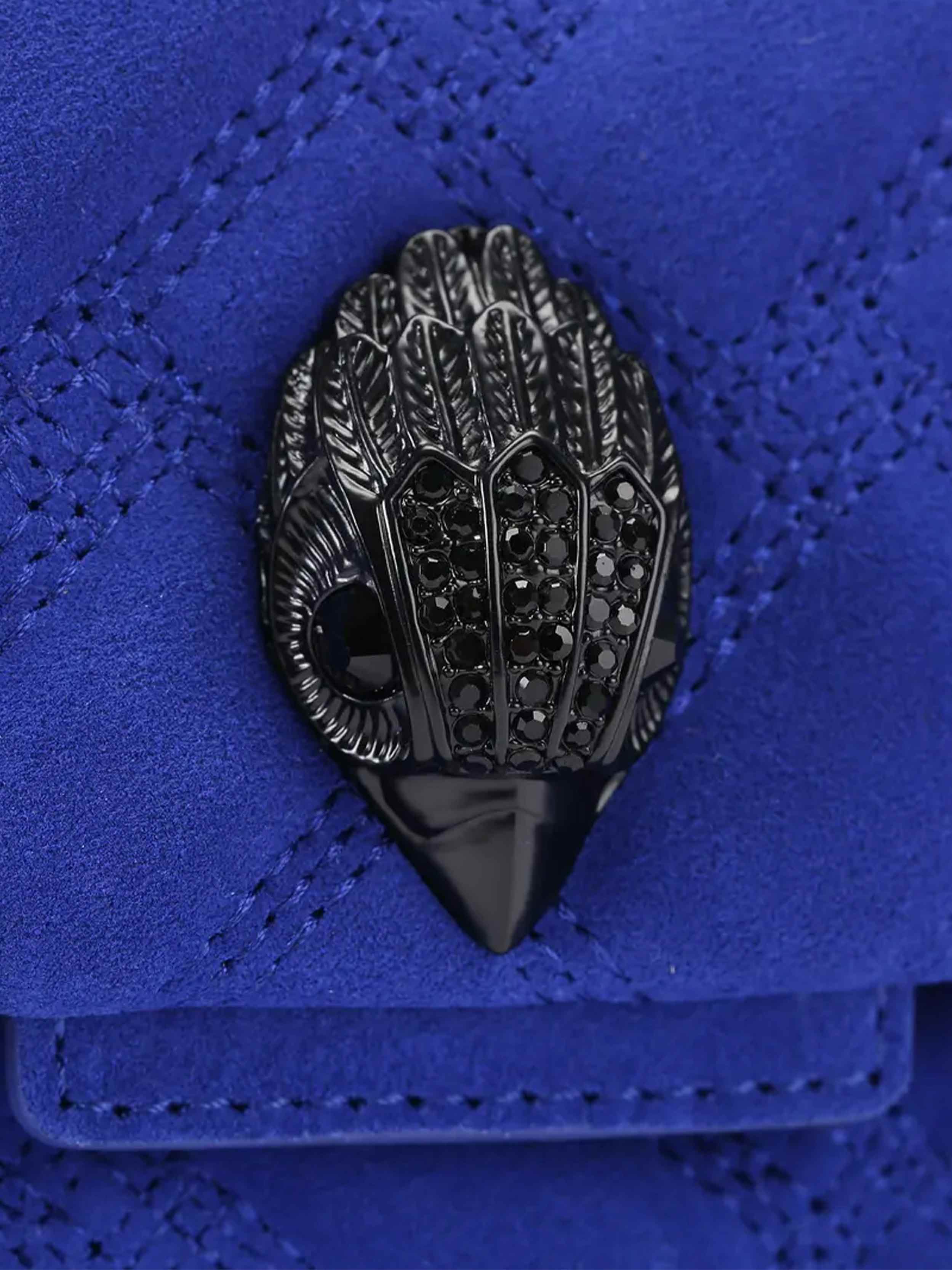 • The Leather Mini Kensington Bag is crafted from a blue suede leather. The black eagle head features all over feather detail on the front flap.