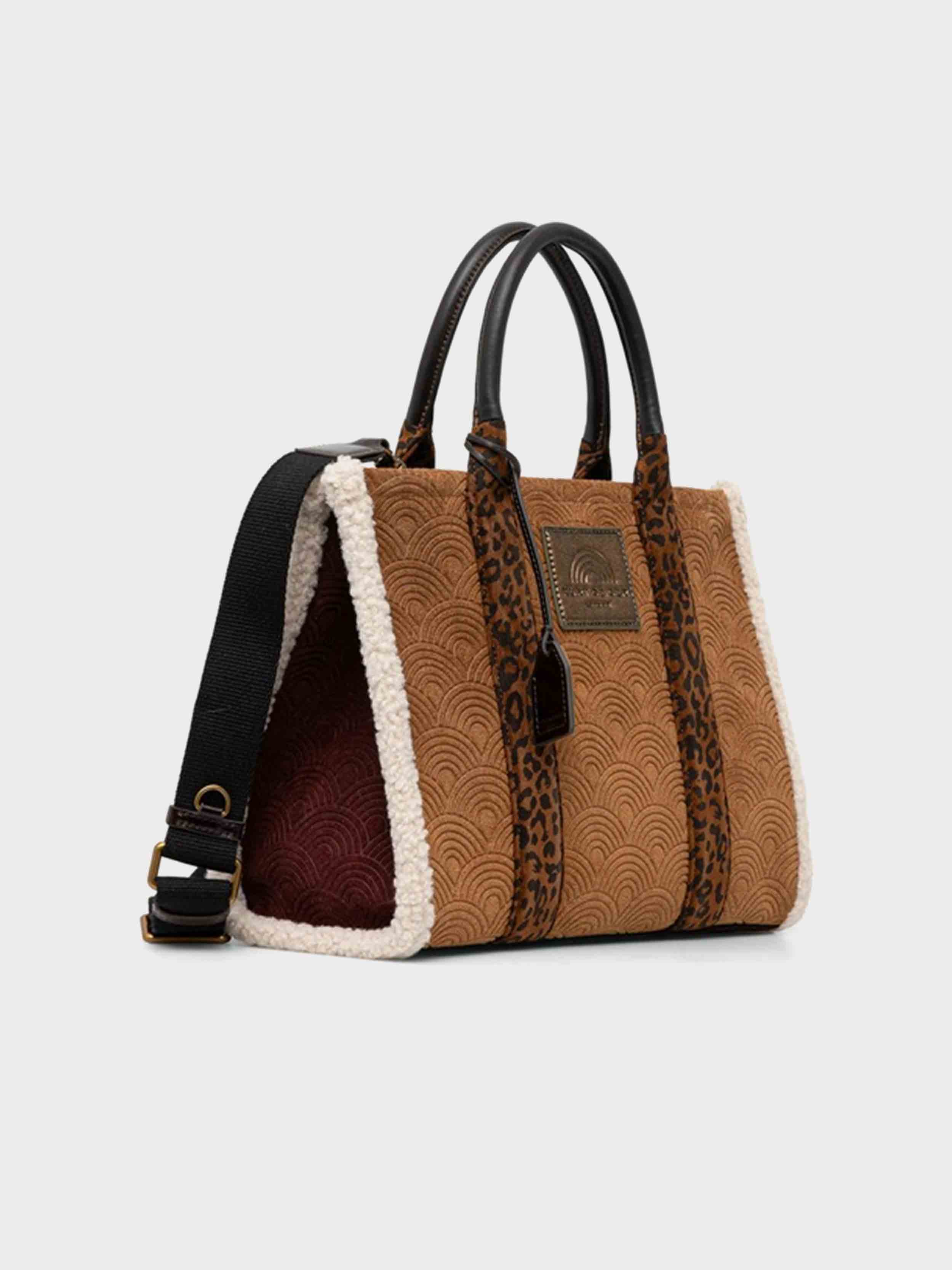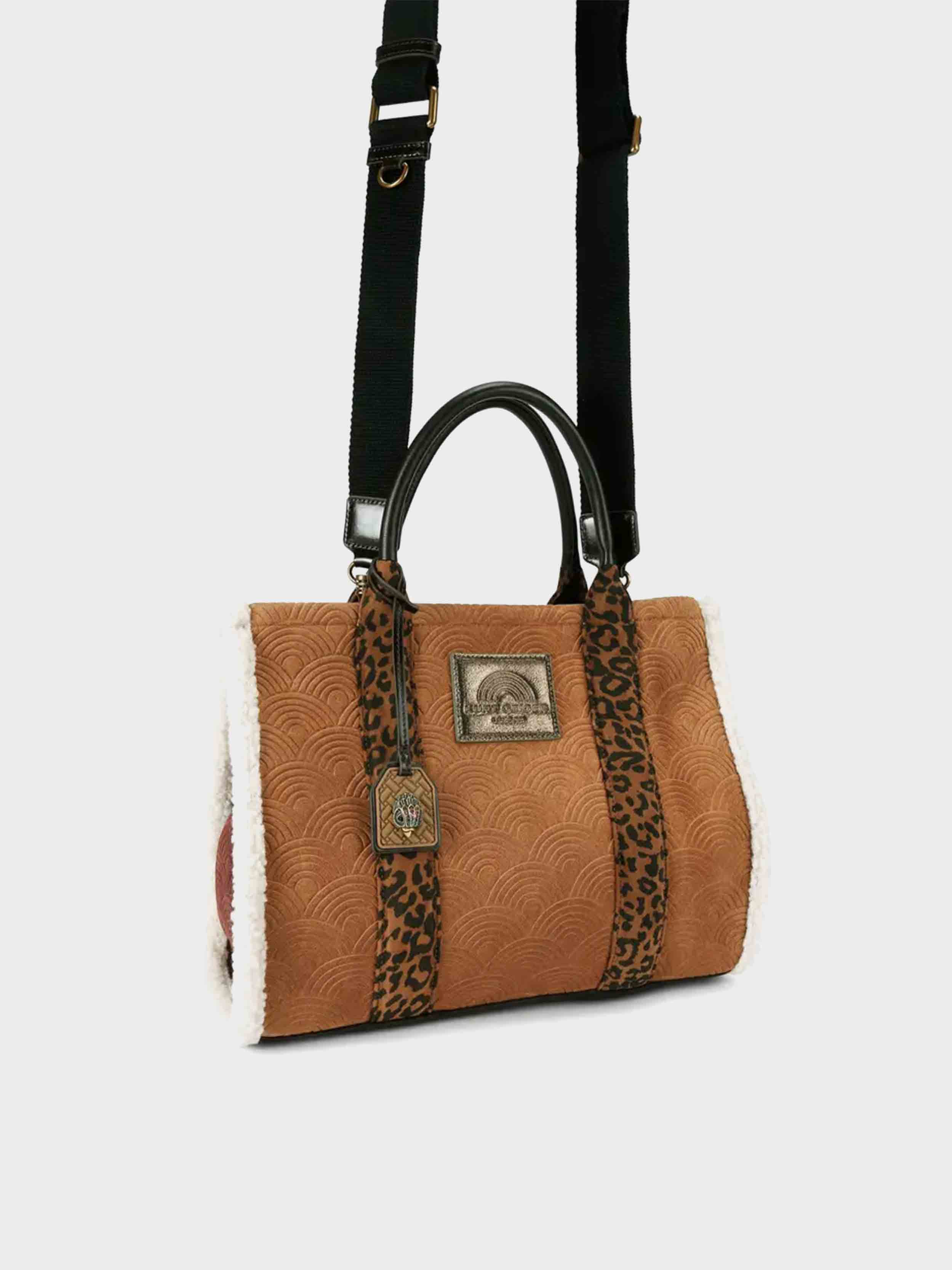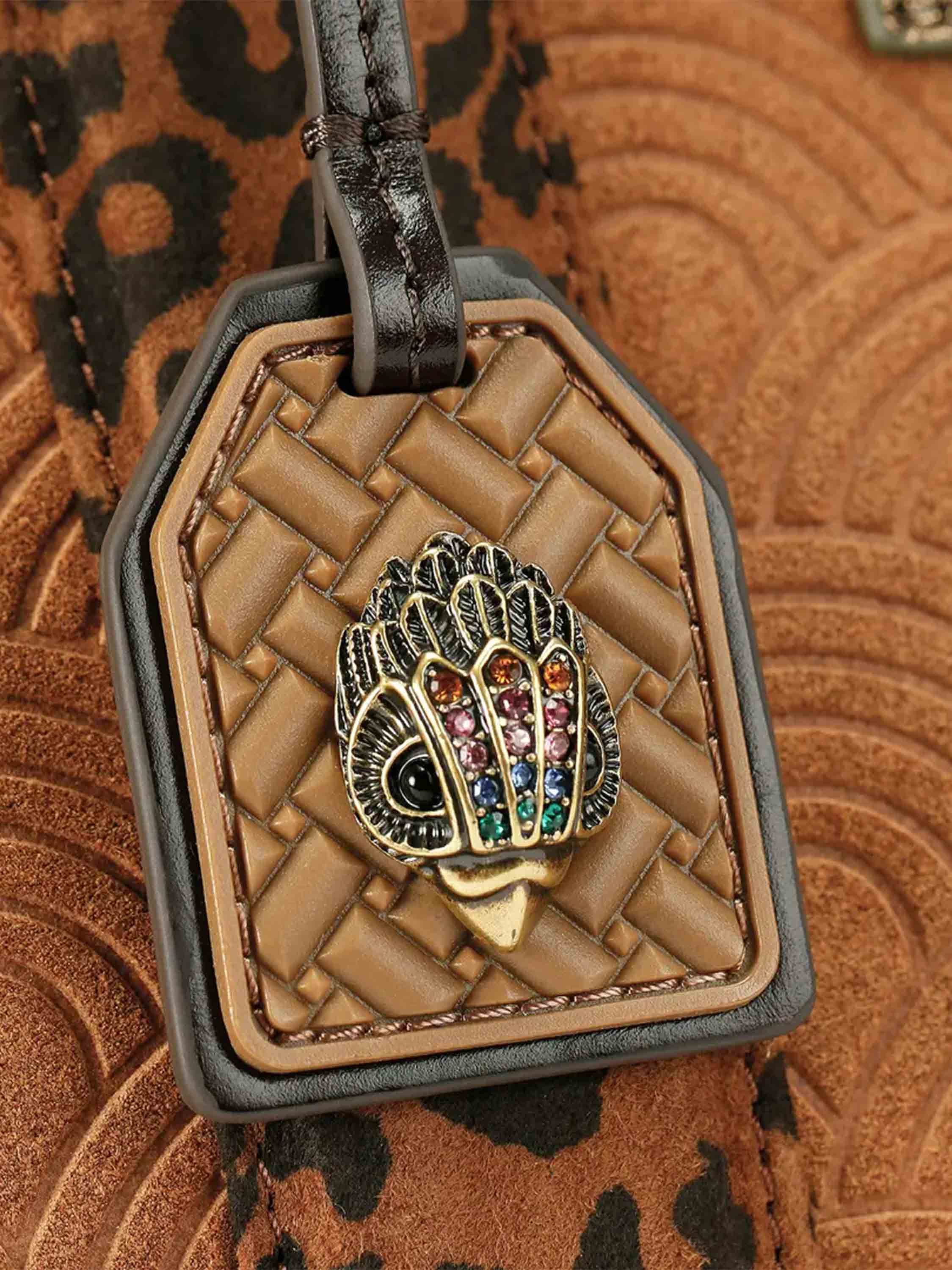 • The Southbank Tote is crafted from a brown suede leather with rainbow pattern and Borg trims. There are metallic gold trims as well as an antiqued brass eagle head with rainbow crystals on the luggage tab.