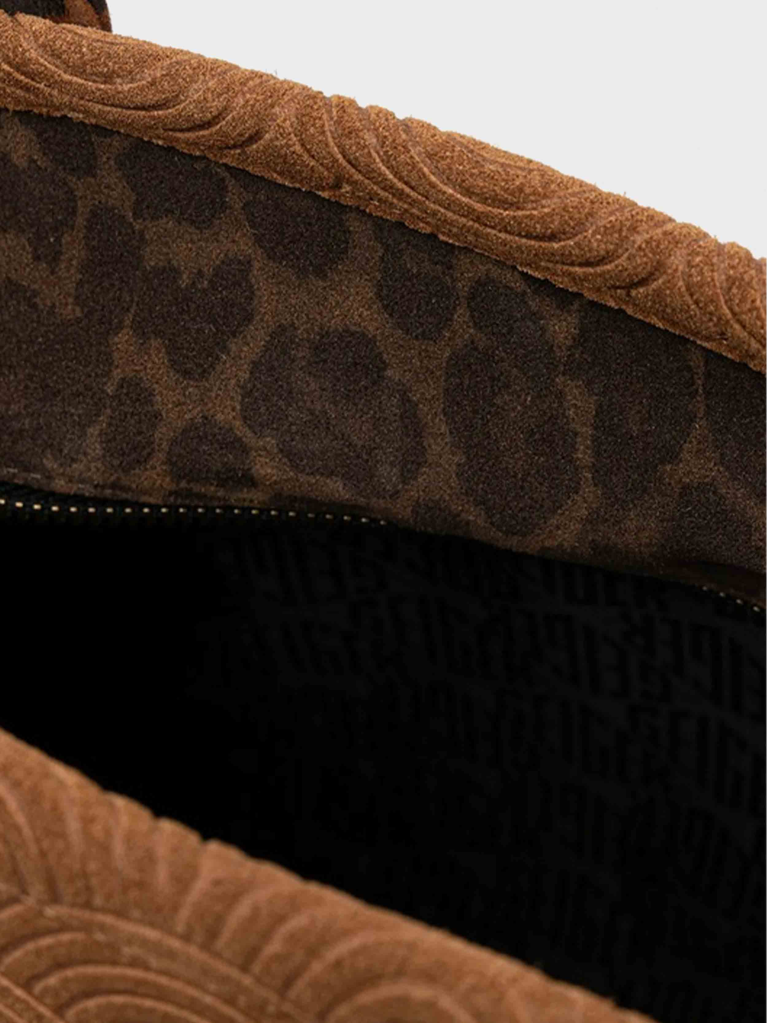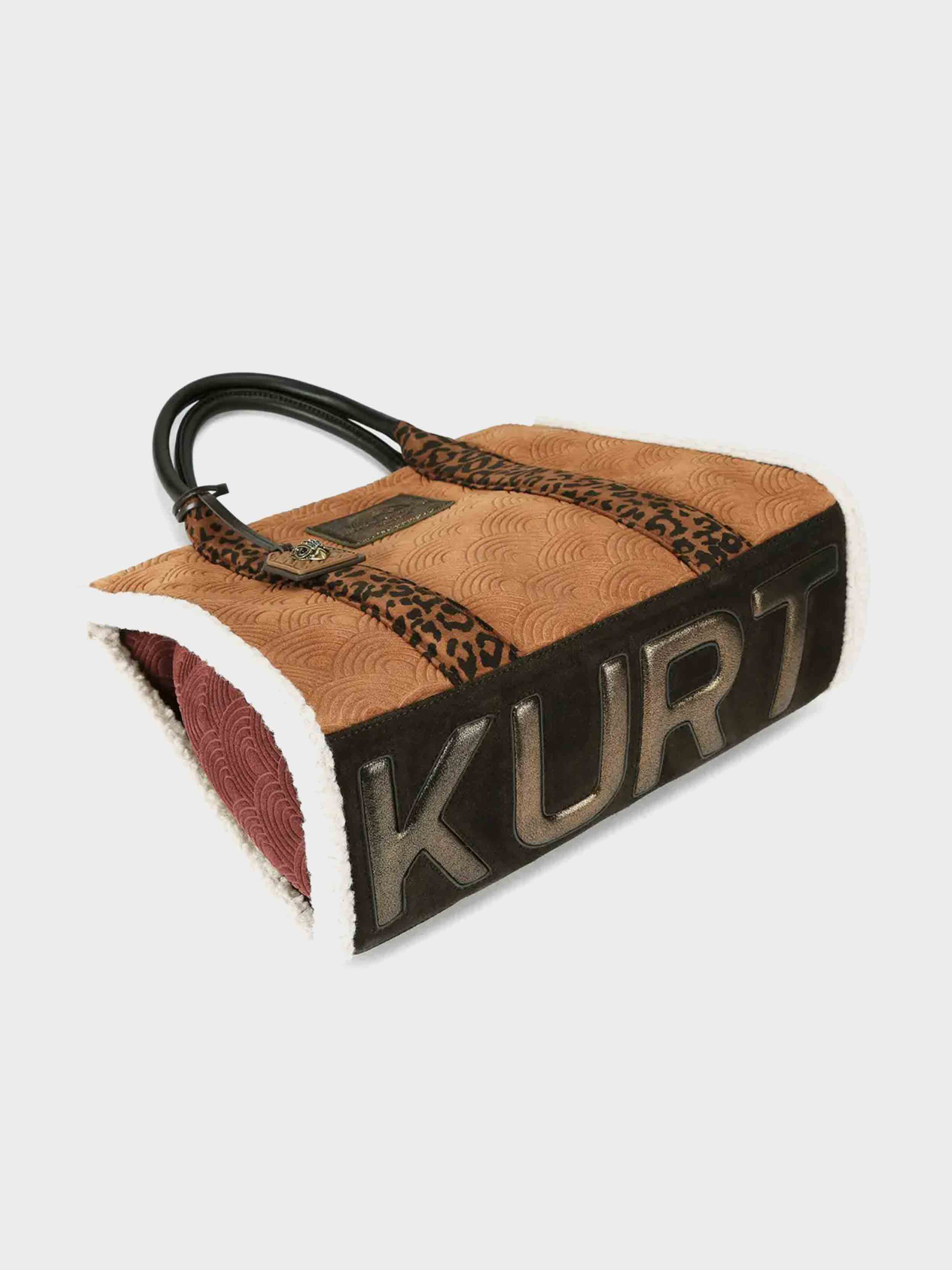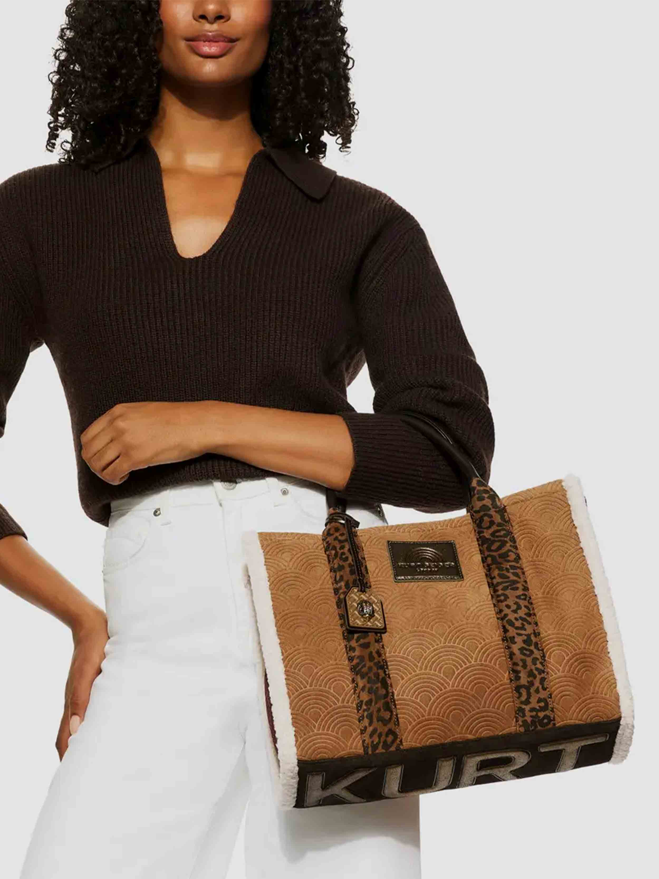 • The Southbank Tote is crafted from a brown suede leather with rainbow pattern and Borg trims. There are metallic gold trims as well as an antiqued brass eagle head with rainbow crystals on the luggage tab.