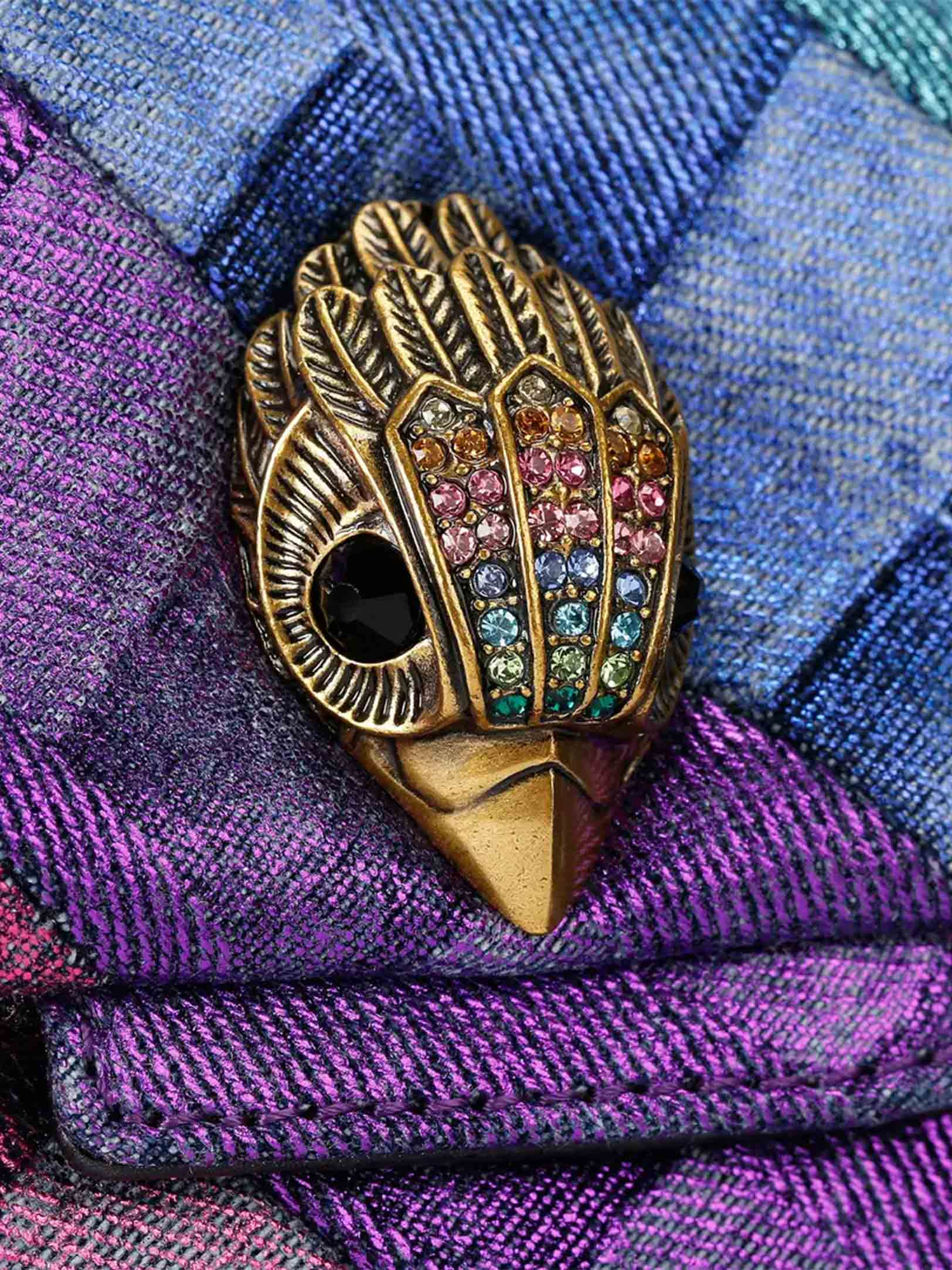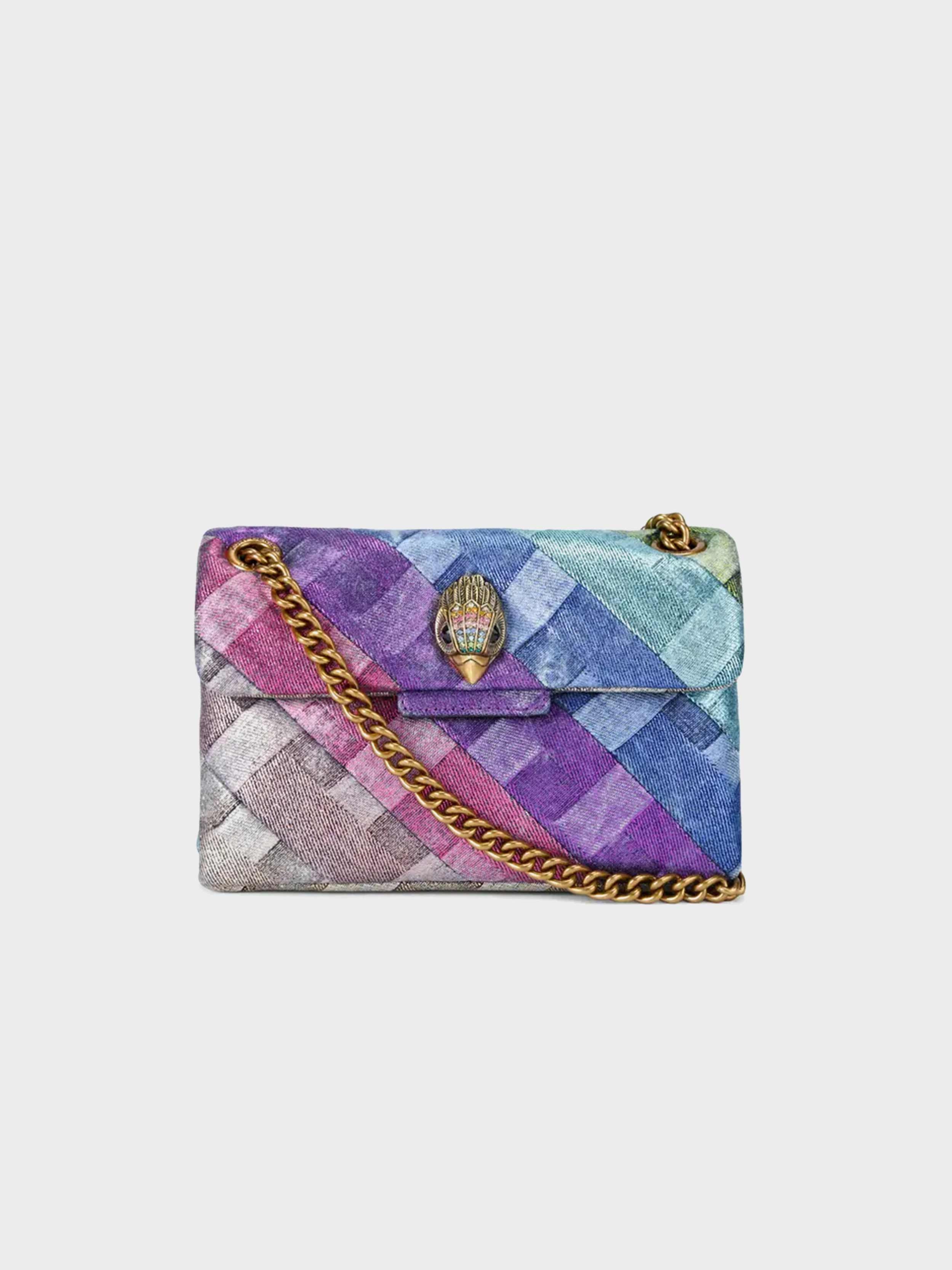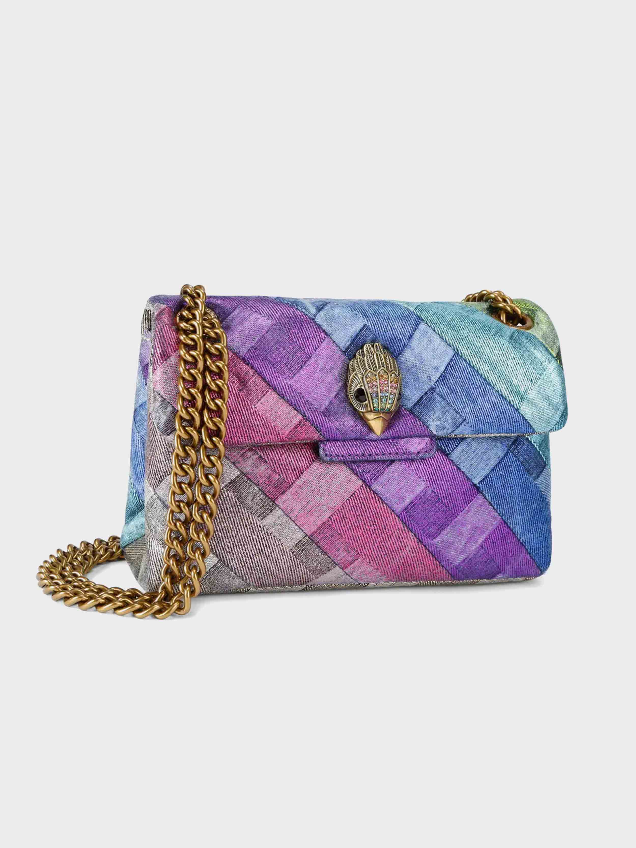 • This Mini Kensington bag is crafted from a washed denim in weave print with gold foil. The antiqued brass eagle head features crystals on the front flap.