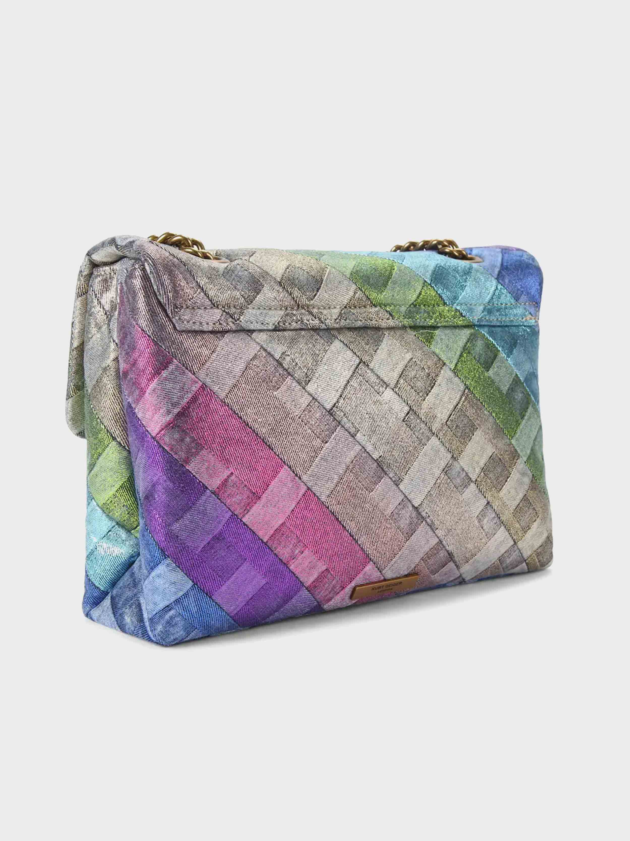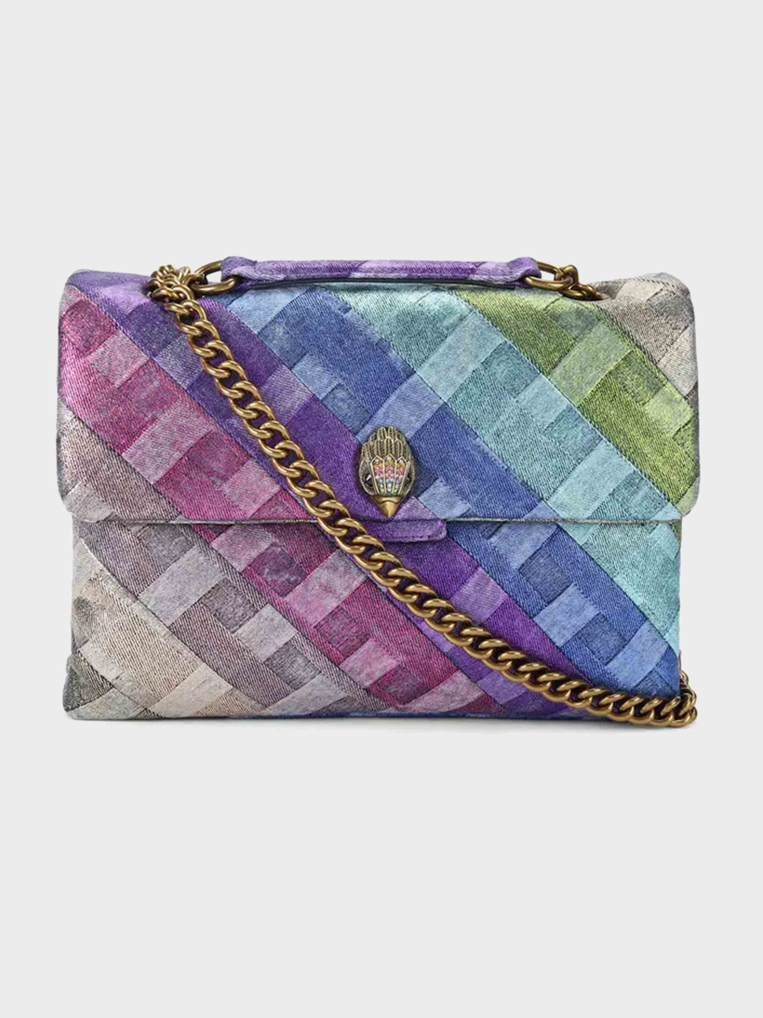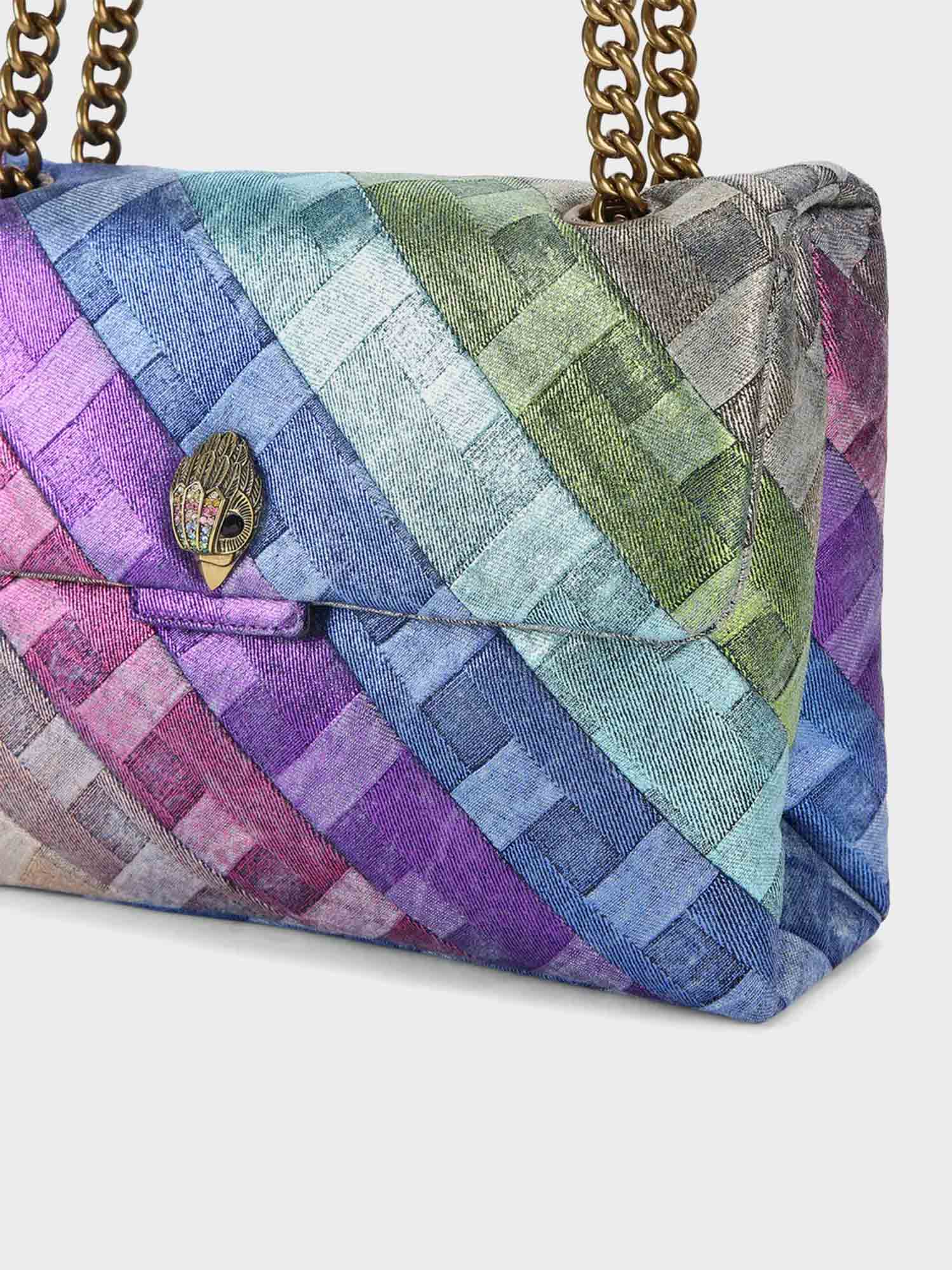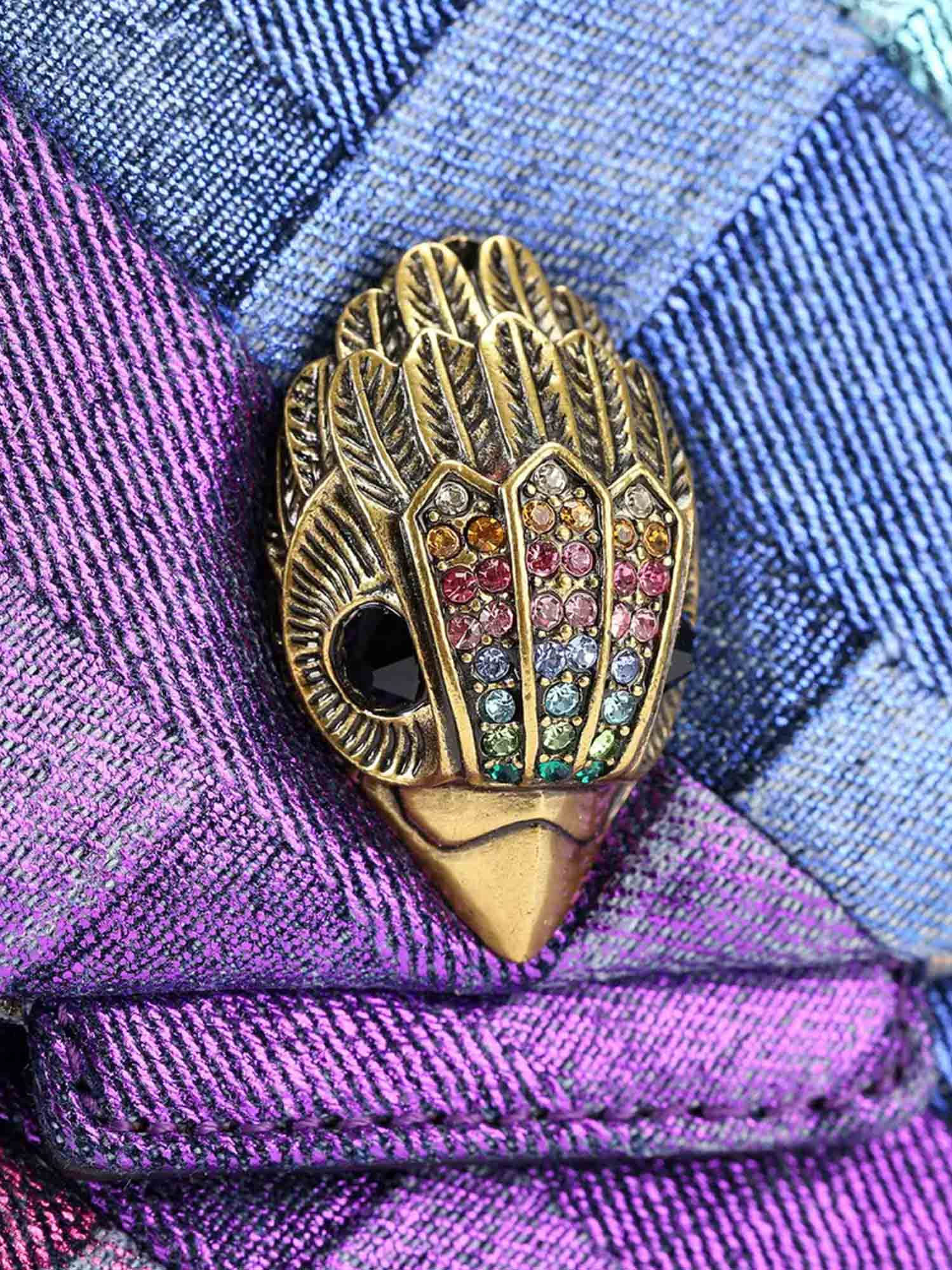 • The Kensington Soft is crafted from a rainbow weave striped denim with gold foil embellishment. The antiqued brass eagle head features crystals and crystal eyes on the front flap.