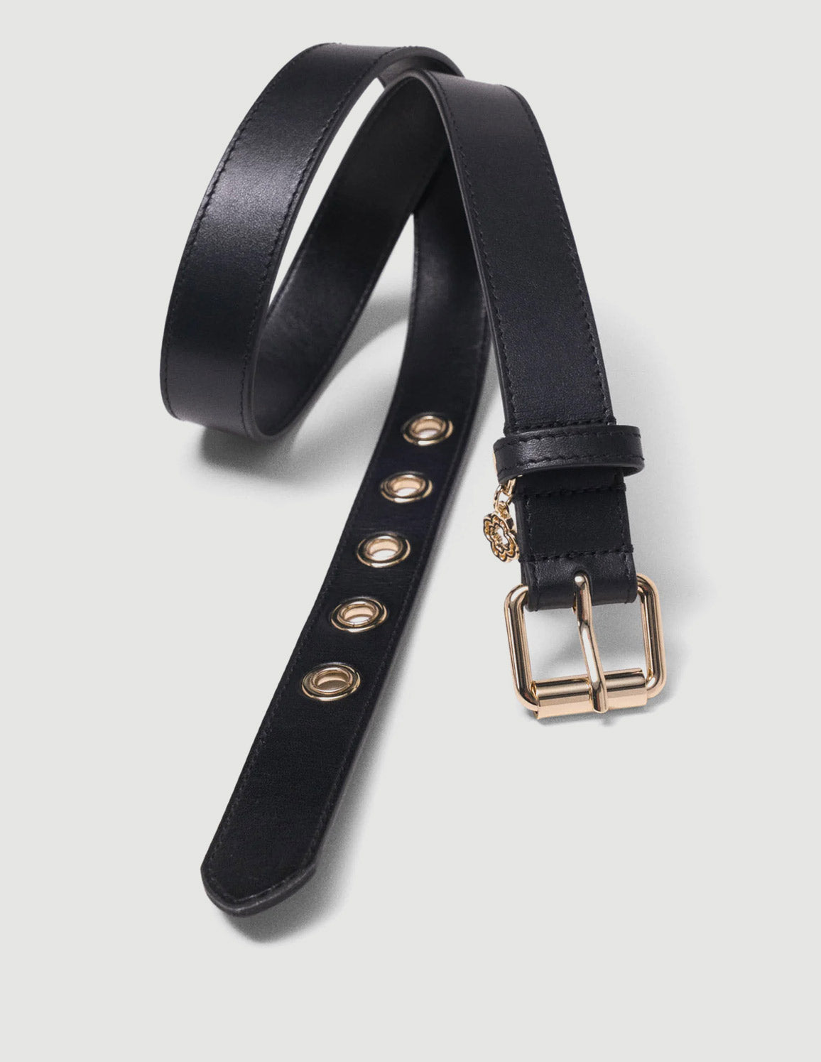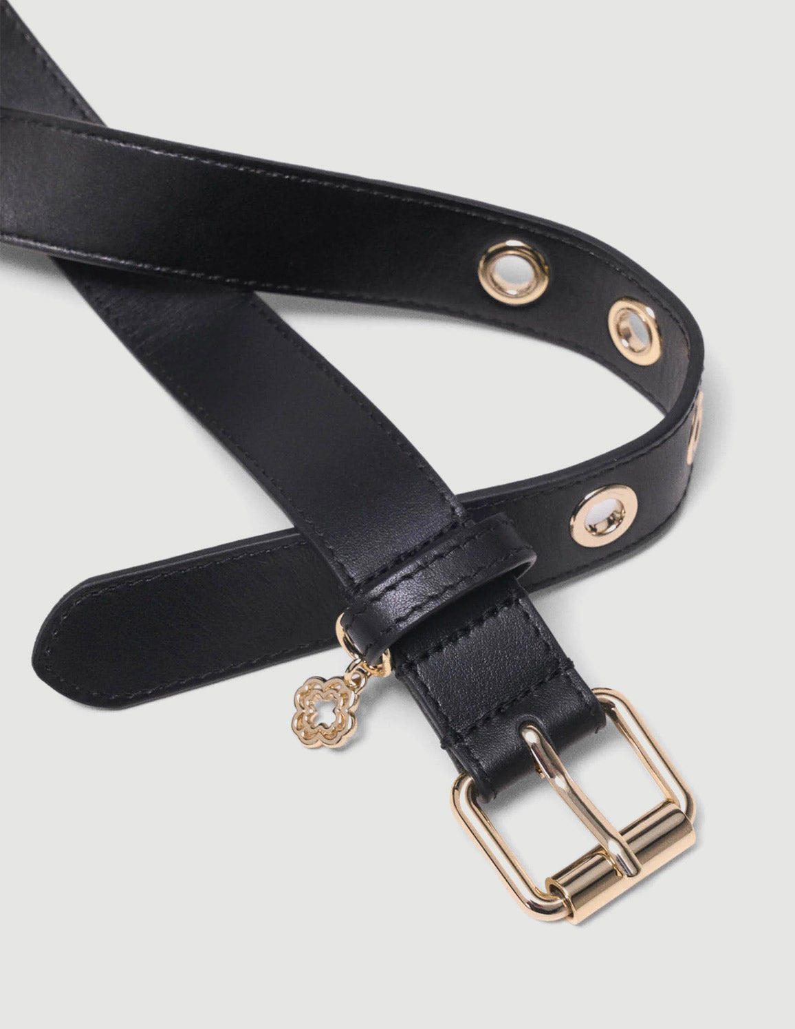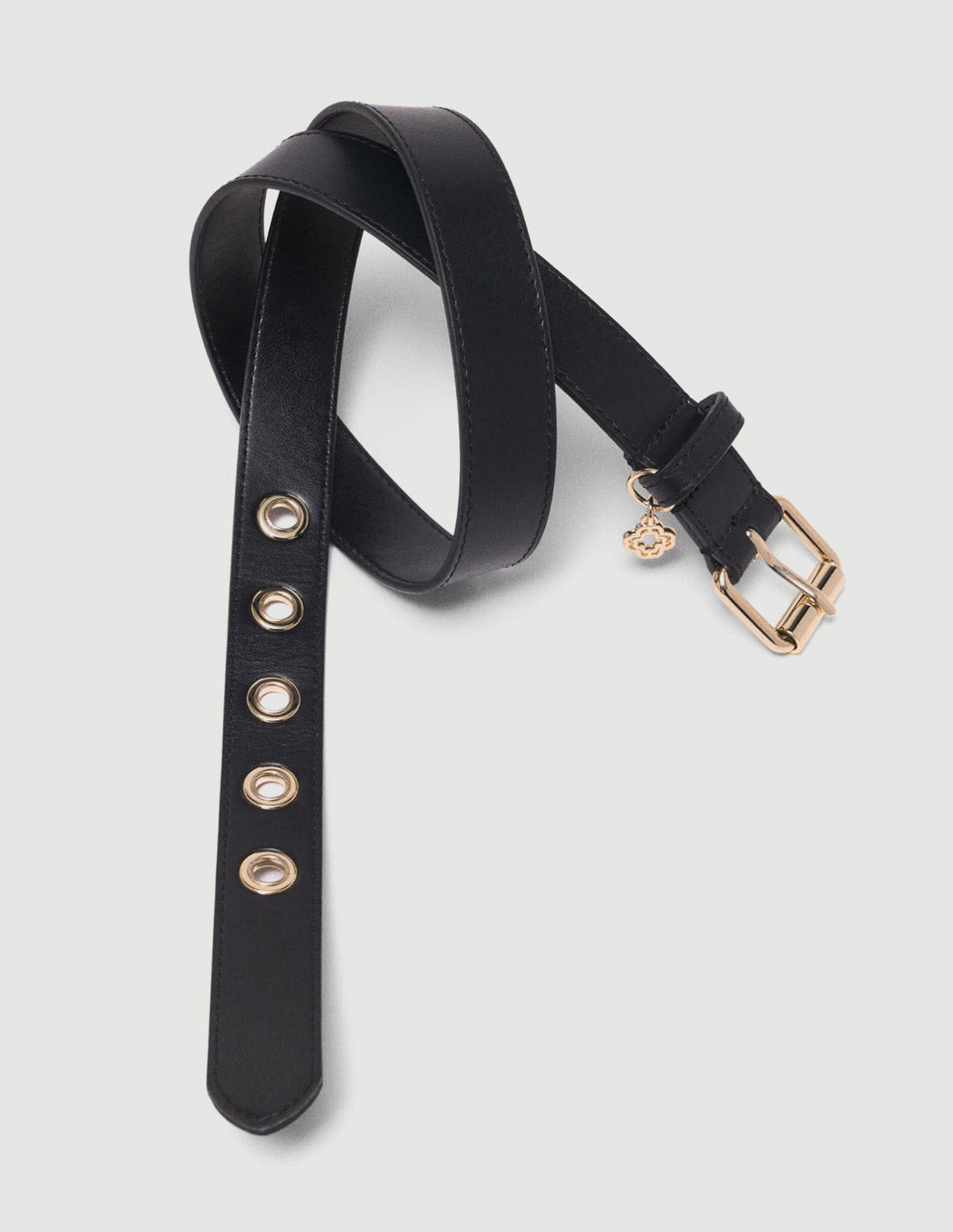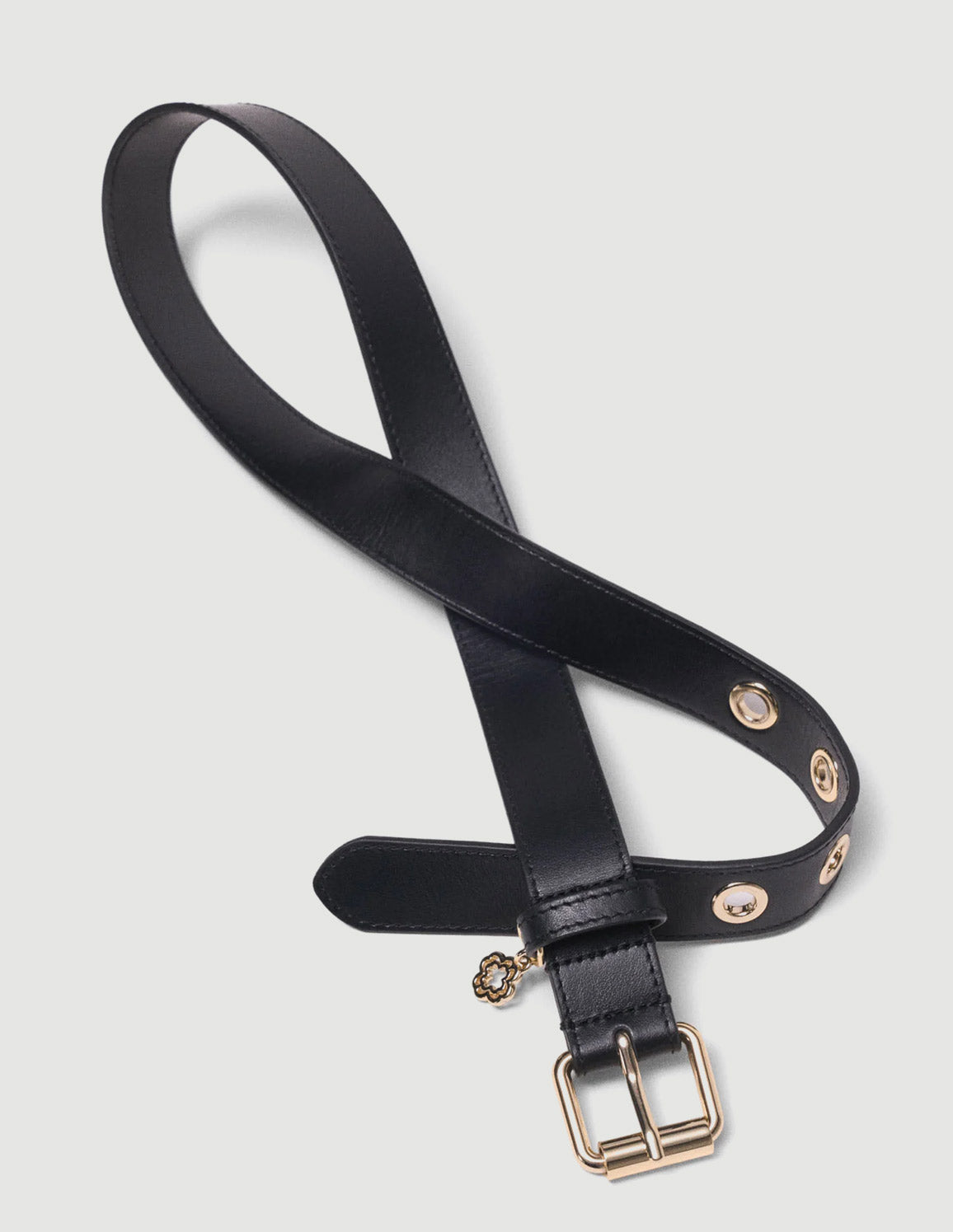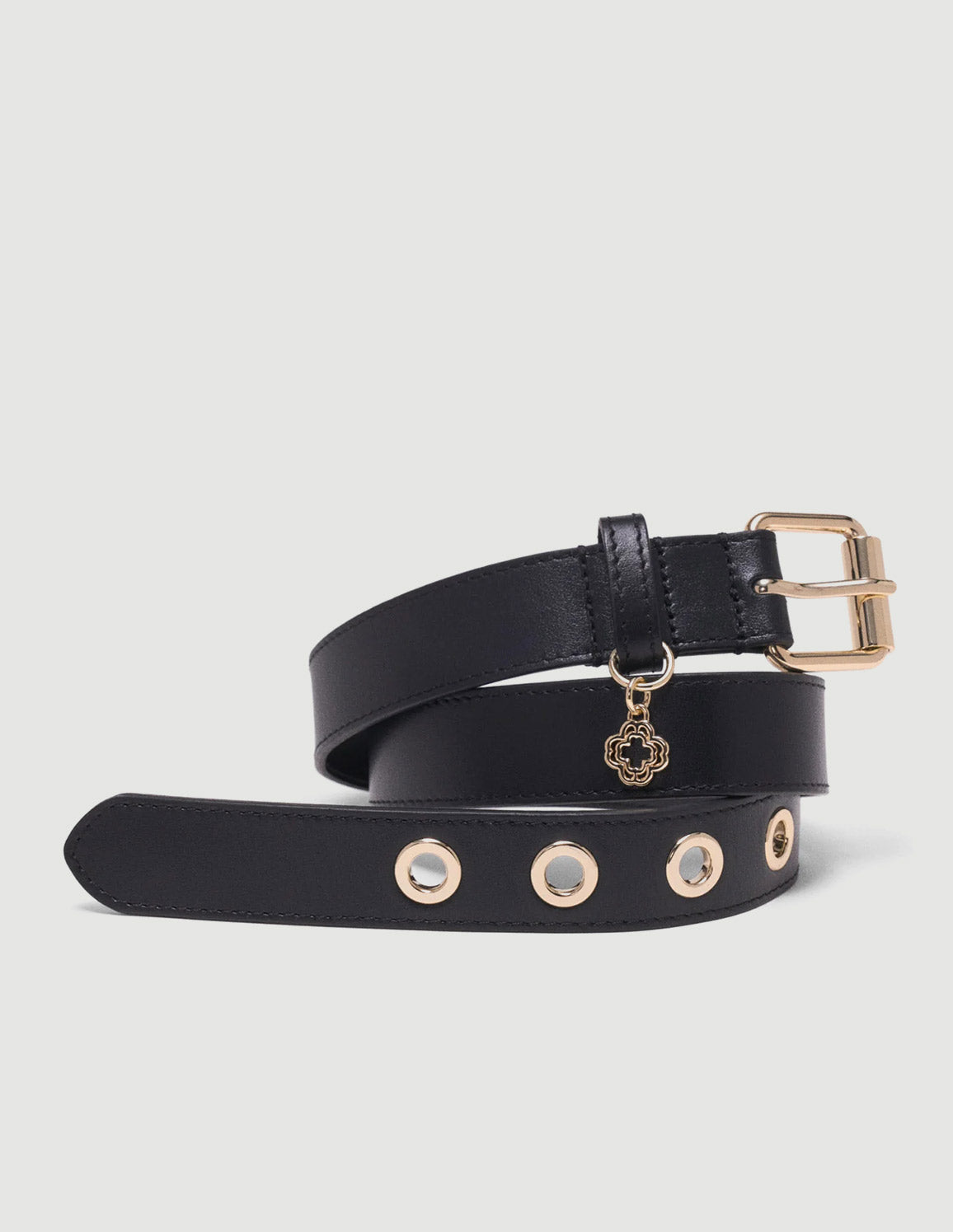 • This smooth black leather belt is distinguished by a gold rectangular buckle, large metal eyelets and an openwork Clover charm that give the strap a modern touch.