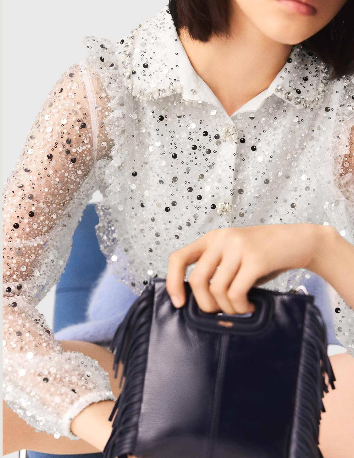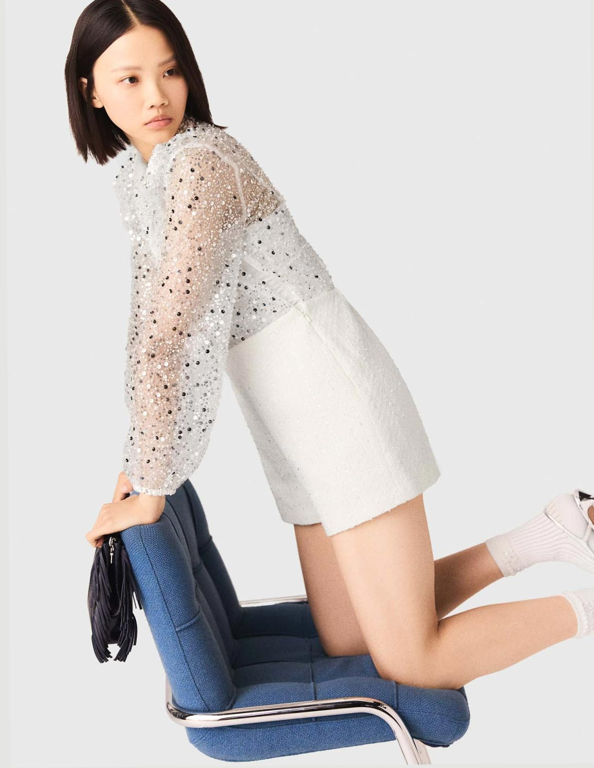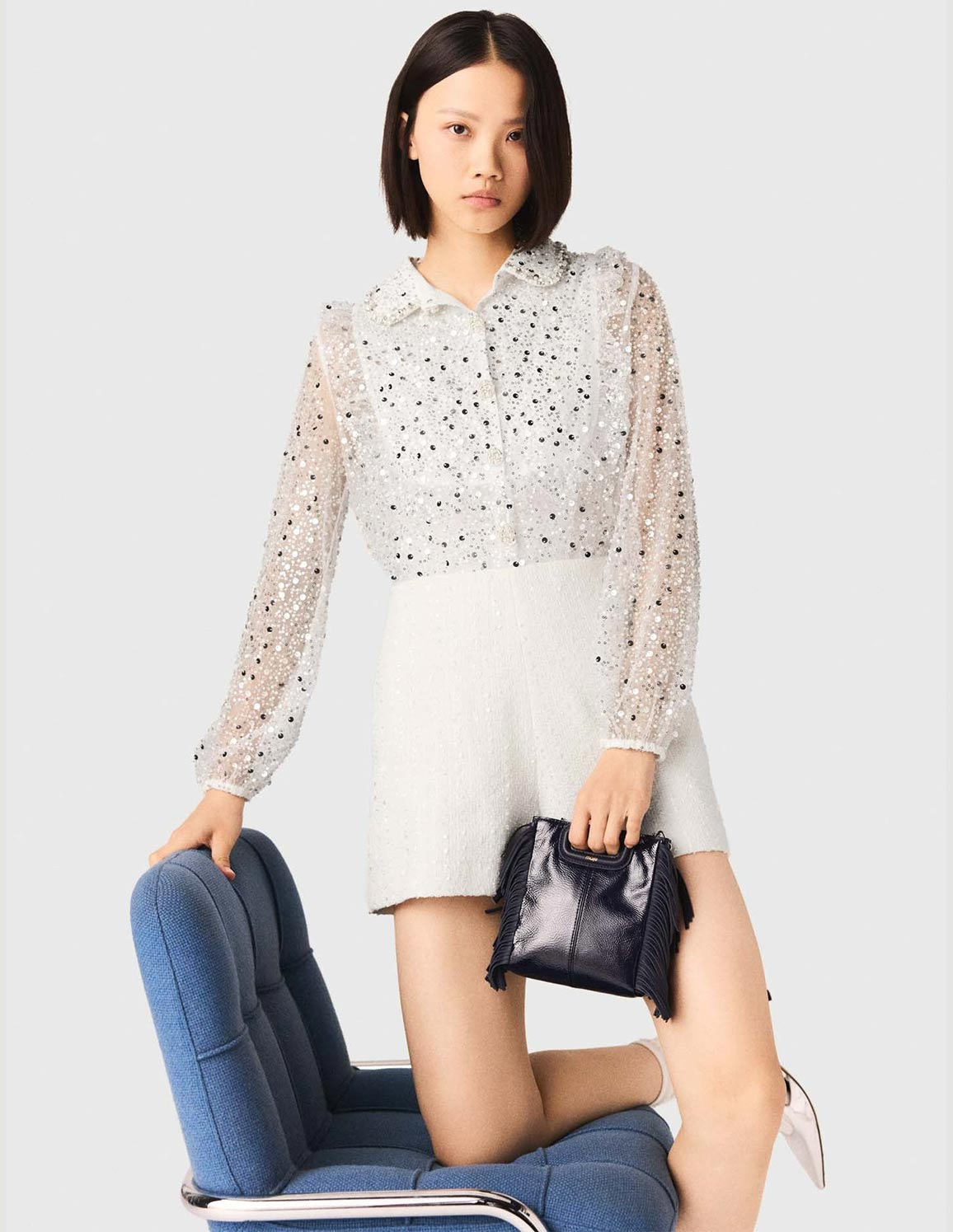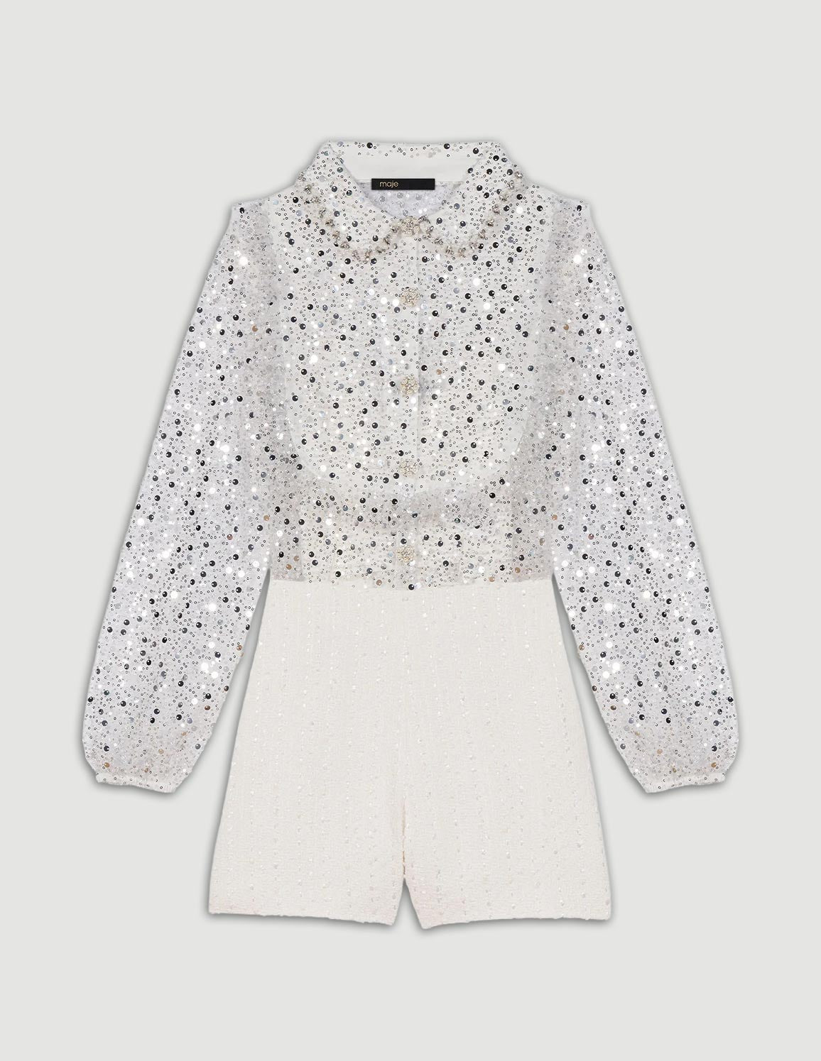 • This playsuit combines a transparent tulle top with silver and black sequins with bright ecru tweed shorts for an ultra-graphic, textured look. The top is enhanced by an intricate collar with rhinestones and pearls and a fine tulle ruffle surrounding the button placket with its jewellery buttons. An invisible zip fastening on the side and a built-in lining add extra comfort to the piece.