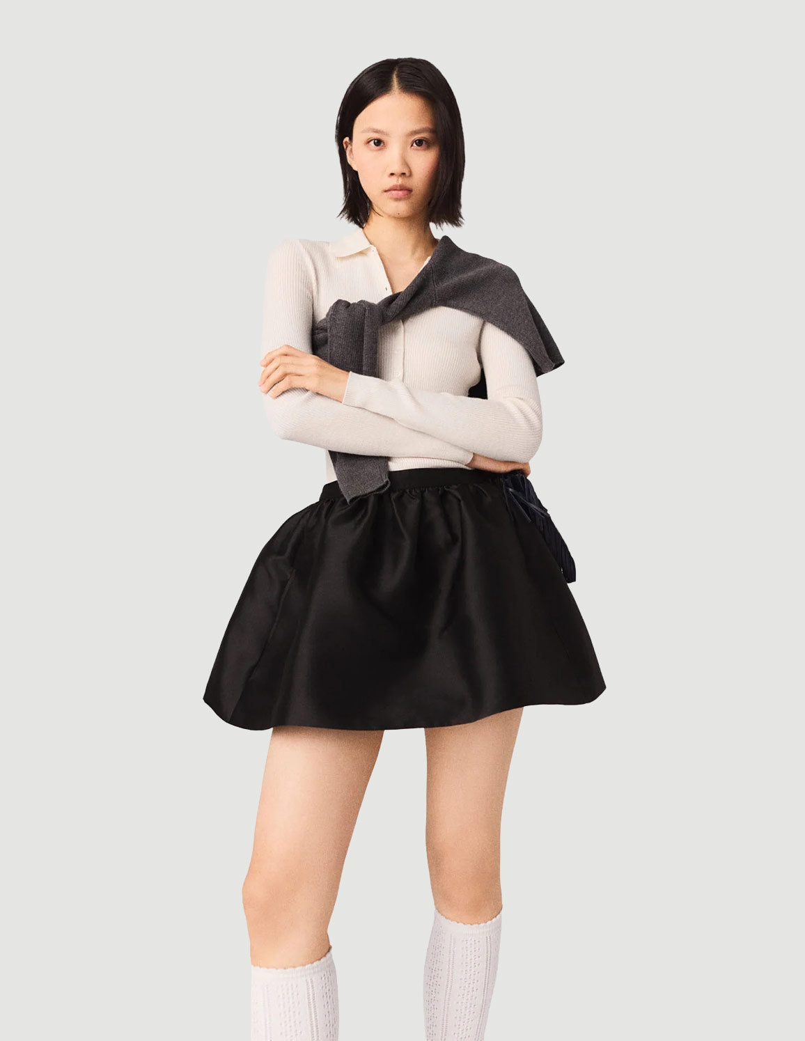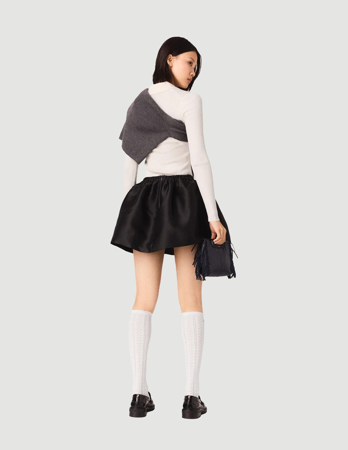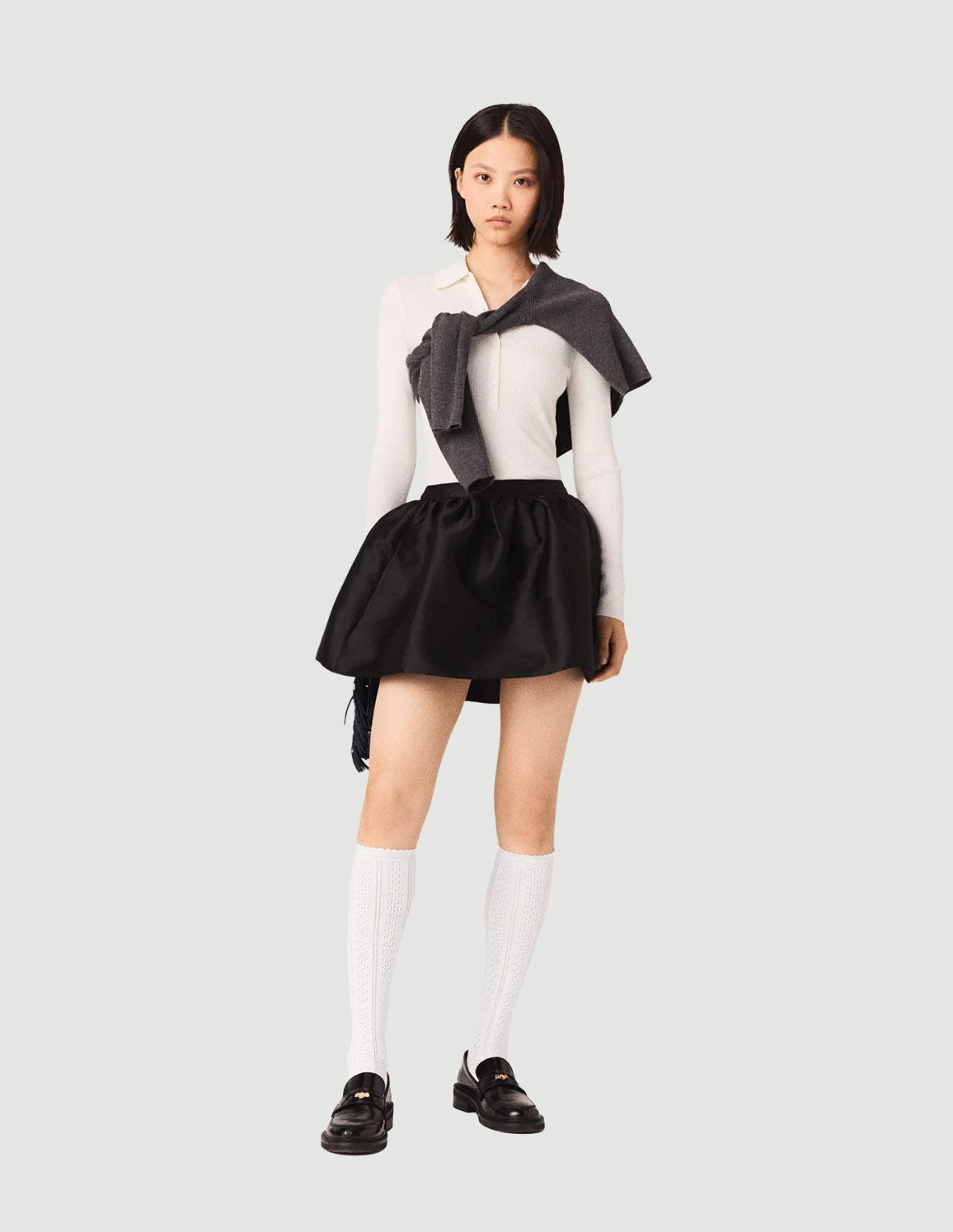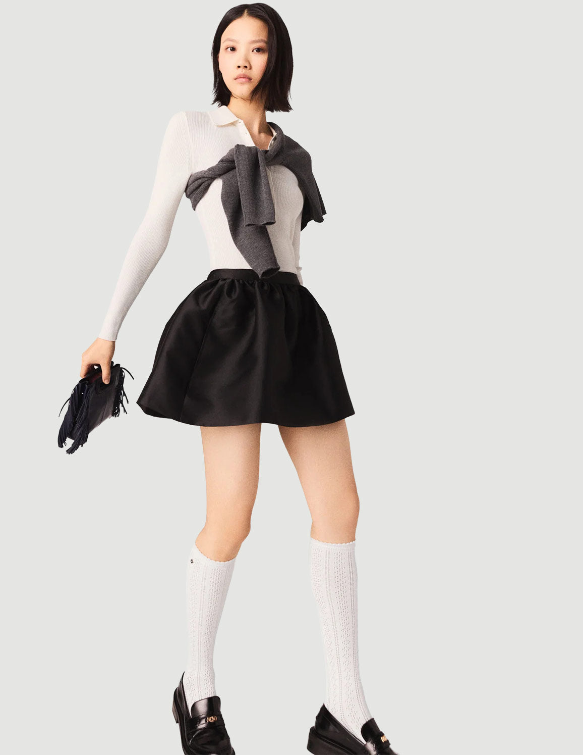 • For a new take on the preppy look, pair it with the off-white rib knit top, high socks and loafers; add an M bag for a bold touch.
