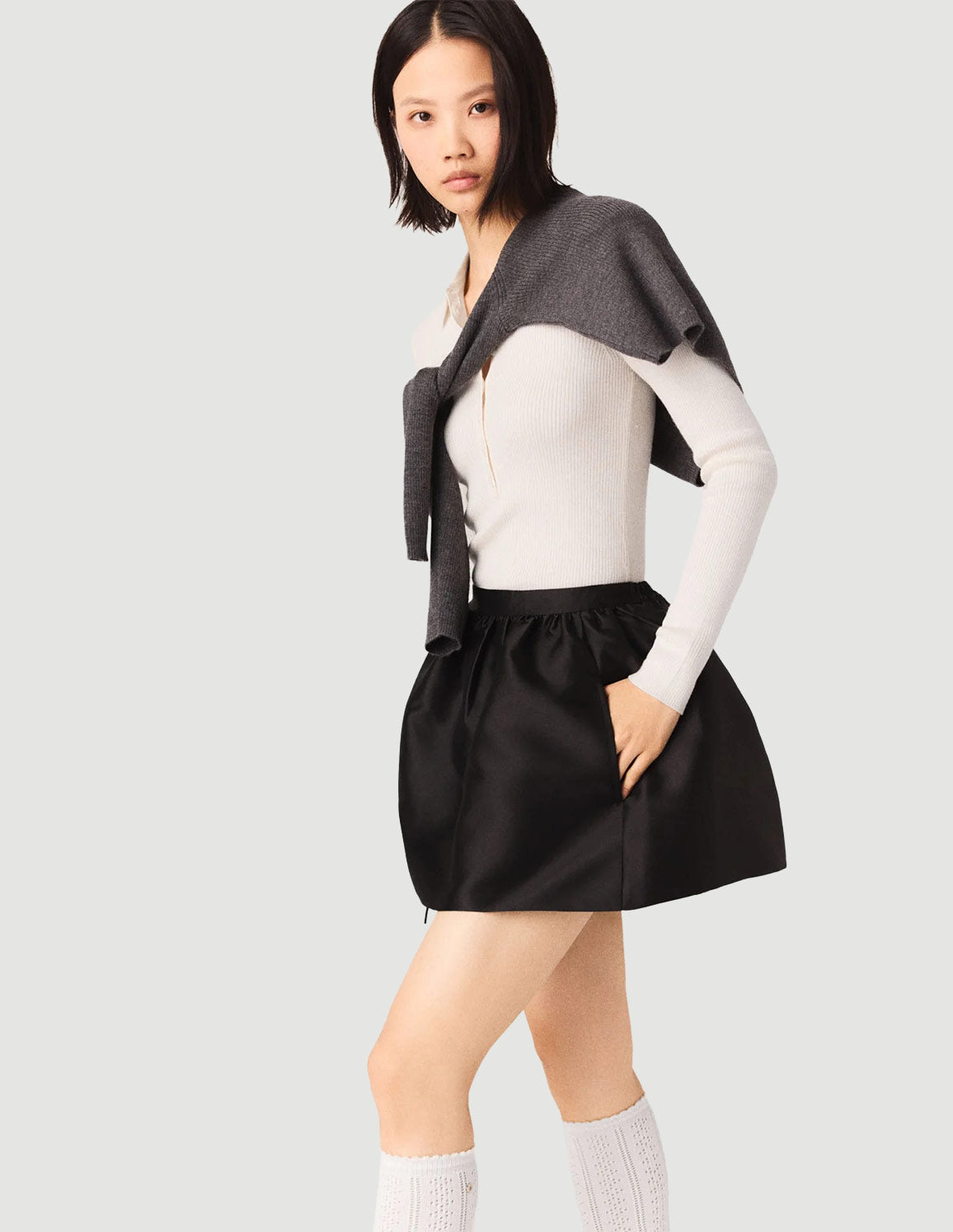 • This bubble mini skirt is captivating with its satin fabric, its sculptural volume and its high ruched waist that shapes the silhouette while offering comfort and modernity.
