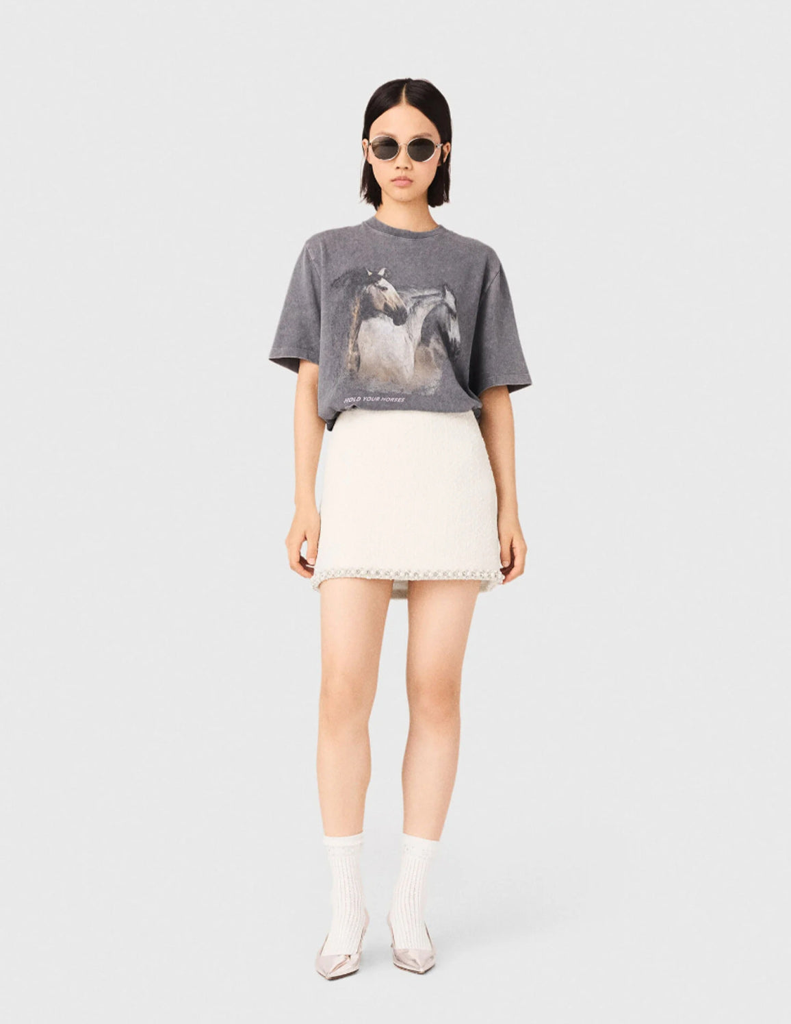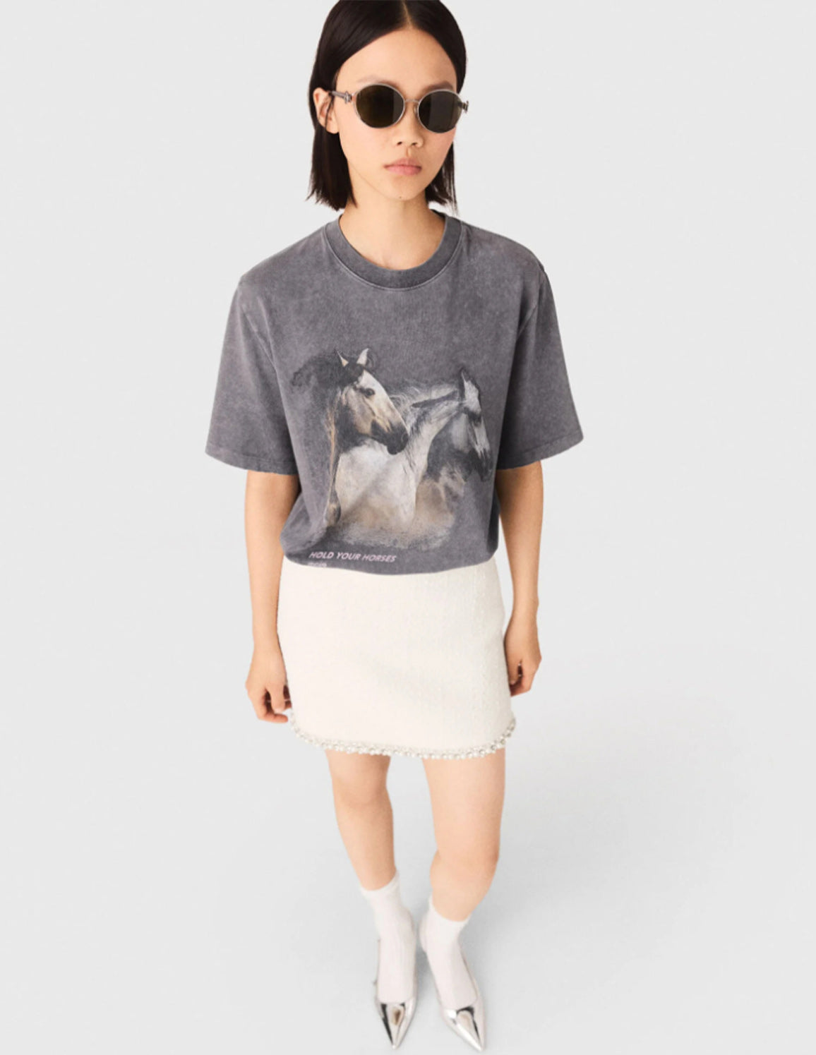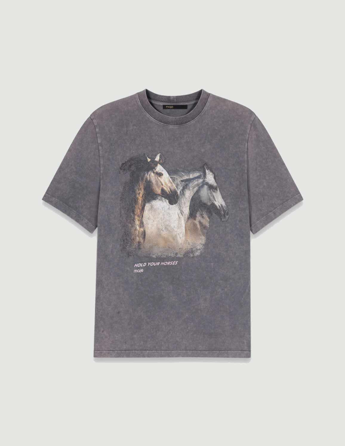 • This cotton T-shirt, with its boxy fit and effortless appeal, is captivating with its faded effect and horse print, signed with a message in soft pink.
