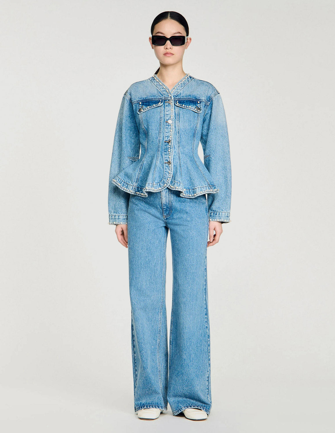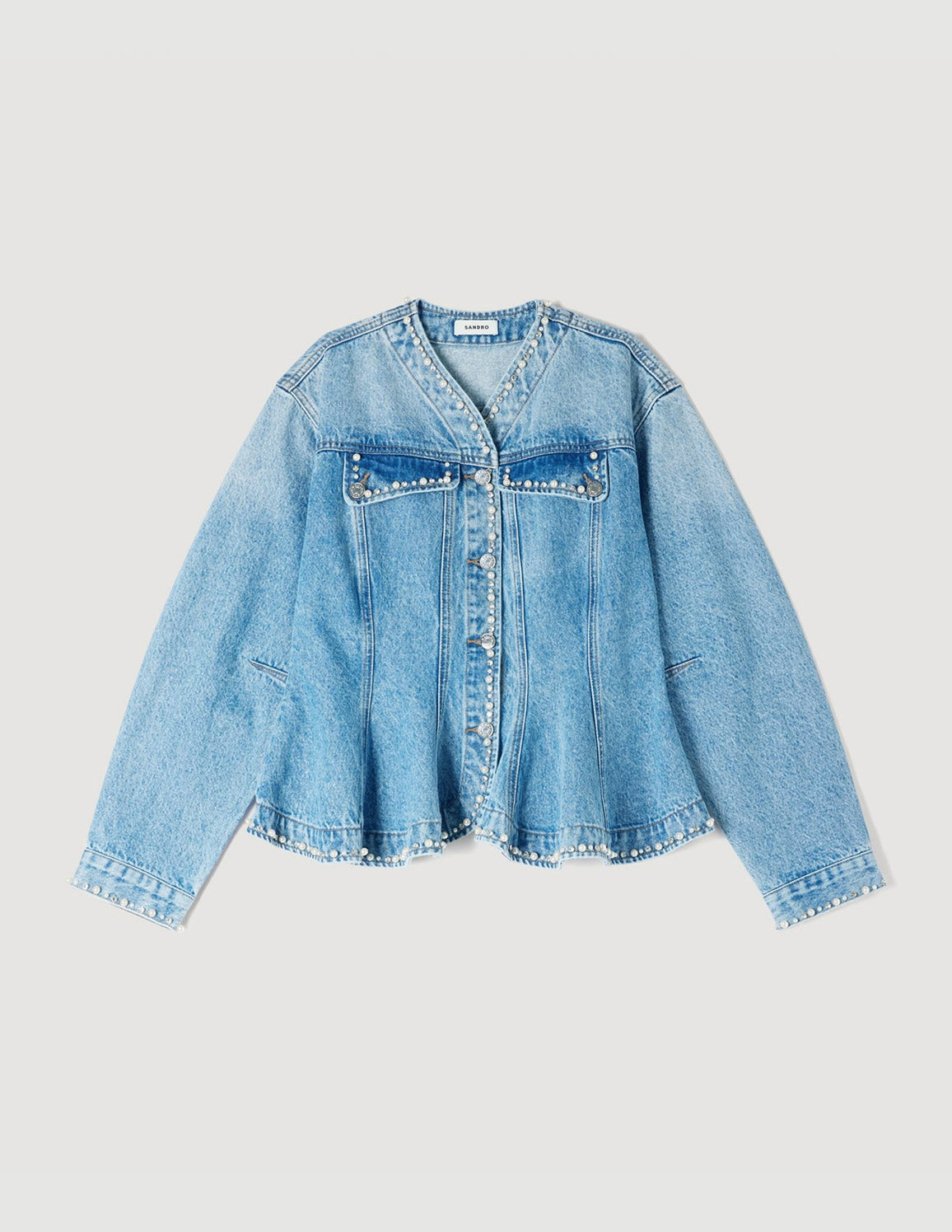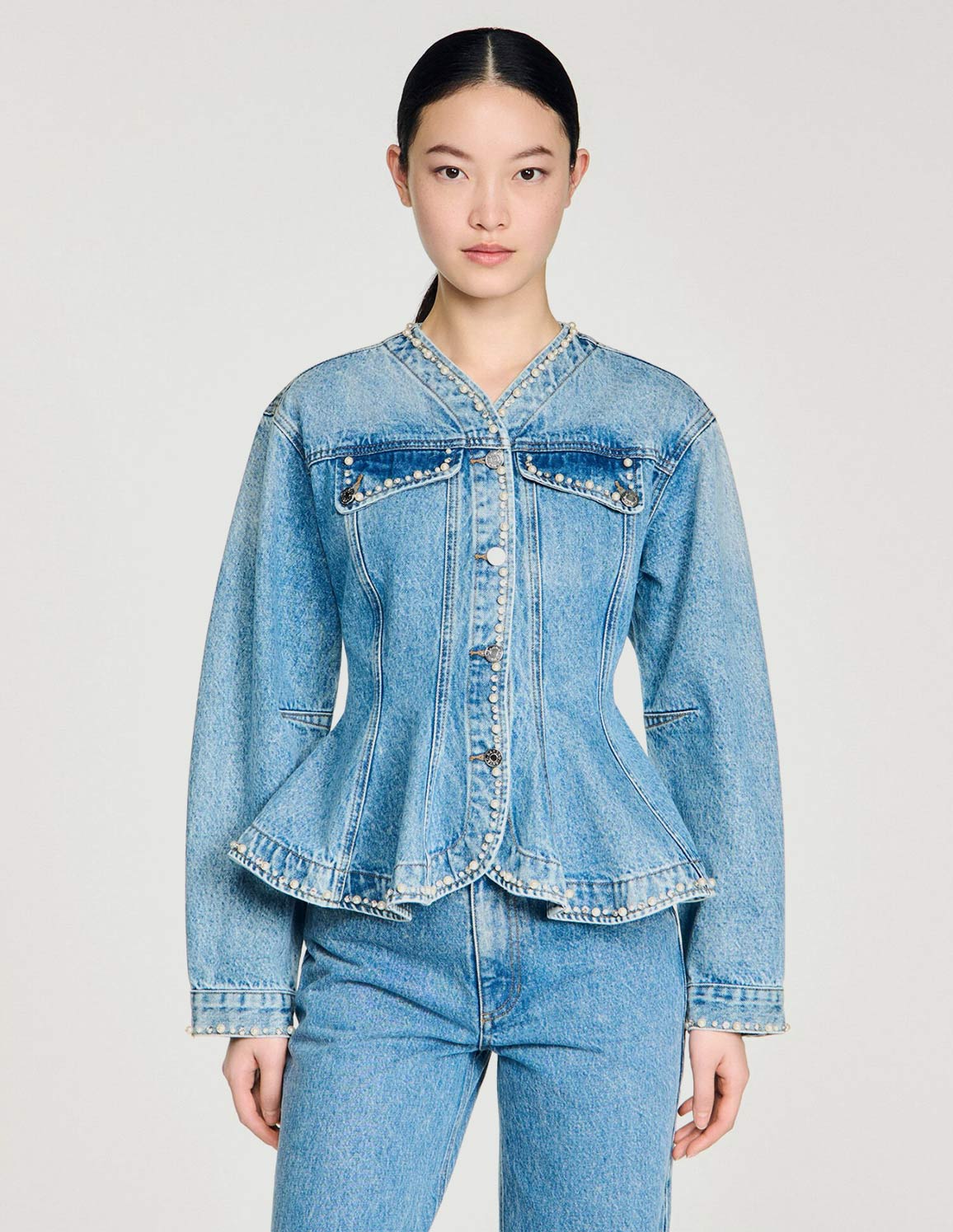 • Denim jacket embellished with pearls, featuring a peplum hem, long sleeves and a front button fastening.