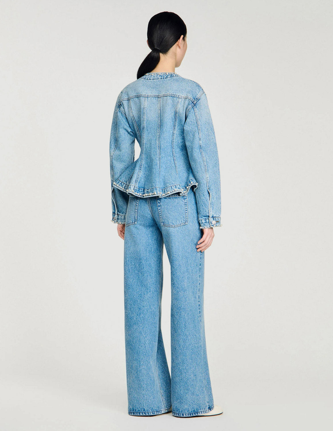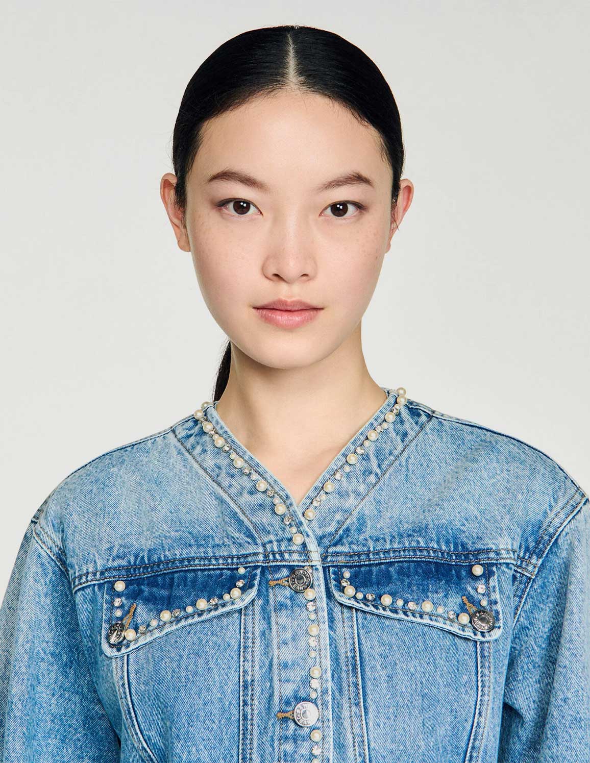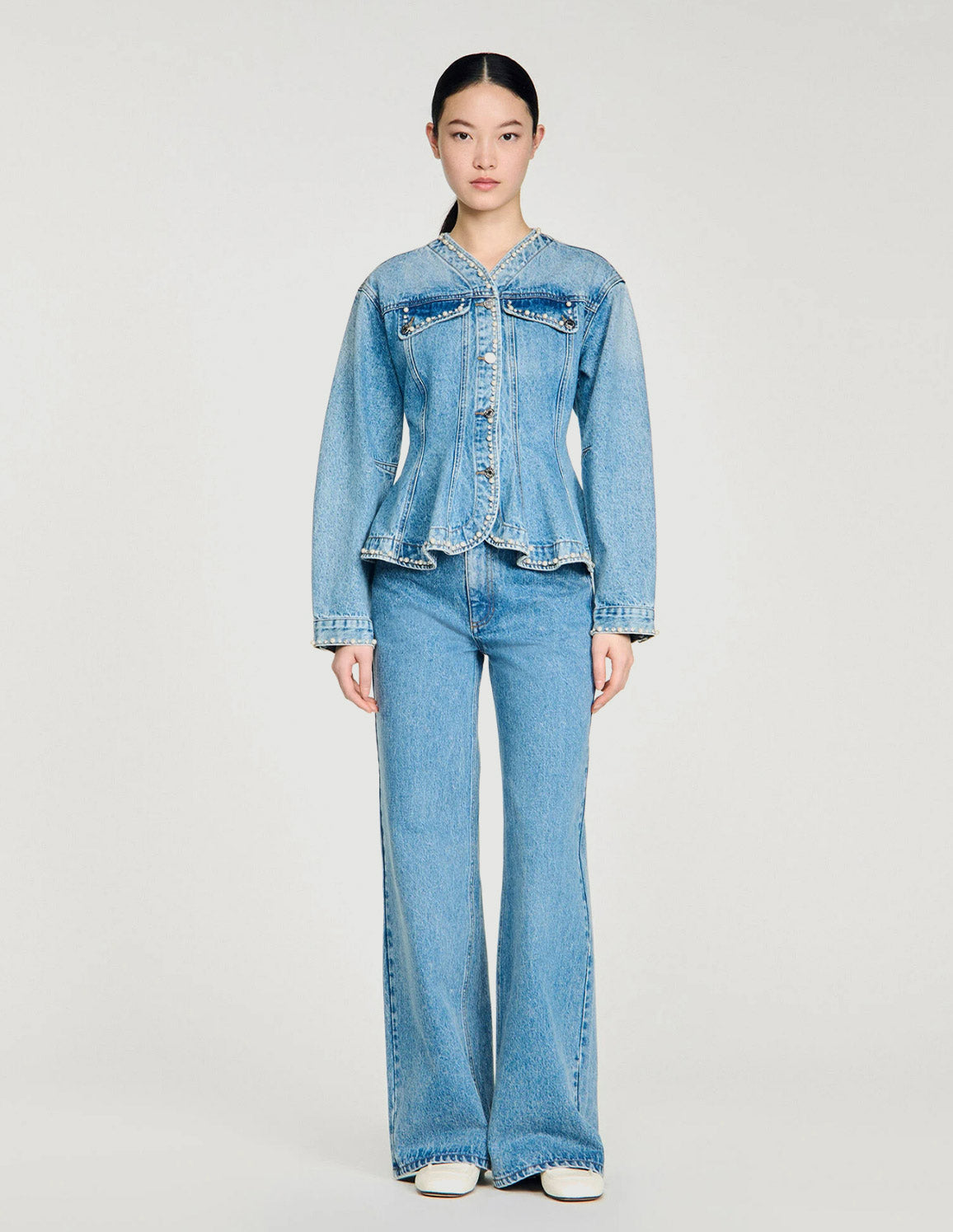 • Denim jacket embellished with pearls, featuring a peplum hem, long sleeves and a front button fastening.