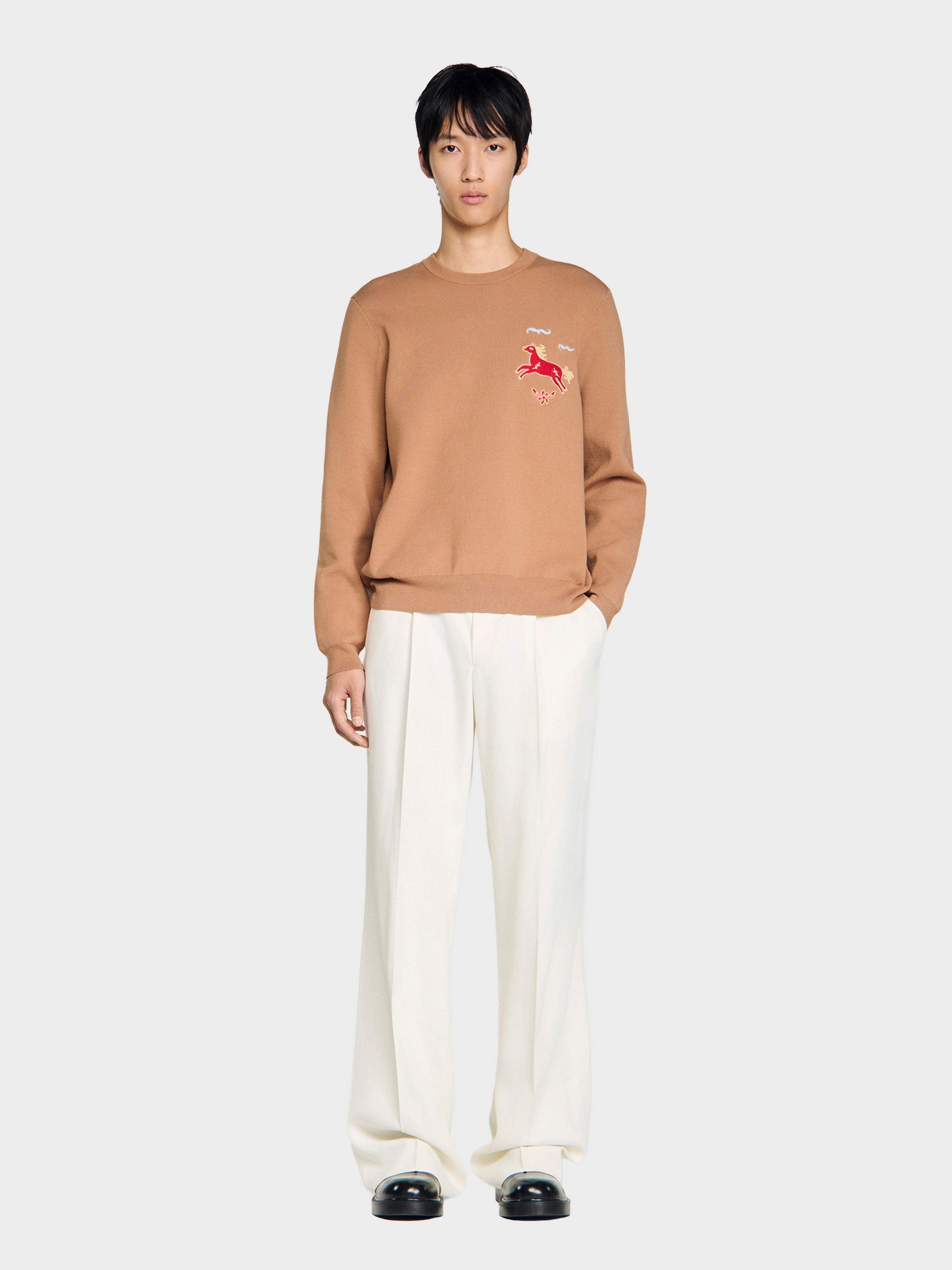 • Plain knit sweatshirt with a round neck and long sleeves, featuring a horse embroidery on the chest.