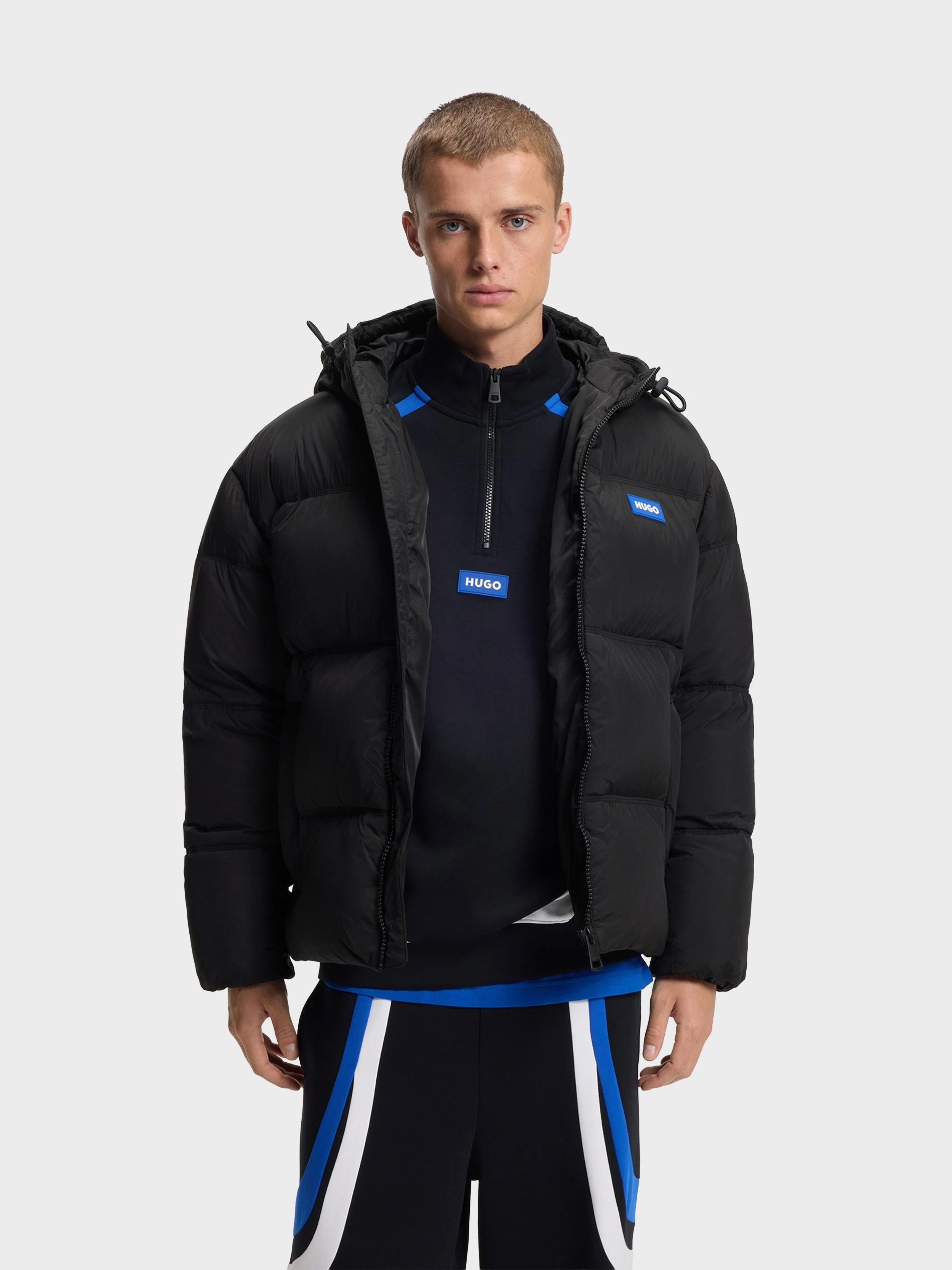 • With a water-repellent finish and adjustable hood, this relaxed HUGO Menswear padded jacket is essential in unpredictable weather. Cosy pocket lining. Blue logo label. This product contains at least 80% better raw materials. This product is partly created with recycled polyamide.