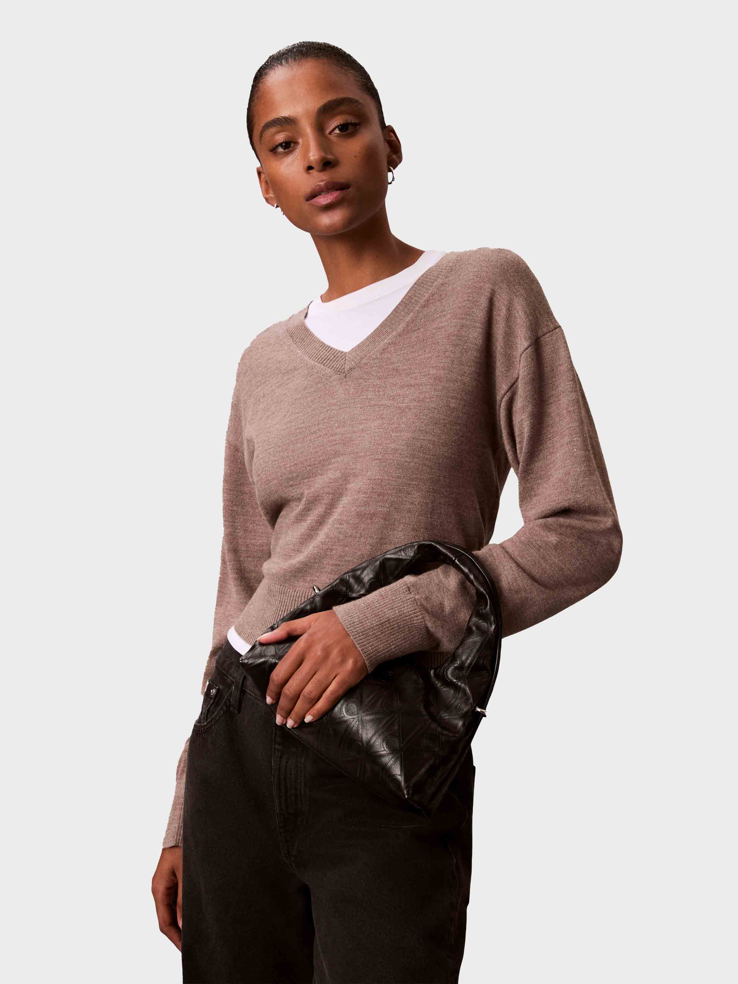 • Calvin Klein small handbag with clasp. Made of synthetic leather.