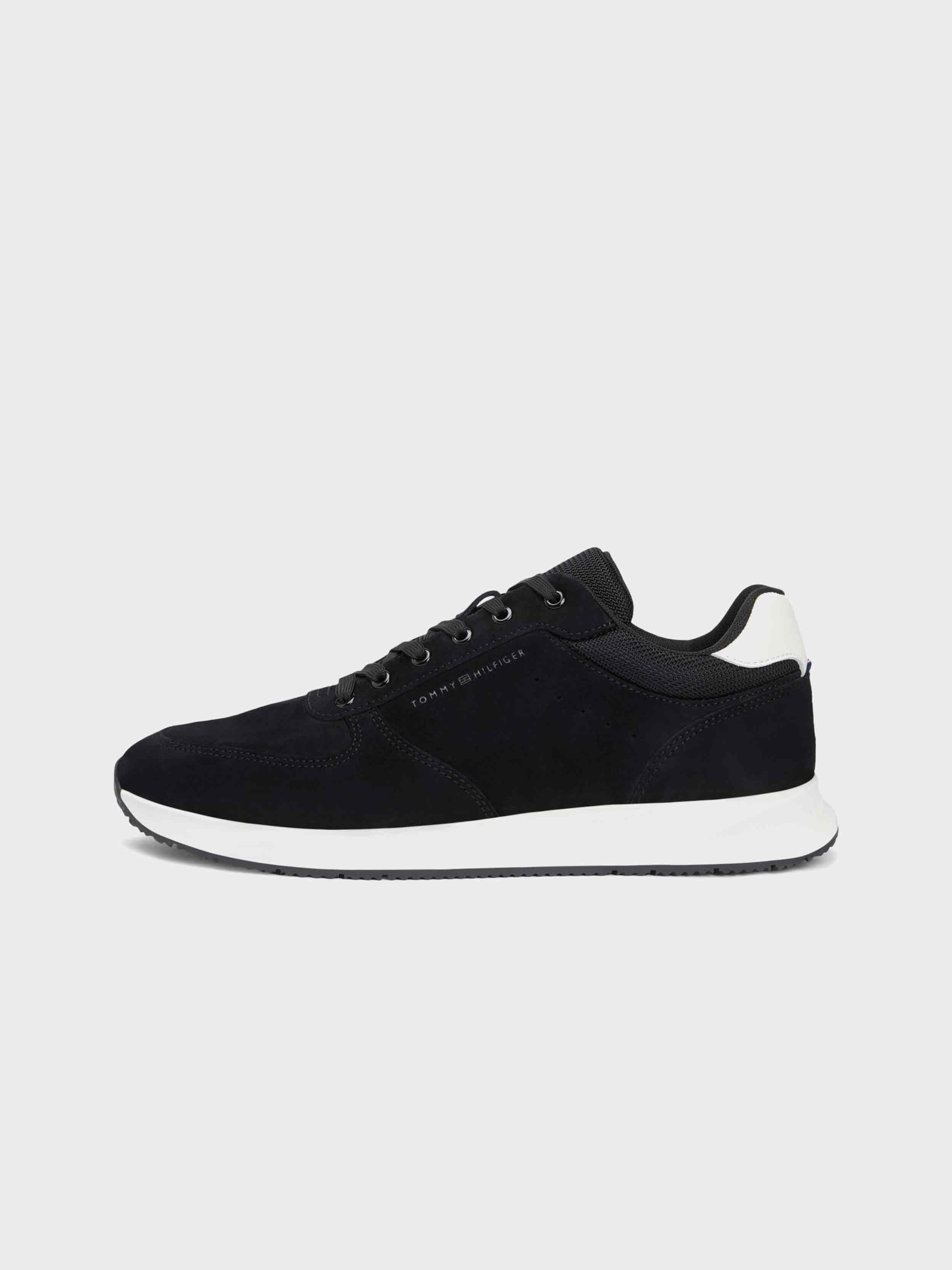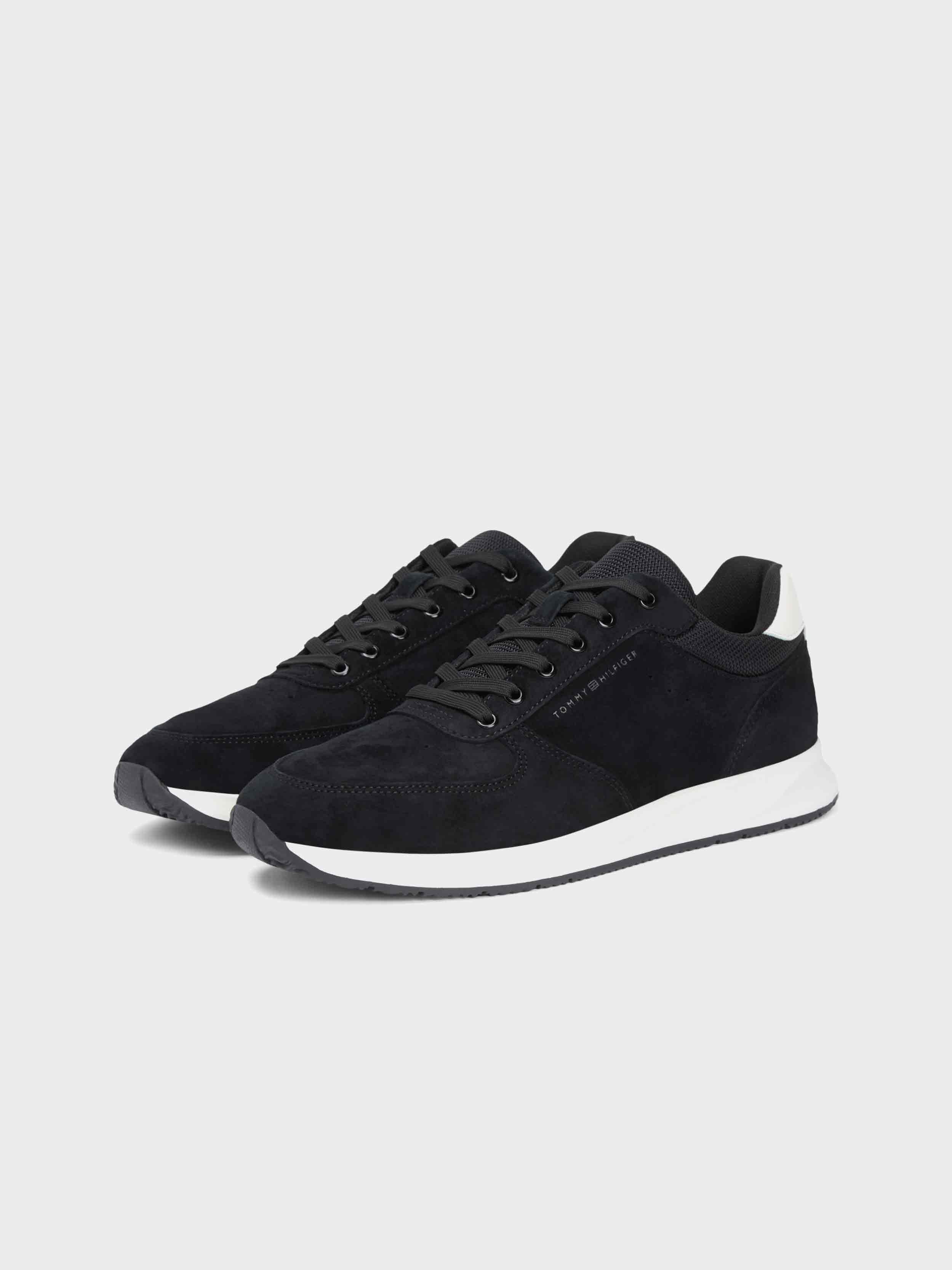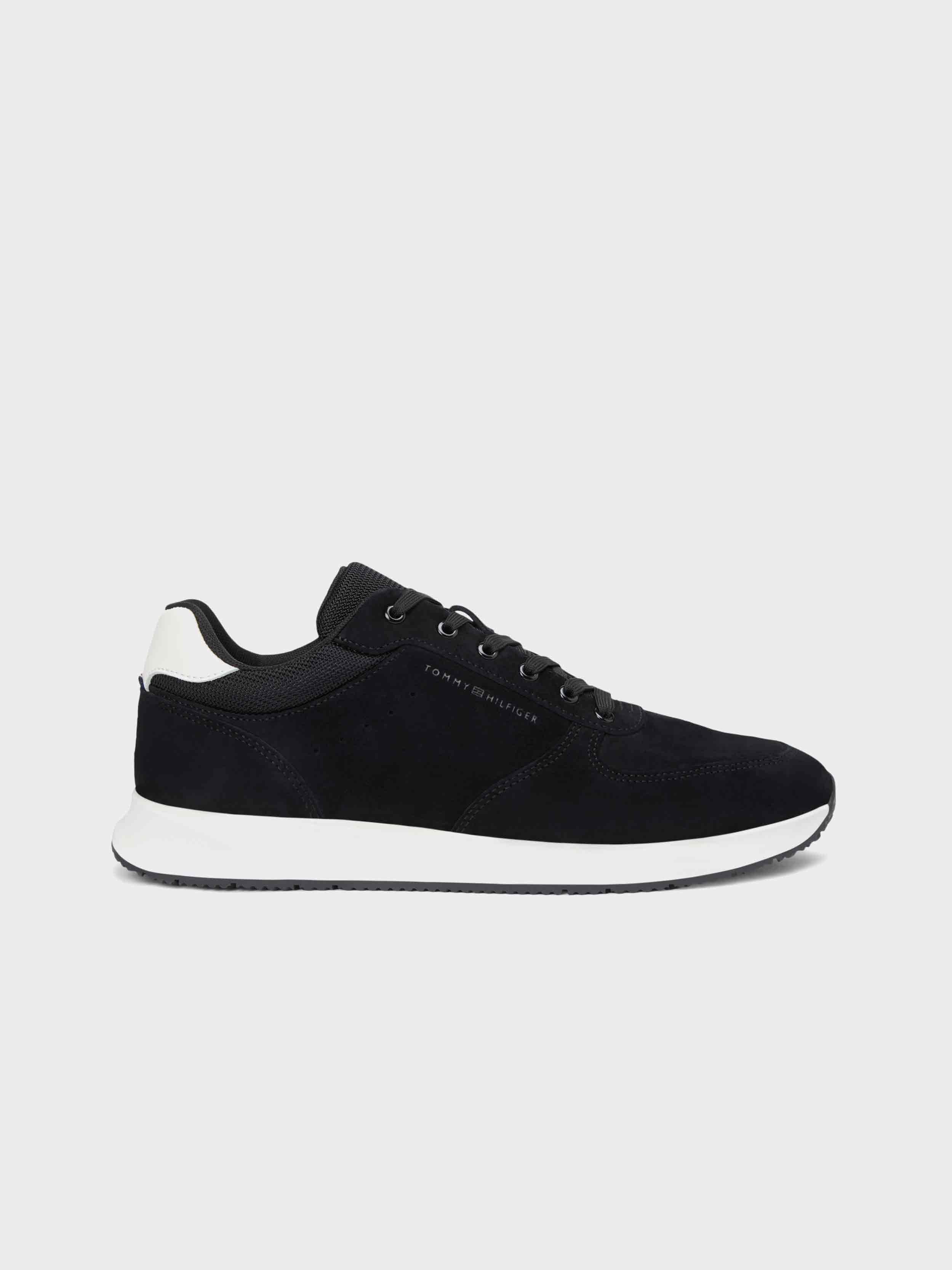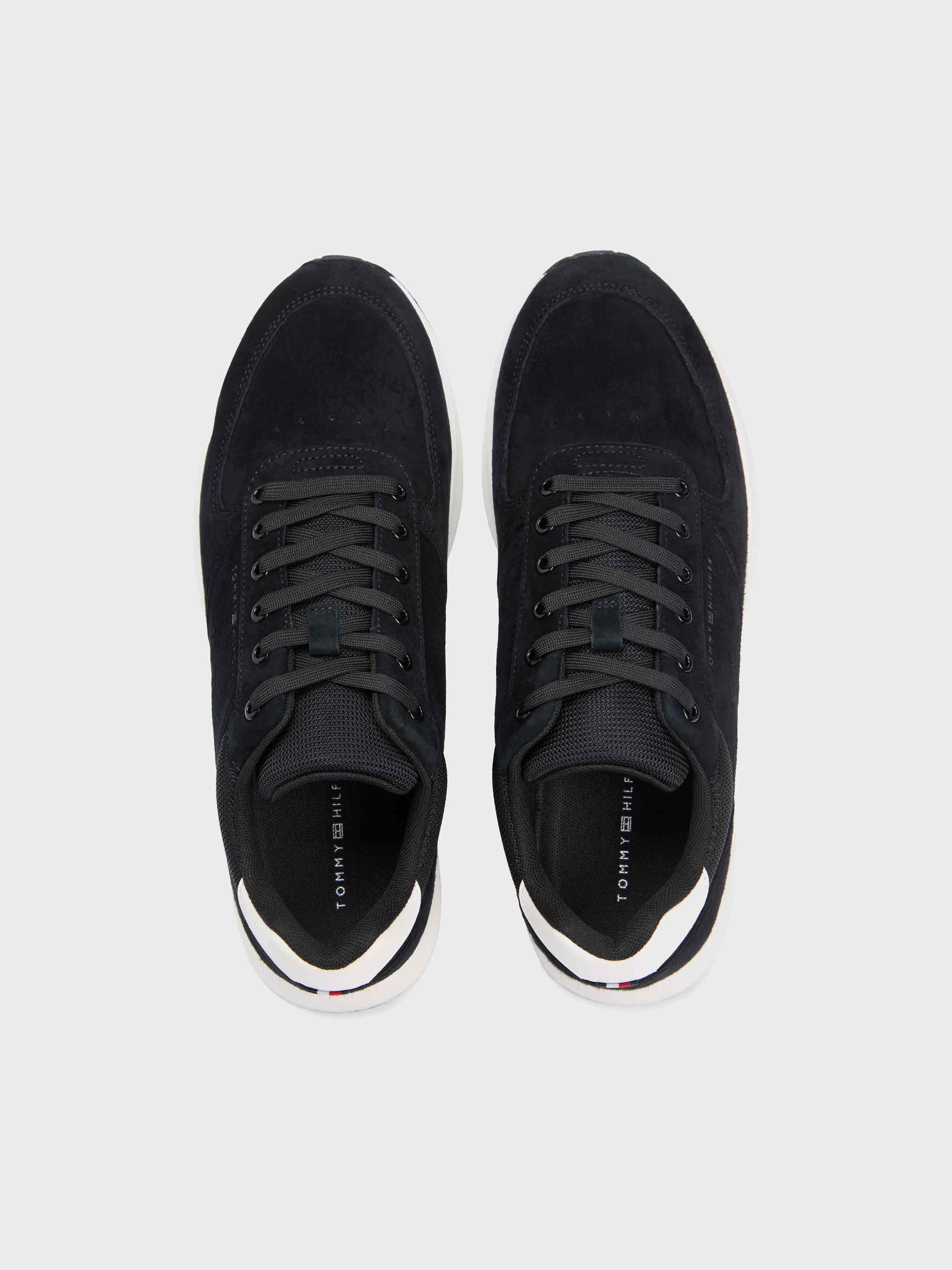• These low-top suede sneakers, inspired by athletic styles, feature a removable insole, contrasting heel panels, and an embossed Tommy Hilfiger logo.
