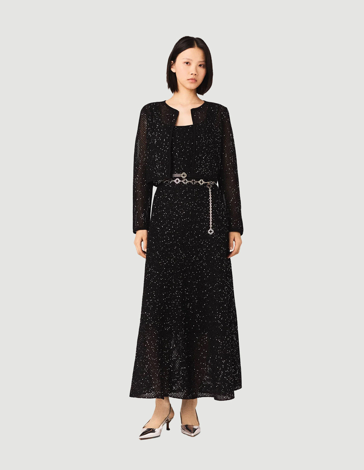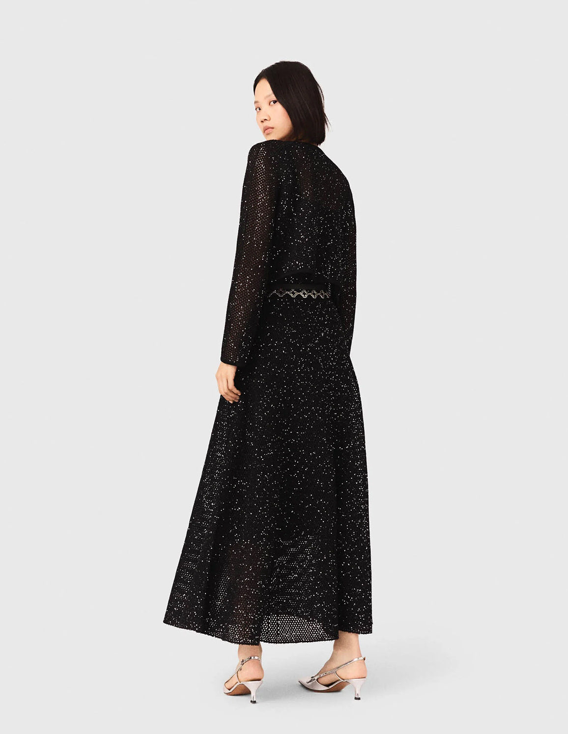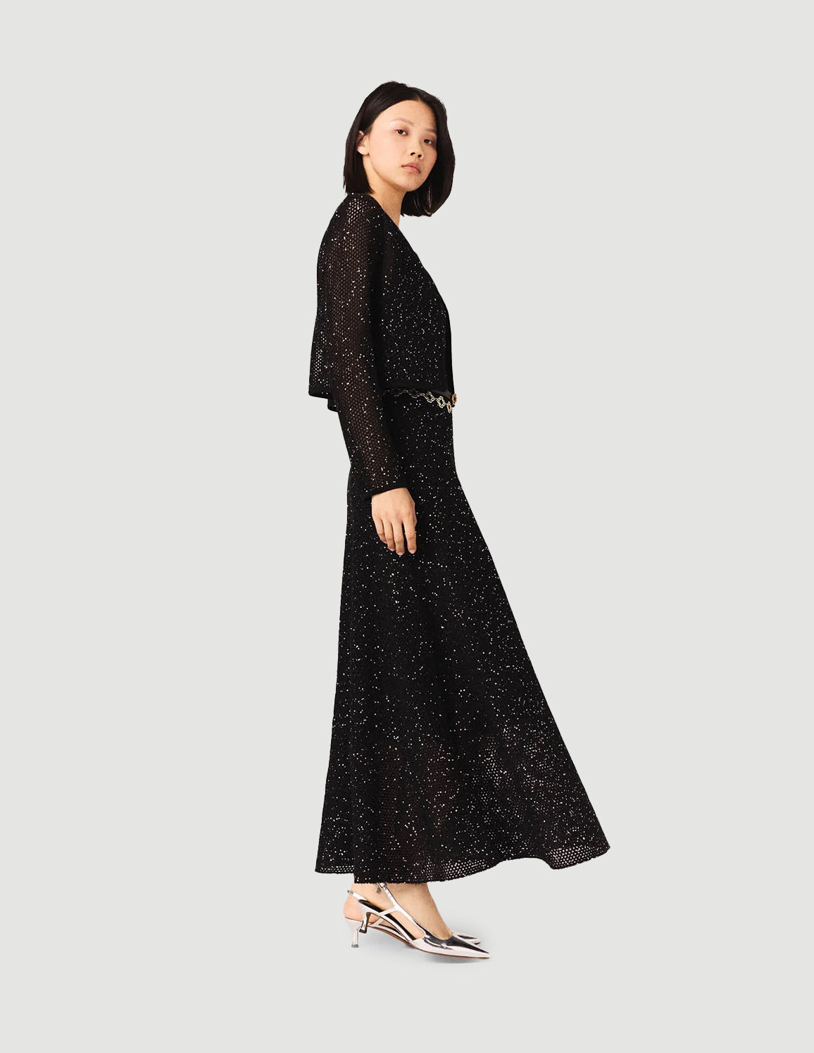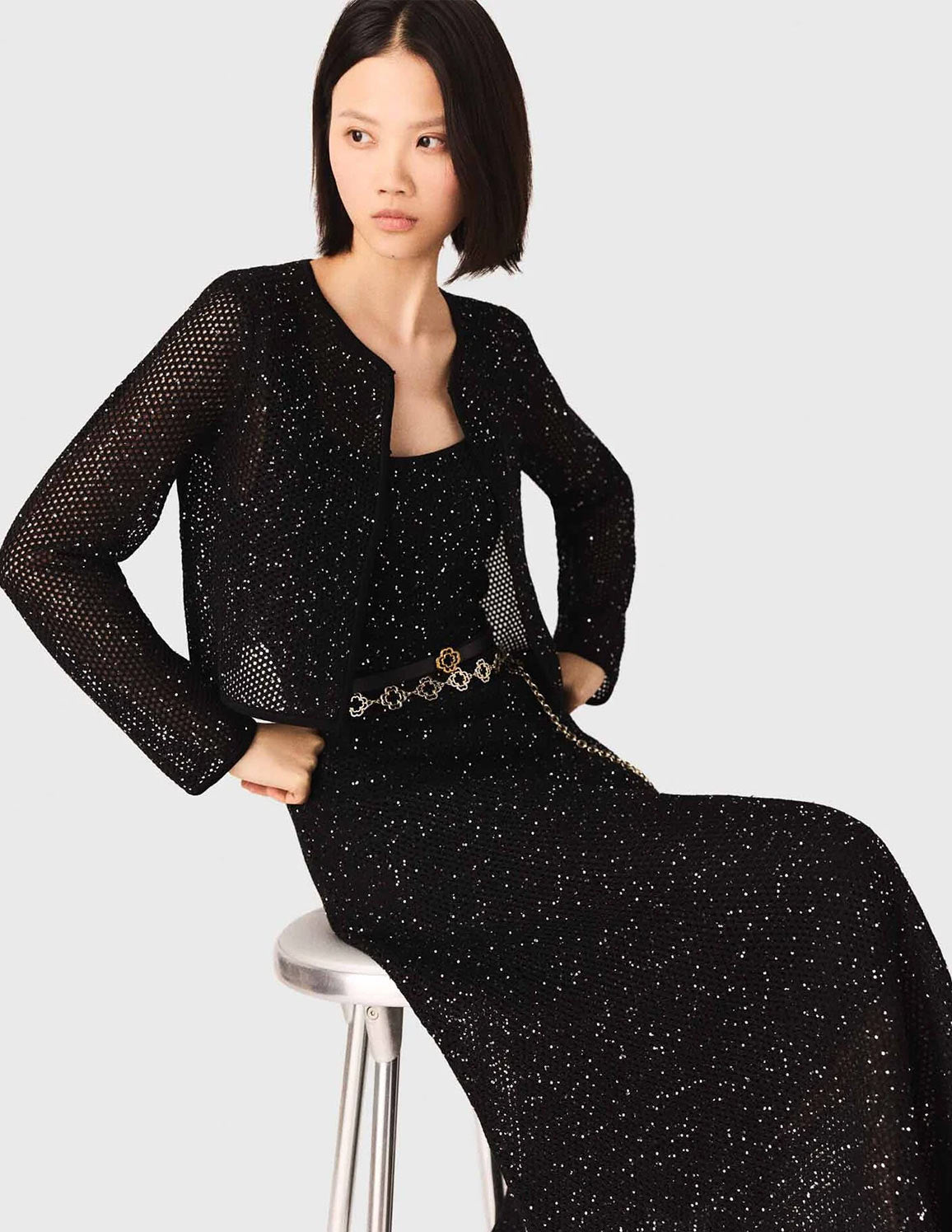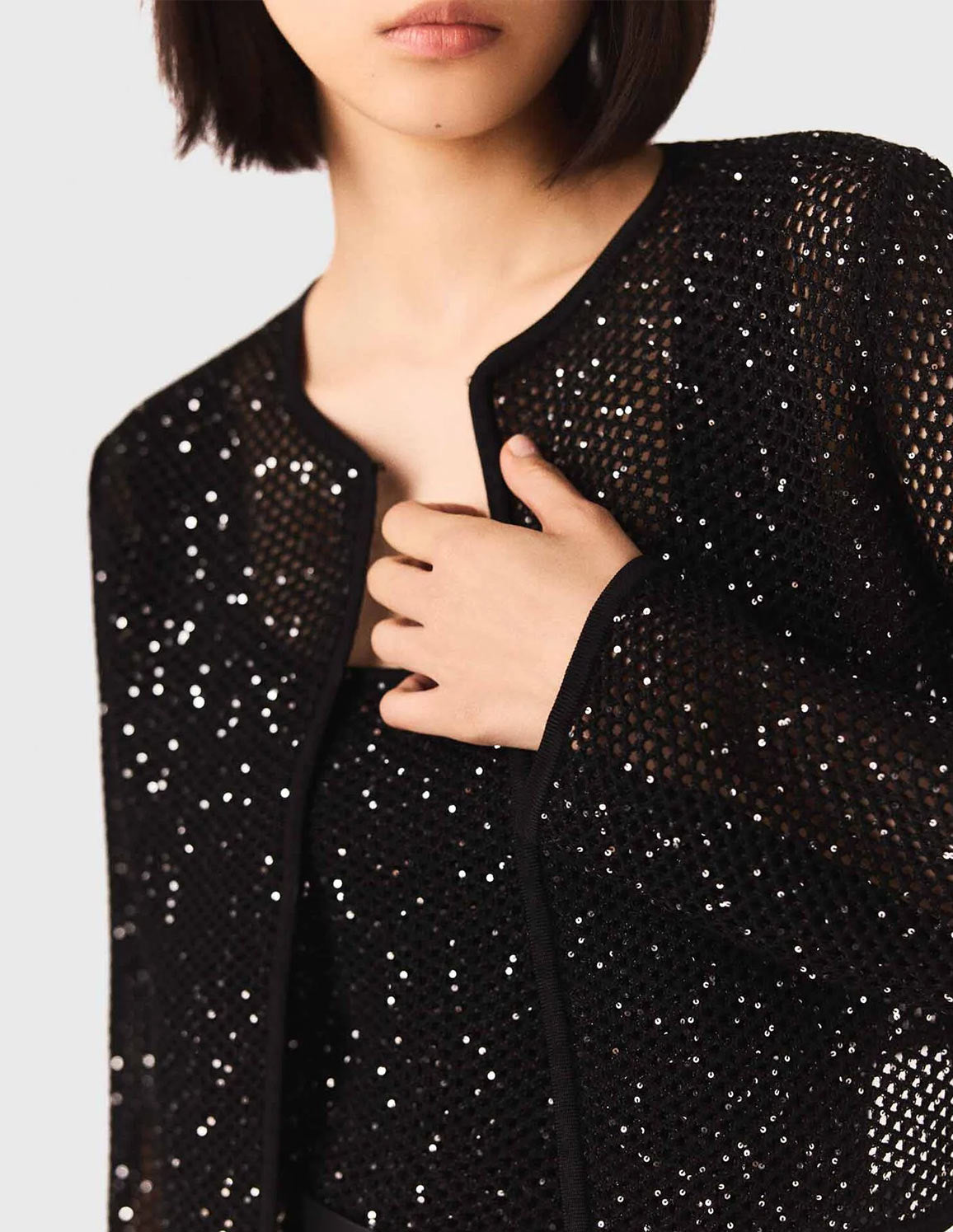 • This short openwork knit cardigan is embellished with a shower of silver sequins, playing on the contrast between see-through and opaque. Discreet hook-and-eye fastenings accentuate the round neckline and allow it to be worn closed.