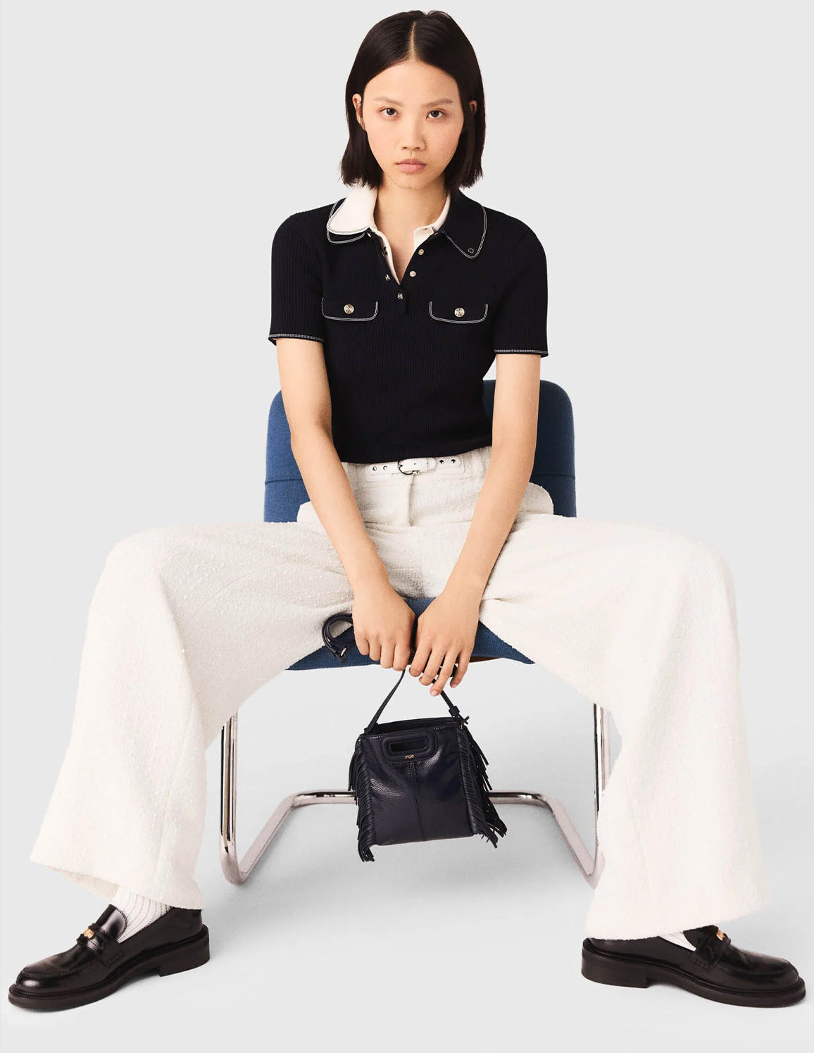 • Pair them with a contrasting knit polo shirt, the M mini bag and patent loafers to create a contemporary preppy look, finished off with white socks for the final touch.