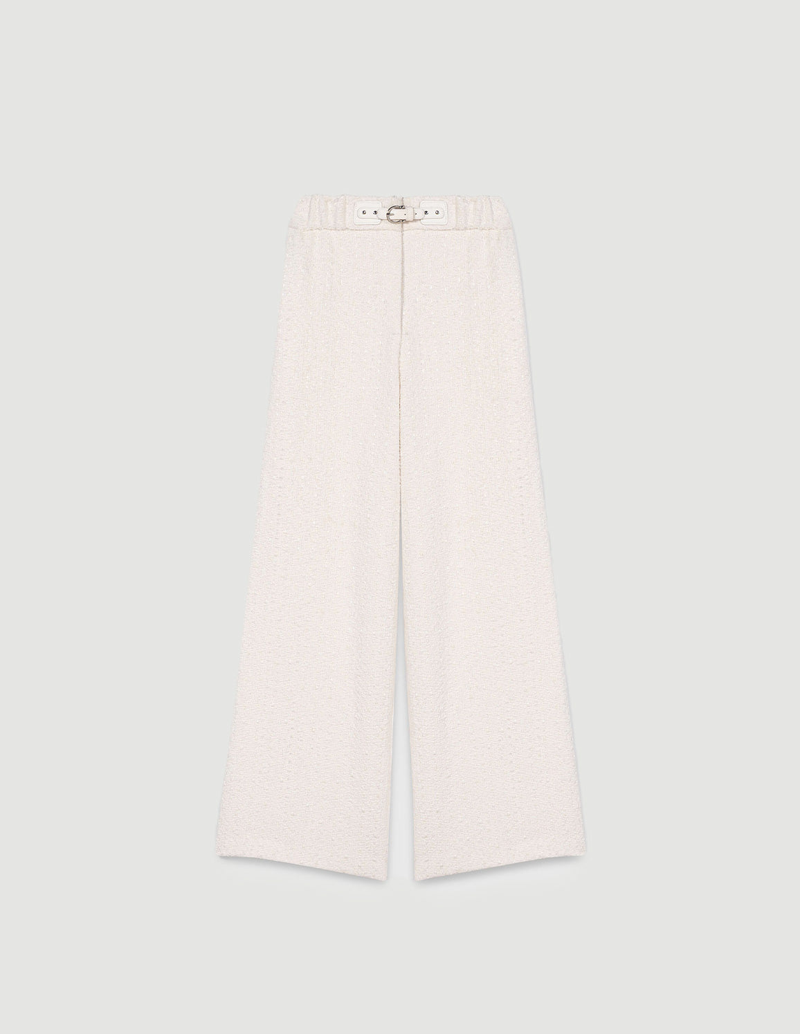 • These ecru palazzo trousers have a captivatingly loose, flowing fit, a high waist adjusted by a tone-on-tone belt with a silver buckle, and a textured fabric that catches the light without being shiny. The discreet pockets and adjustable belt add a practical touch to this confident silhouette.