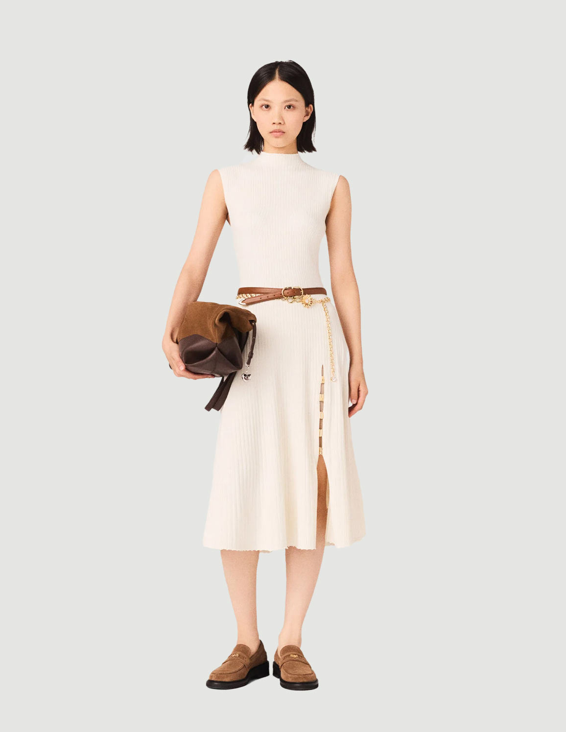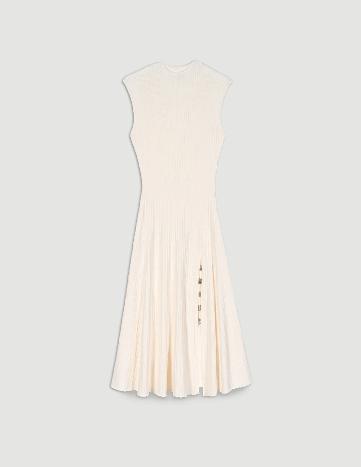 • Its rib knit accentuates the bust and the flared pleated skirt moves with you, while the side slit, punctuated by gold "AMOUR" lettering, asserts a playful, modern femininity.
