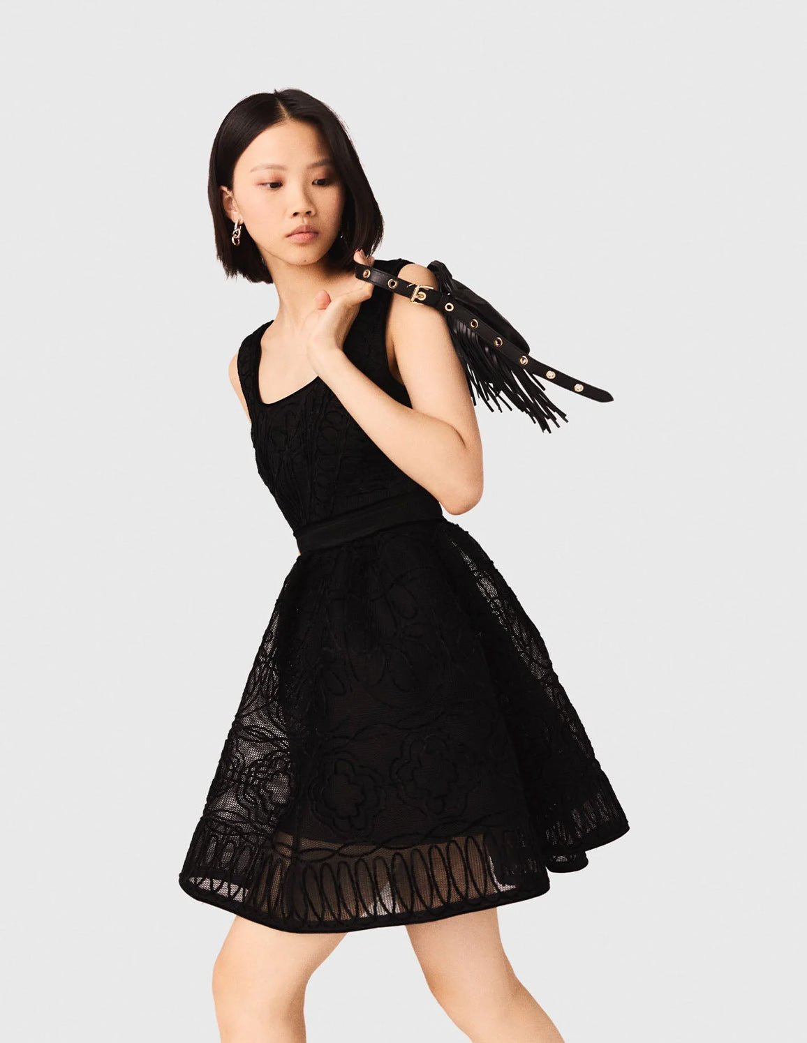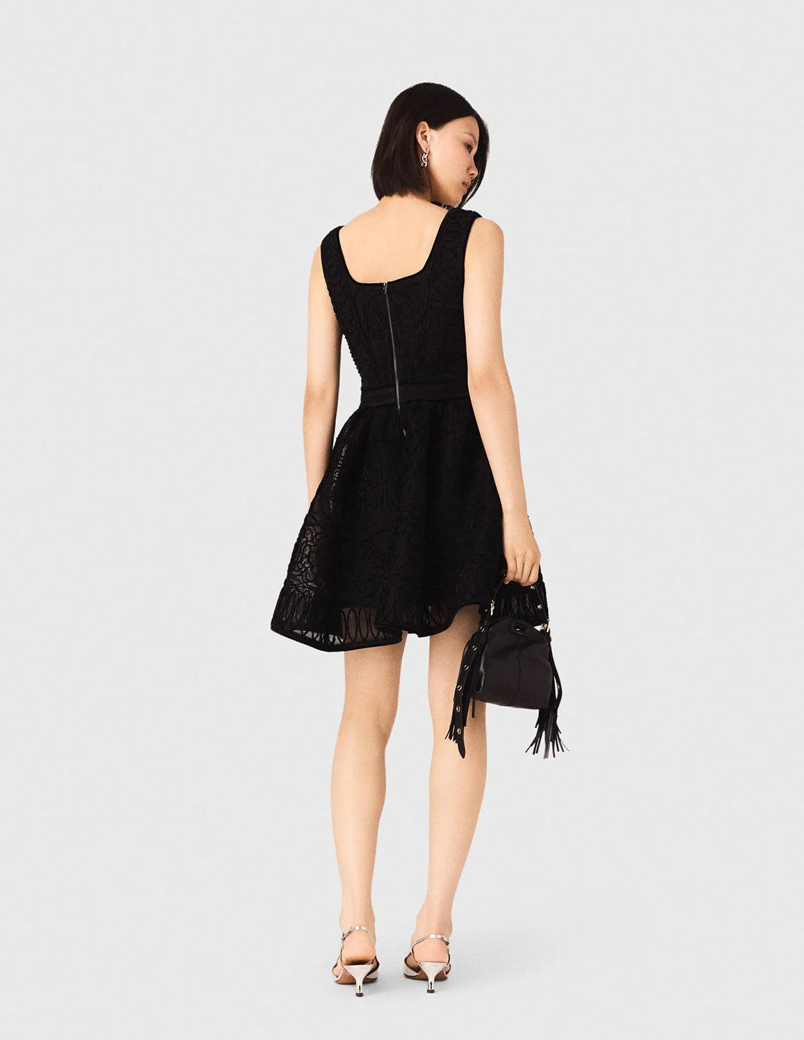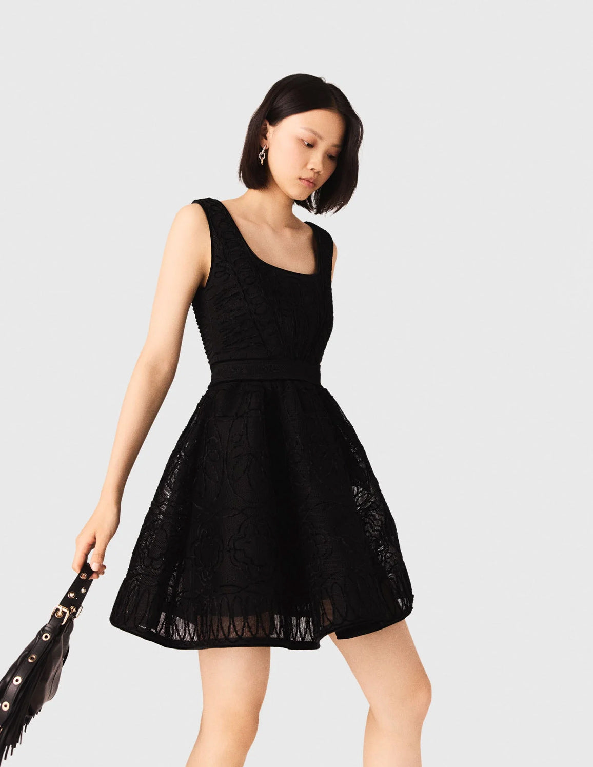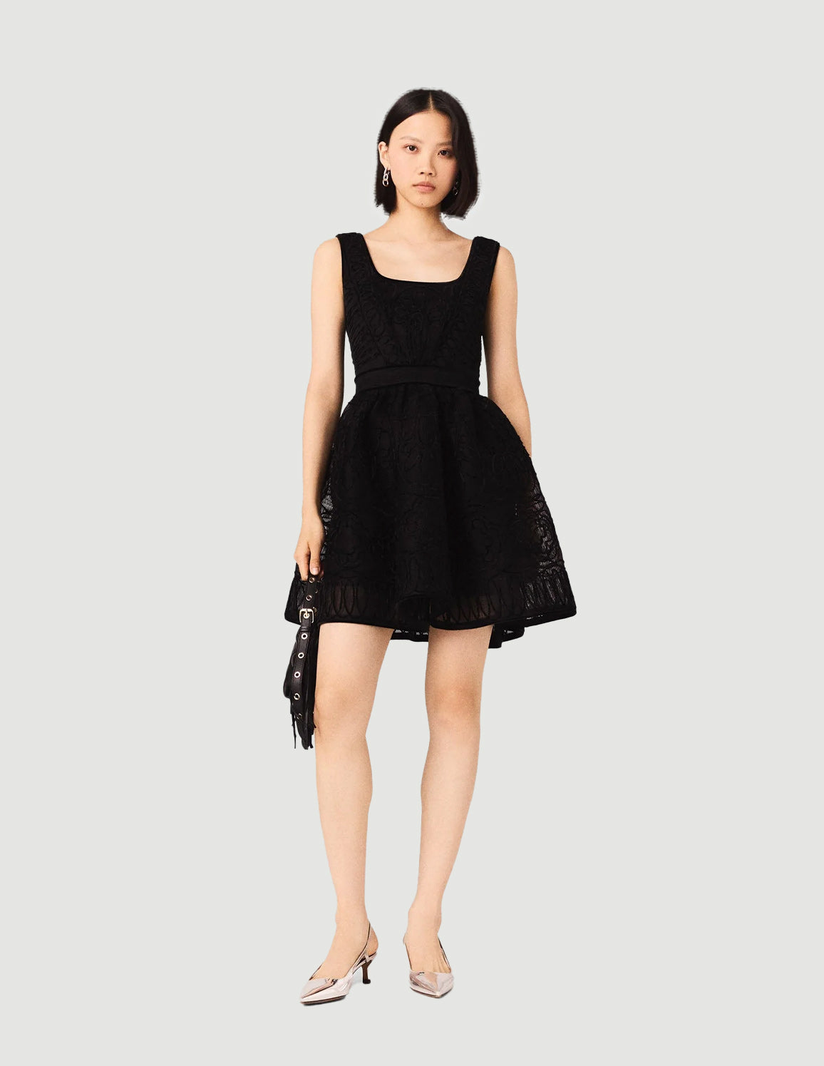• A confident look is created through an interplay of contrasts and textures, blending modern elegance with graphic sophistication. This short skater dress captivates with its knit fabric fully embroidered with raised motifs, its structured bodice accentuating the waist, and its hem edged with a decorative band that reveals the lining through a sheer effect. Wear it with a Miss M bag, silver slingback pumps and graphic earrings for a statement silhouette, from the office to your evenings out.