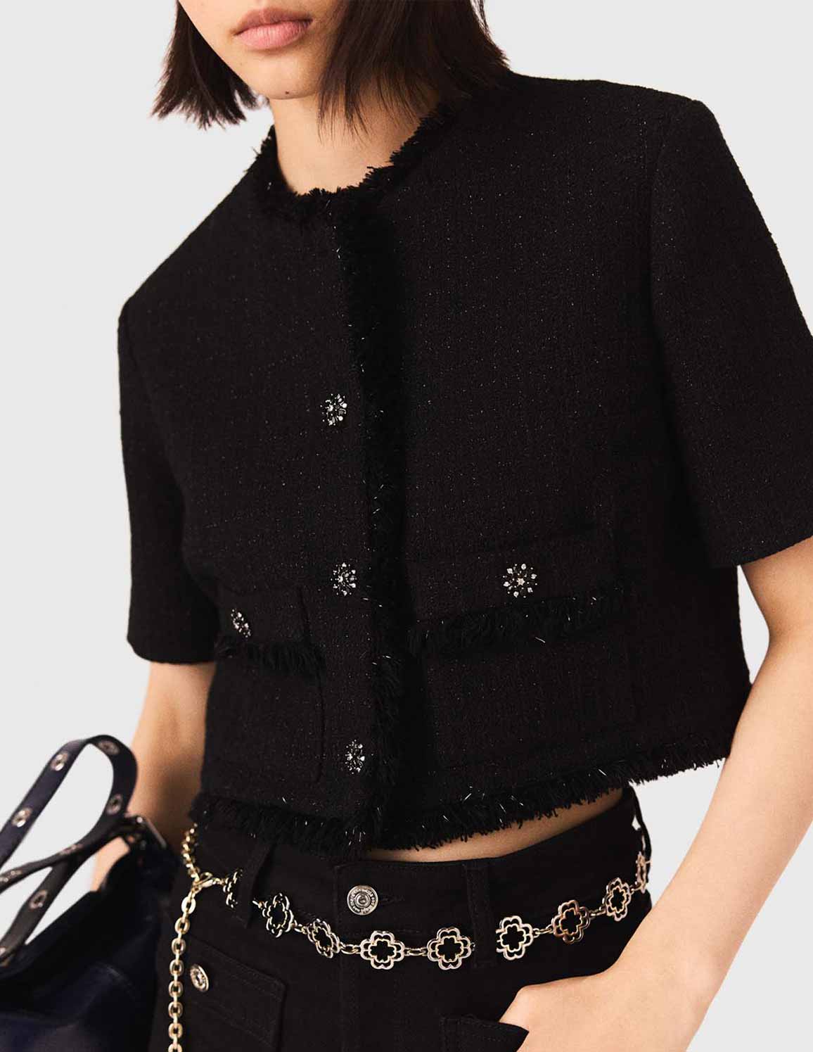 • The new season takes on a sophisticated, metropolitan feel with elaborate pieces in textured materials and bold cuts. This short jacket in black bouclé tweed is captivating with its graphic silhouette, textured feel and the subtle sparkle of its rhinestone jewel buttons. The fringed trim highlights its confident modernity, while the flap pockets and straight cut structure the piece for a resolutely chic look. Mix and match with black high-waisted trousers, a gold chain belt and a fringed bag to create a strong, contemporary silhouette.