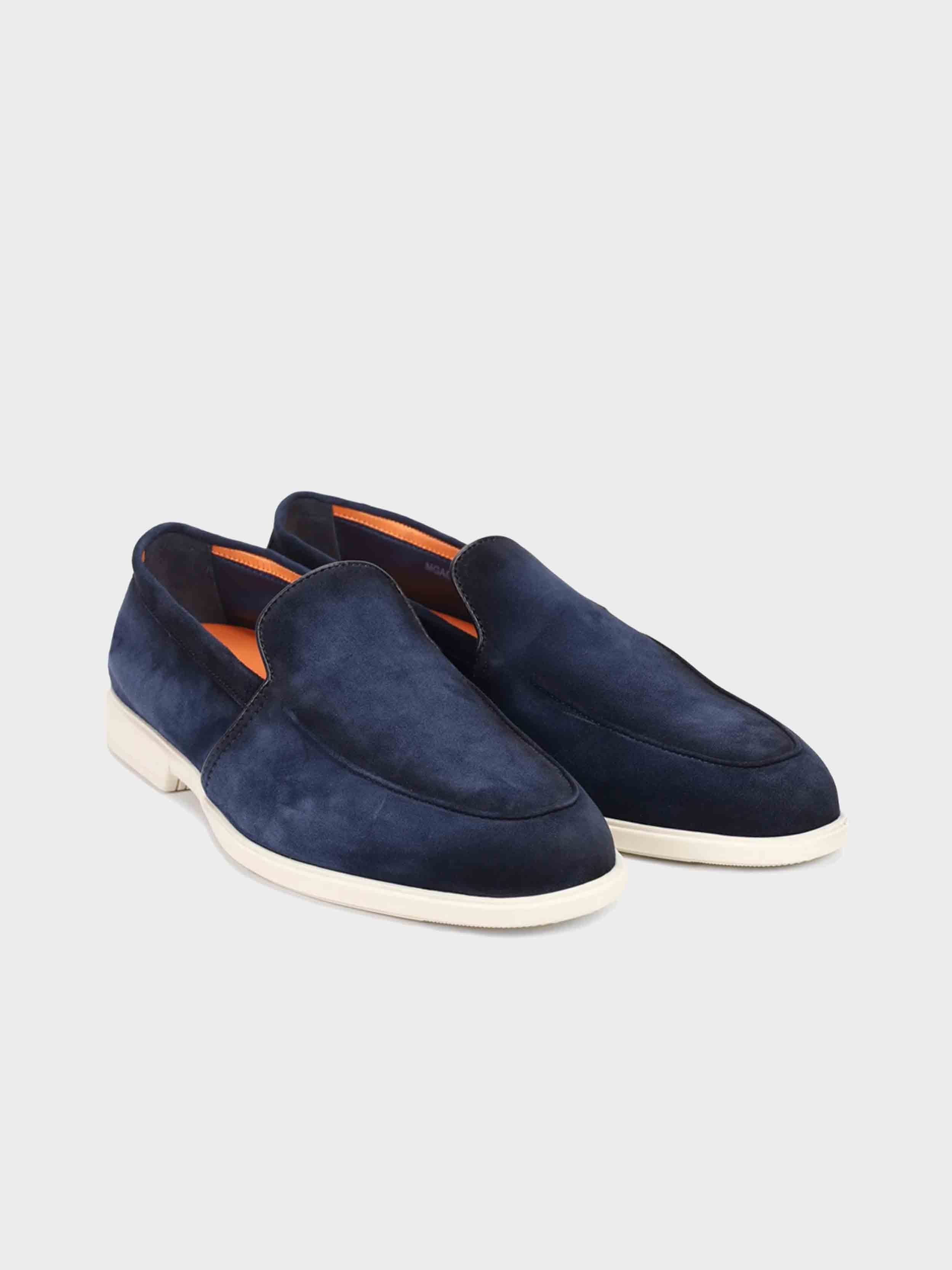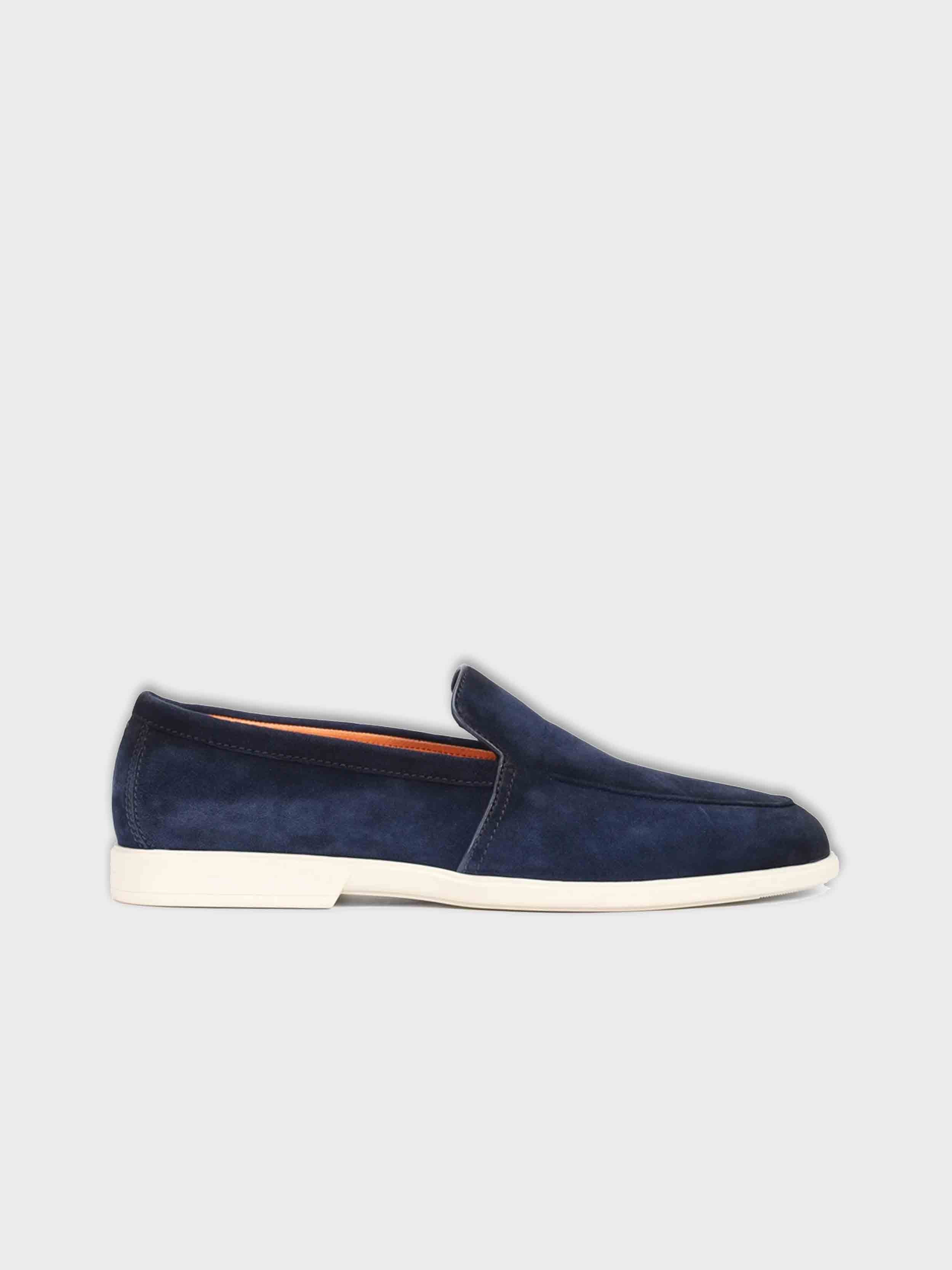 • Blue velvety suede loafers from SANTONI. Featuring a round toe, accented by a voluminous decorative seam, a flexible sole, a low heel, and a genuine leather interior. Embossed logos on the heels maintain the brand's signature look.