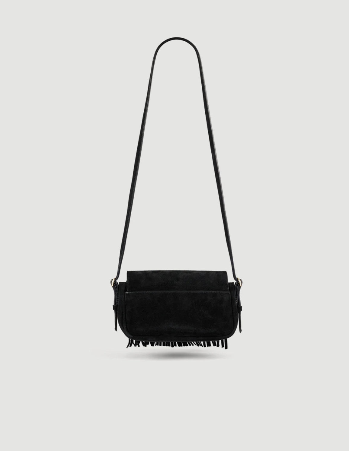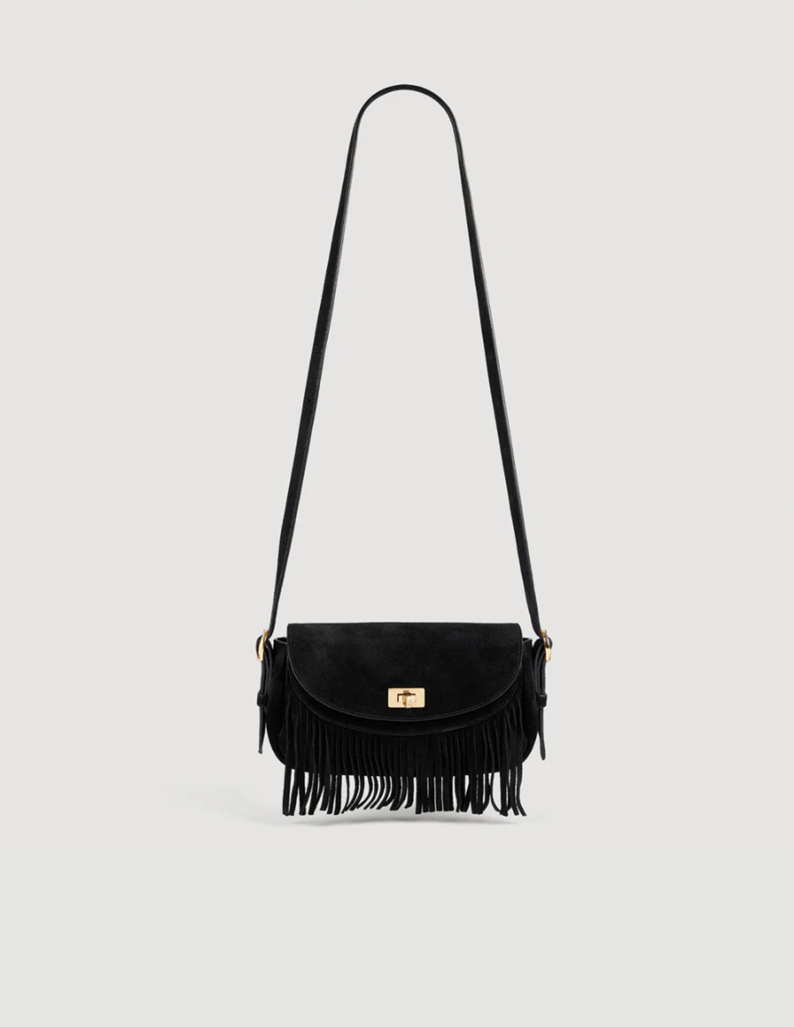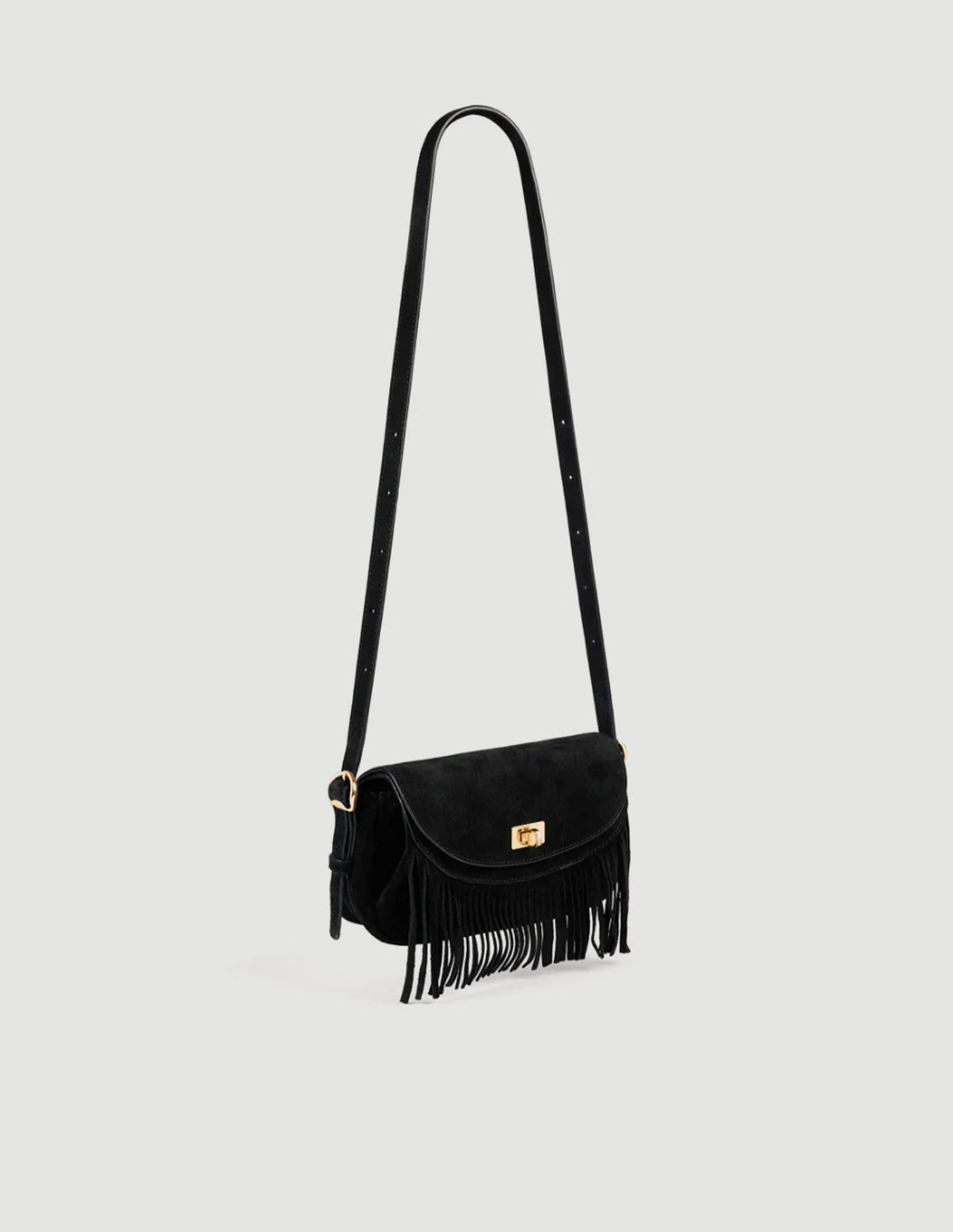 • LE MINI MAMBO bag in fringed suede, featuring a double flap with a swivel clasp and an adjustable shoulder strap for shoulder or crossbody wear.