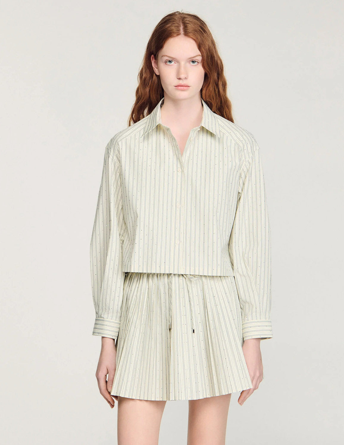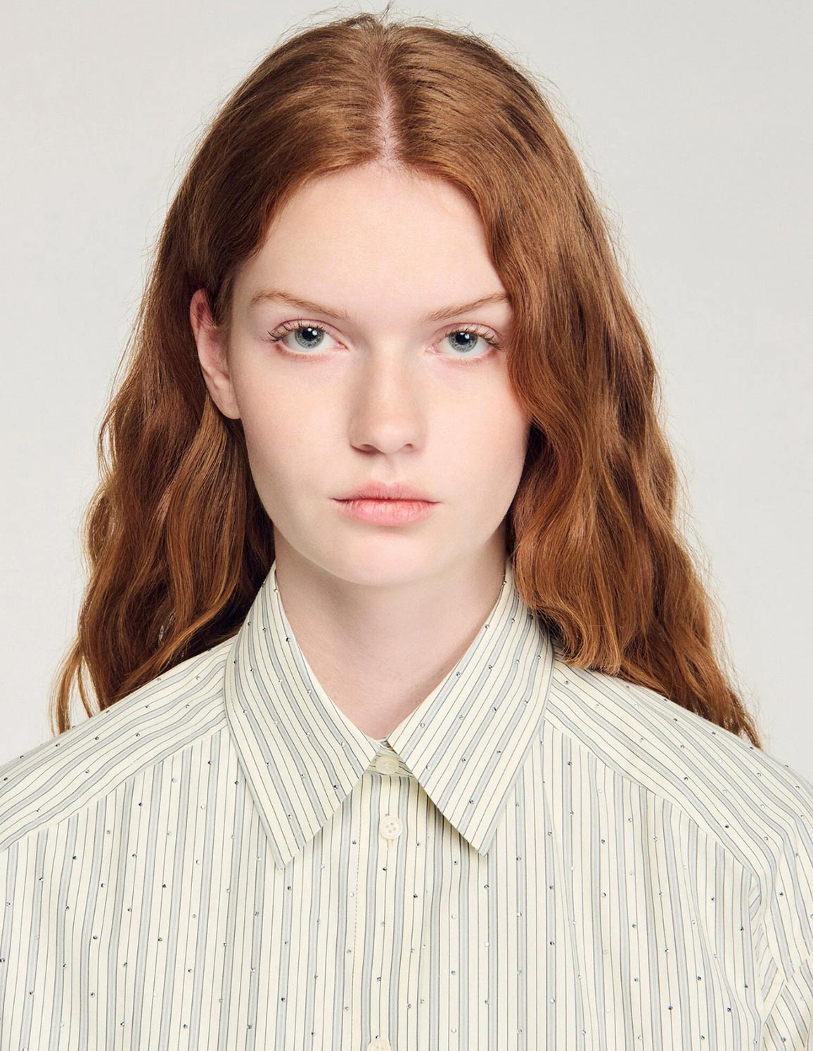 • Striped shirt embellished with rhinestones, featuring a shirt collar and long sleeves with buttoned cuffs.