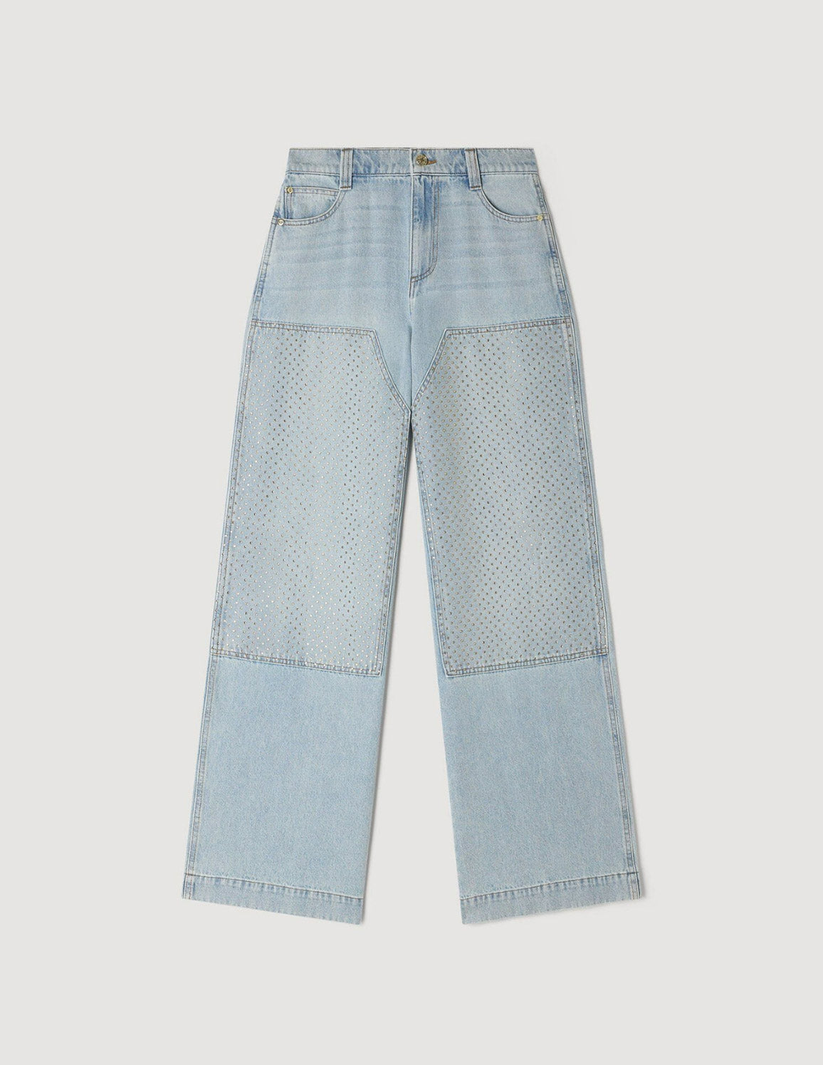 • Wide-leg, straight-leg jeans in faded cotton, embellished with a large rhinestone patch on the front and featuring a high waist.