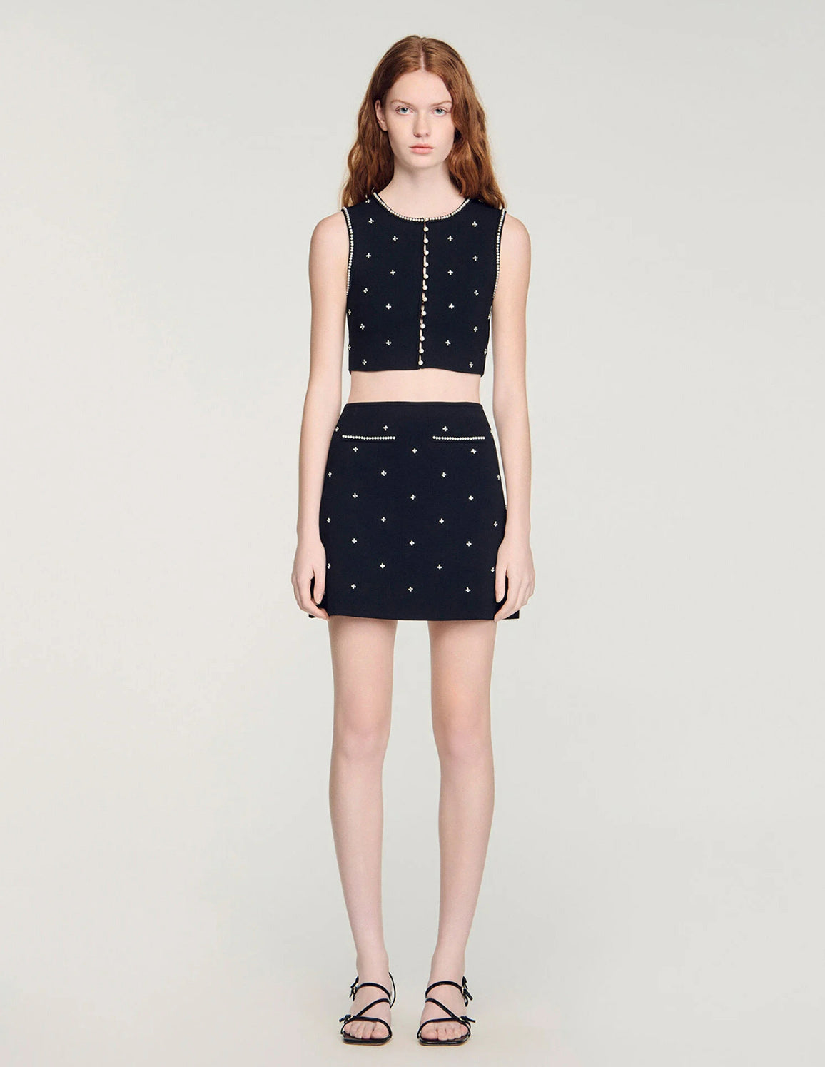 • Short straight-cut knit skirt embellished with embroidered rhinestones, with a high elasticated waist.