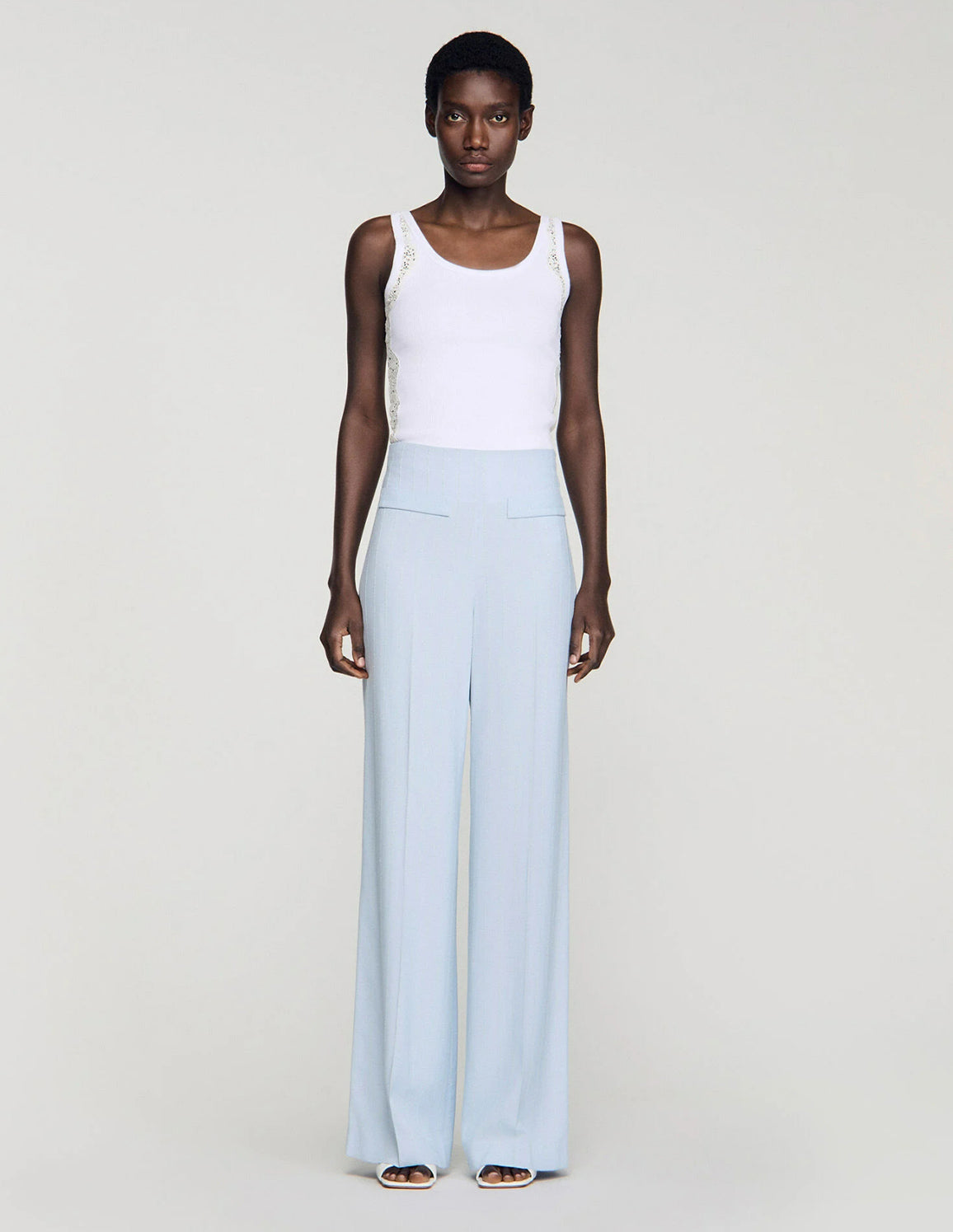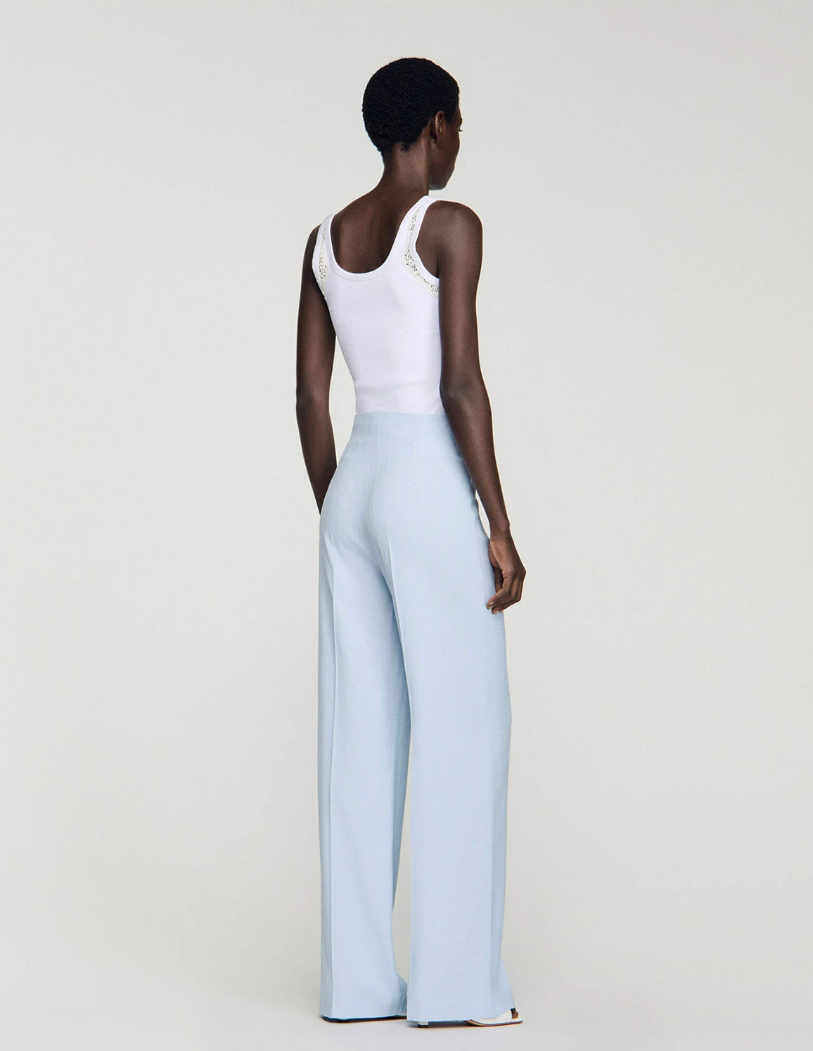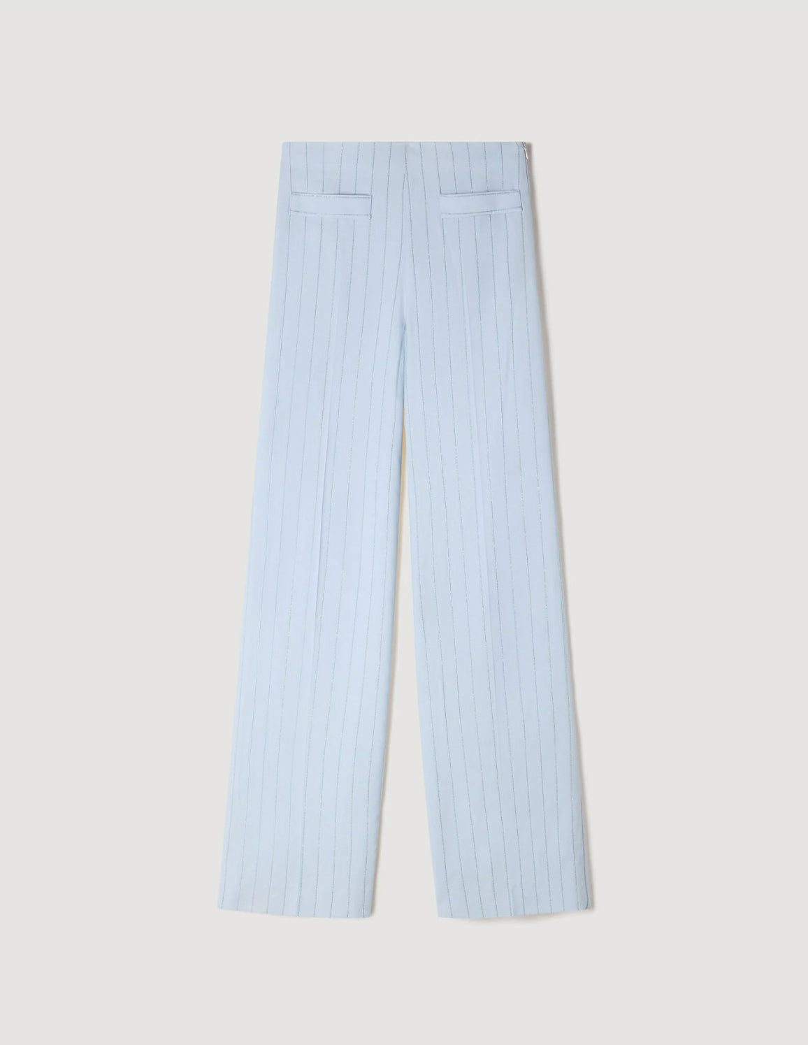 • Straight, wide-leg trousers with vertical stripes embellished with tone-on-tone sequins.