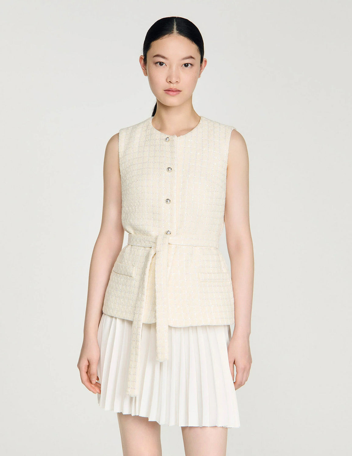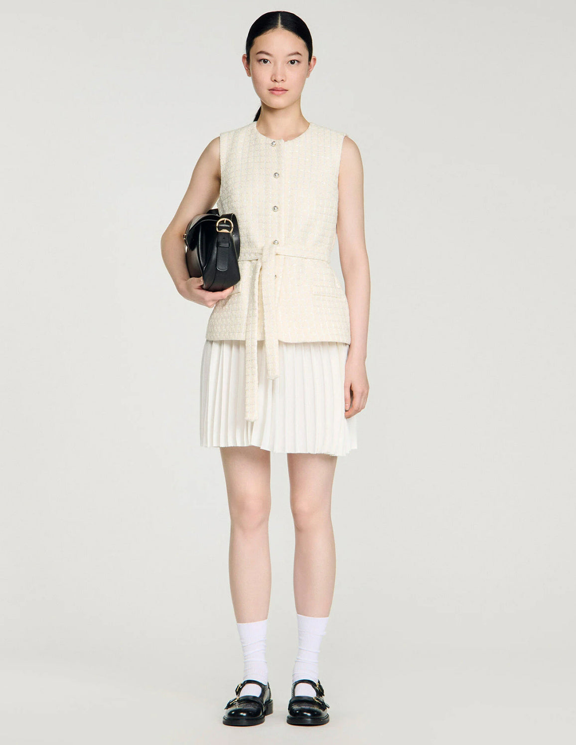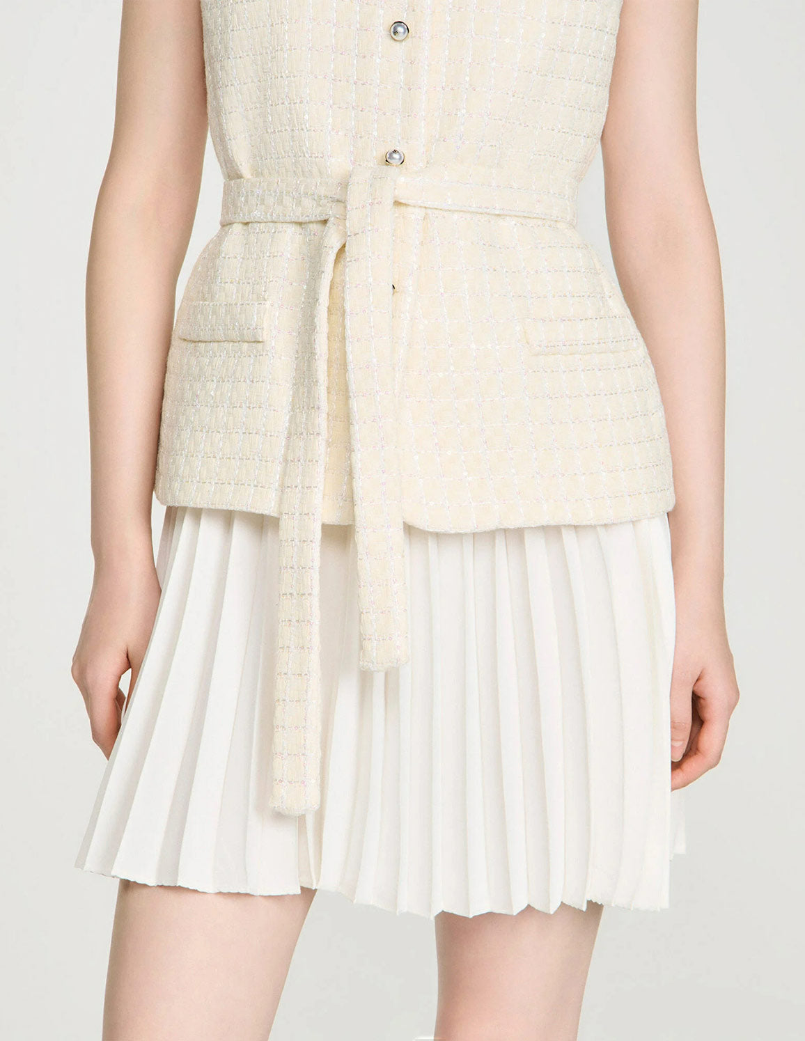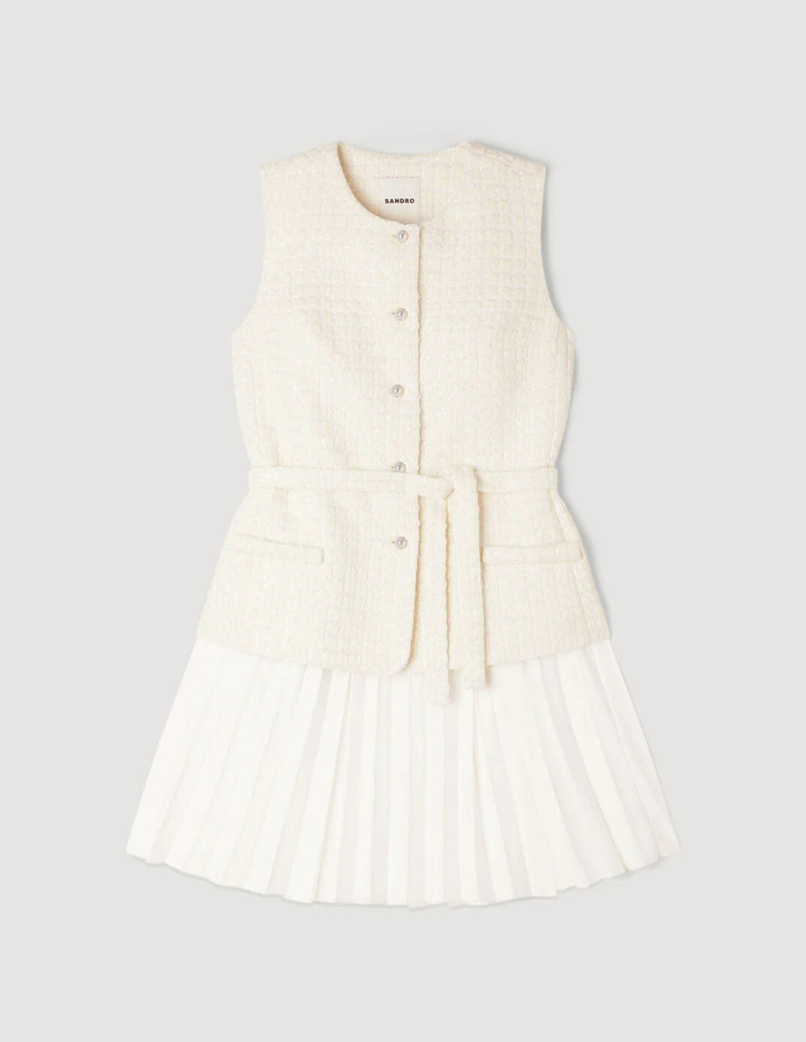 • Short dual-material dress with a belted, sequinned tweed top and a pleated skirt.
