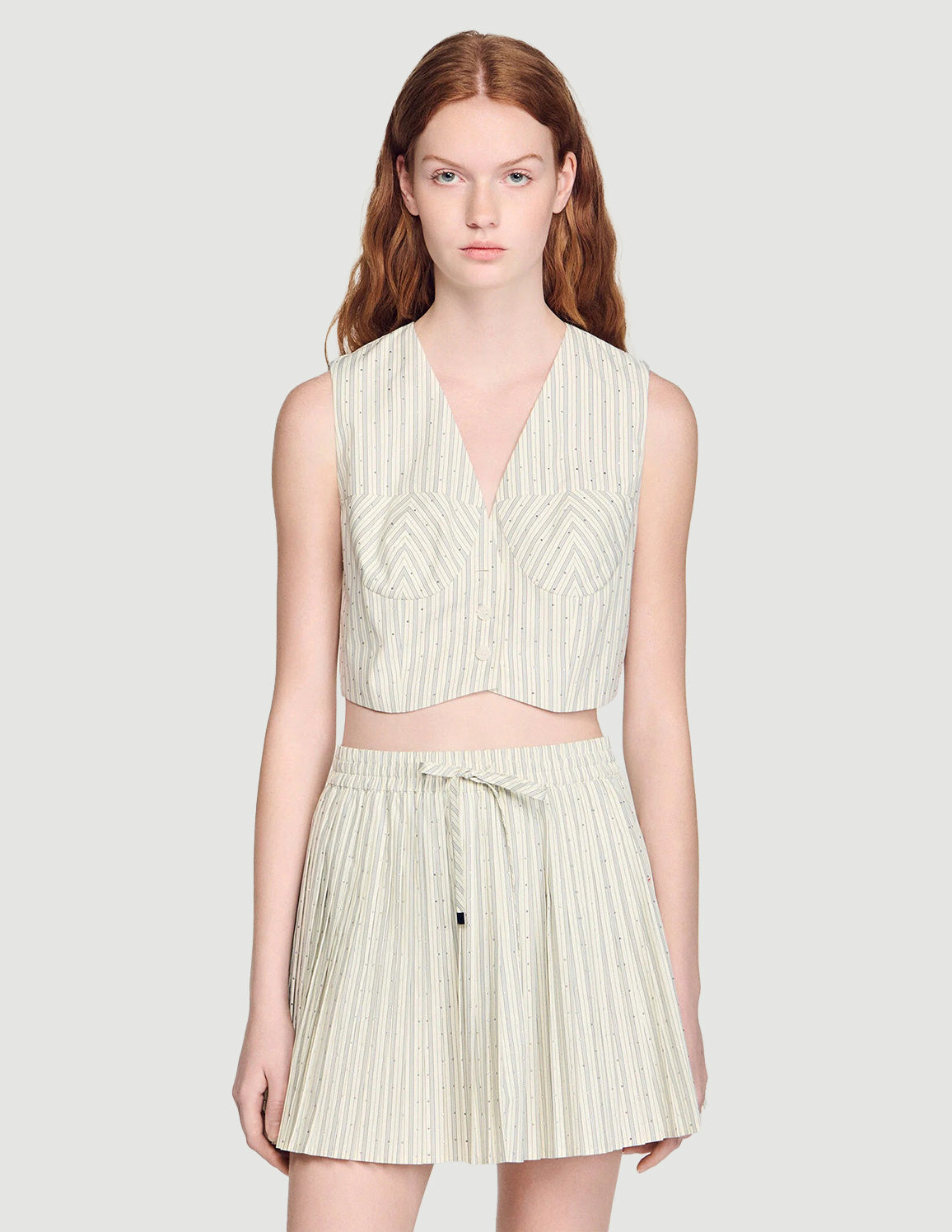 • Sleeveless, striped crop top with corset tailoring and rhinestone embellishment, featuring a V-neck and a button fastening at the front.