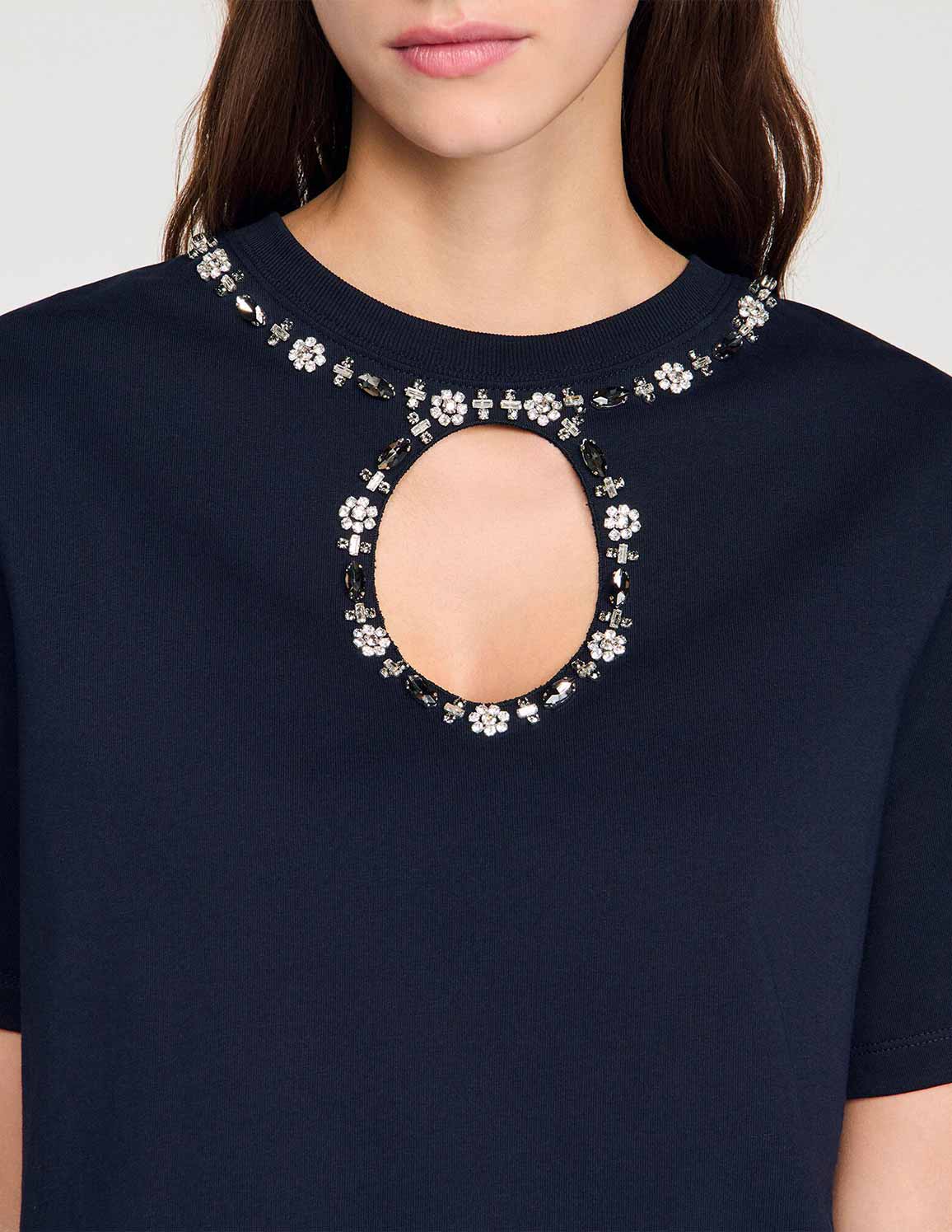 • Plain T-shirt with a round neck and short sleeves, adorned with a rhinestone trim and a cutout on the front.