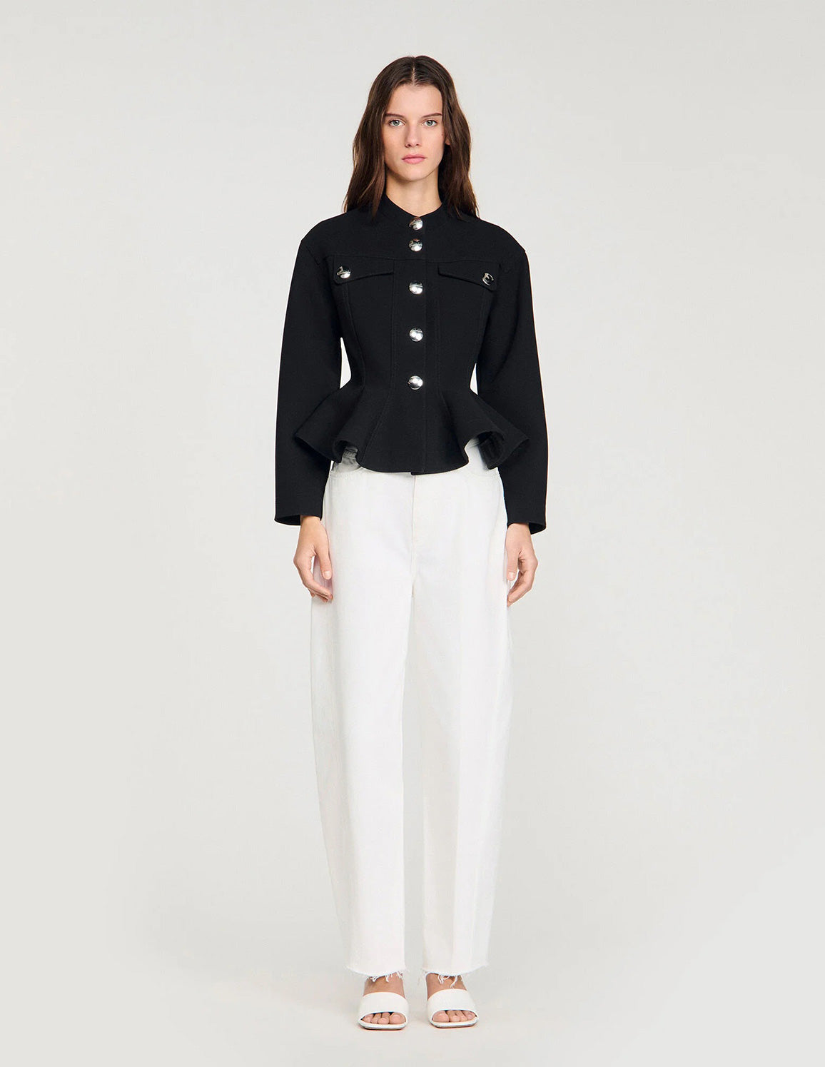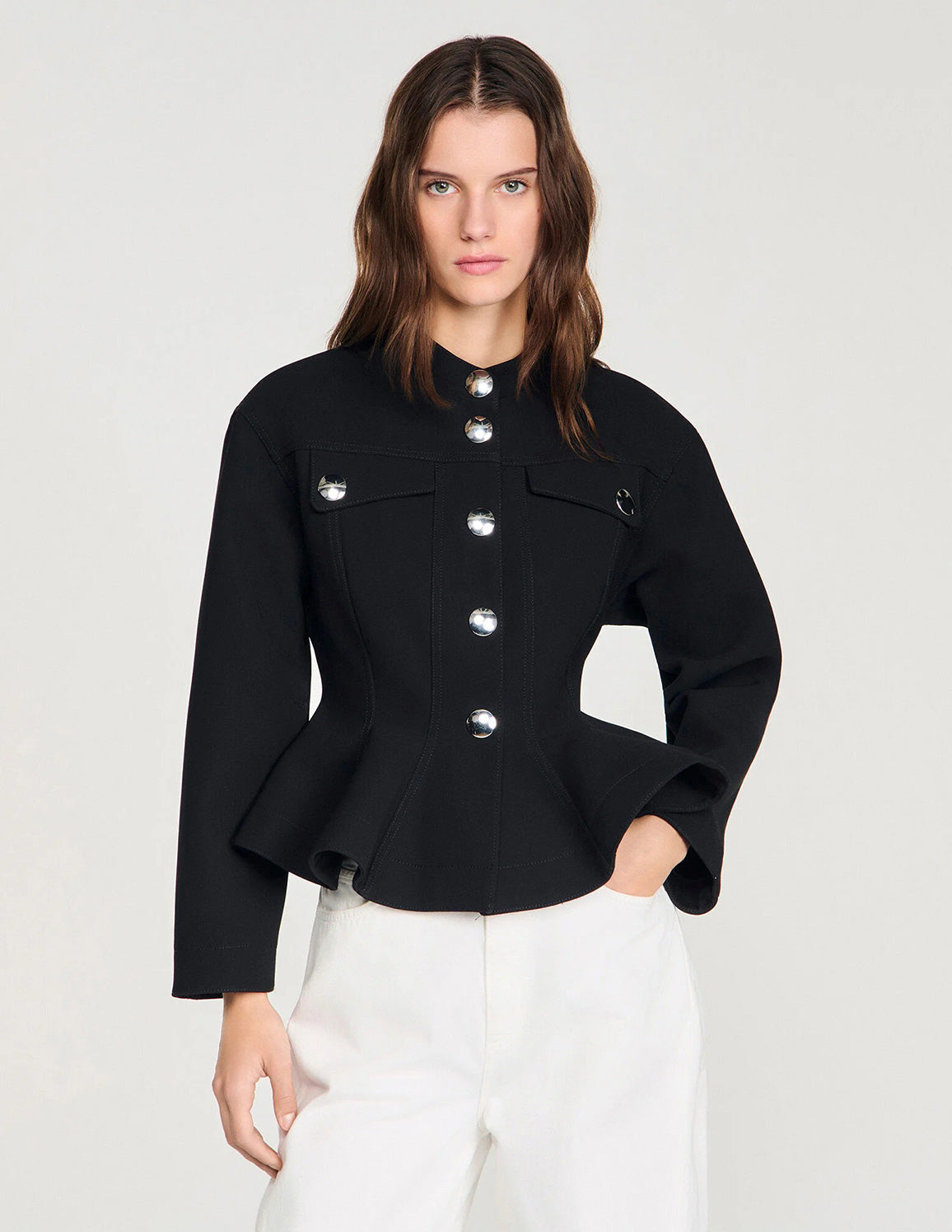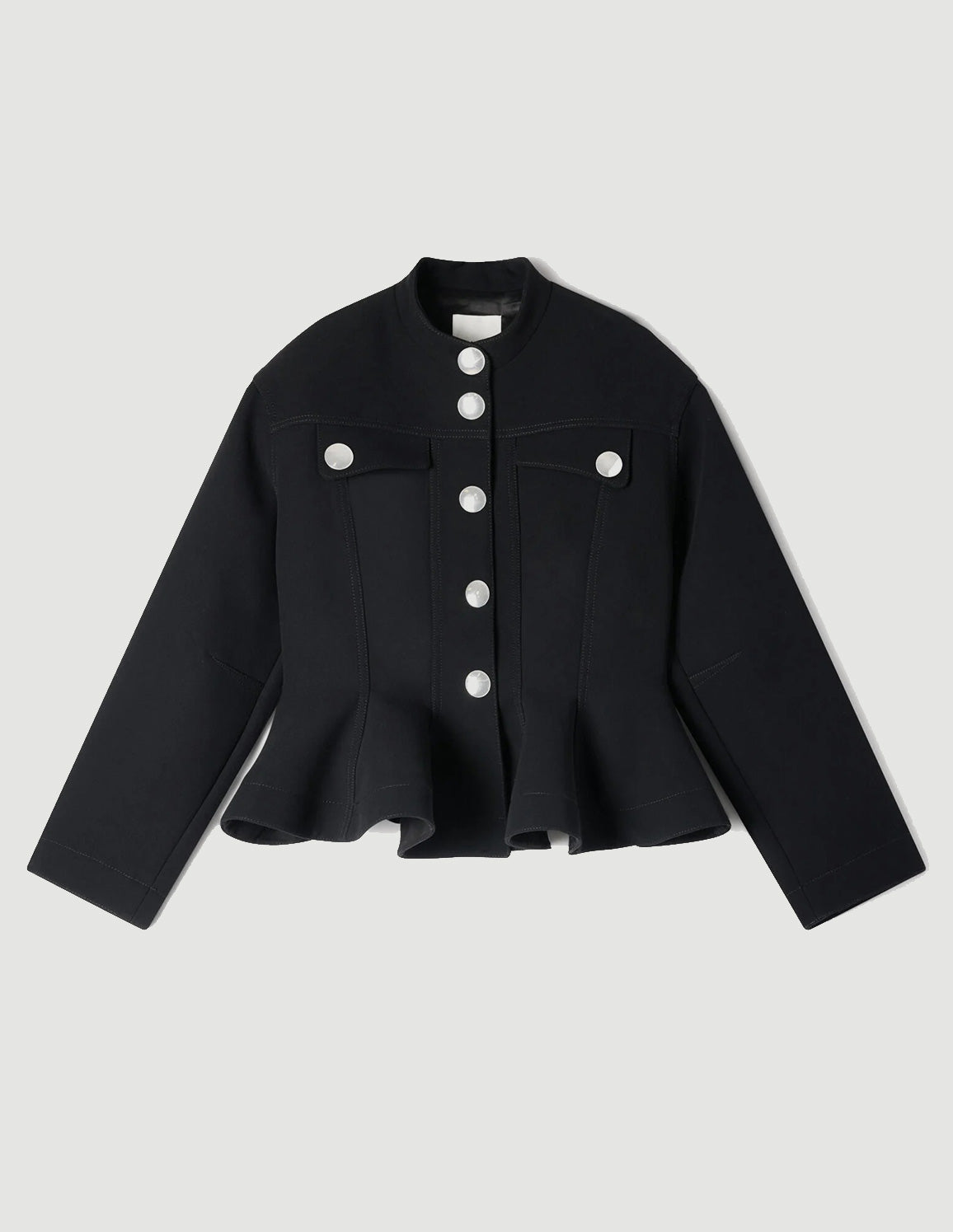 • Short, fitted jacket with a ruffled peplum, featuring an officer collar, long sleeves, a press-stud fastening, and chest pockets.